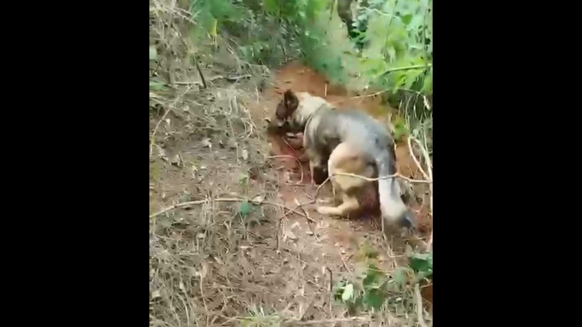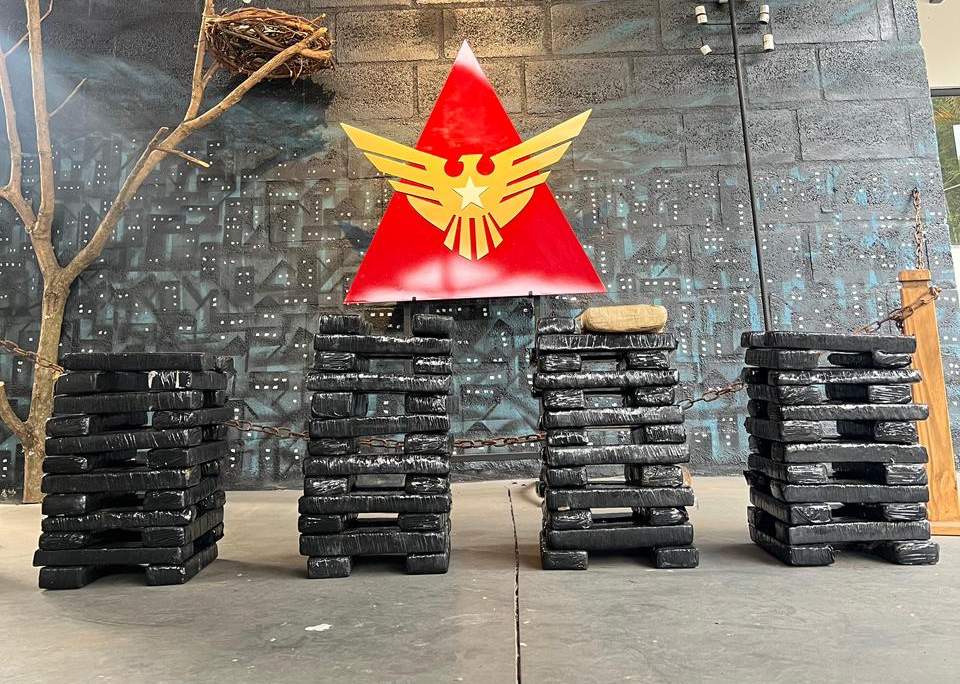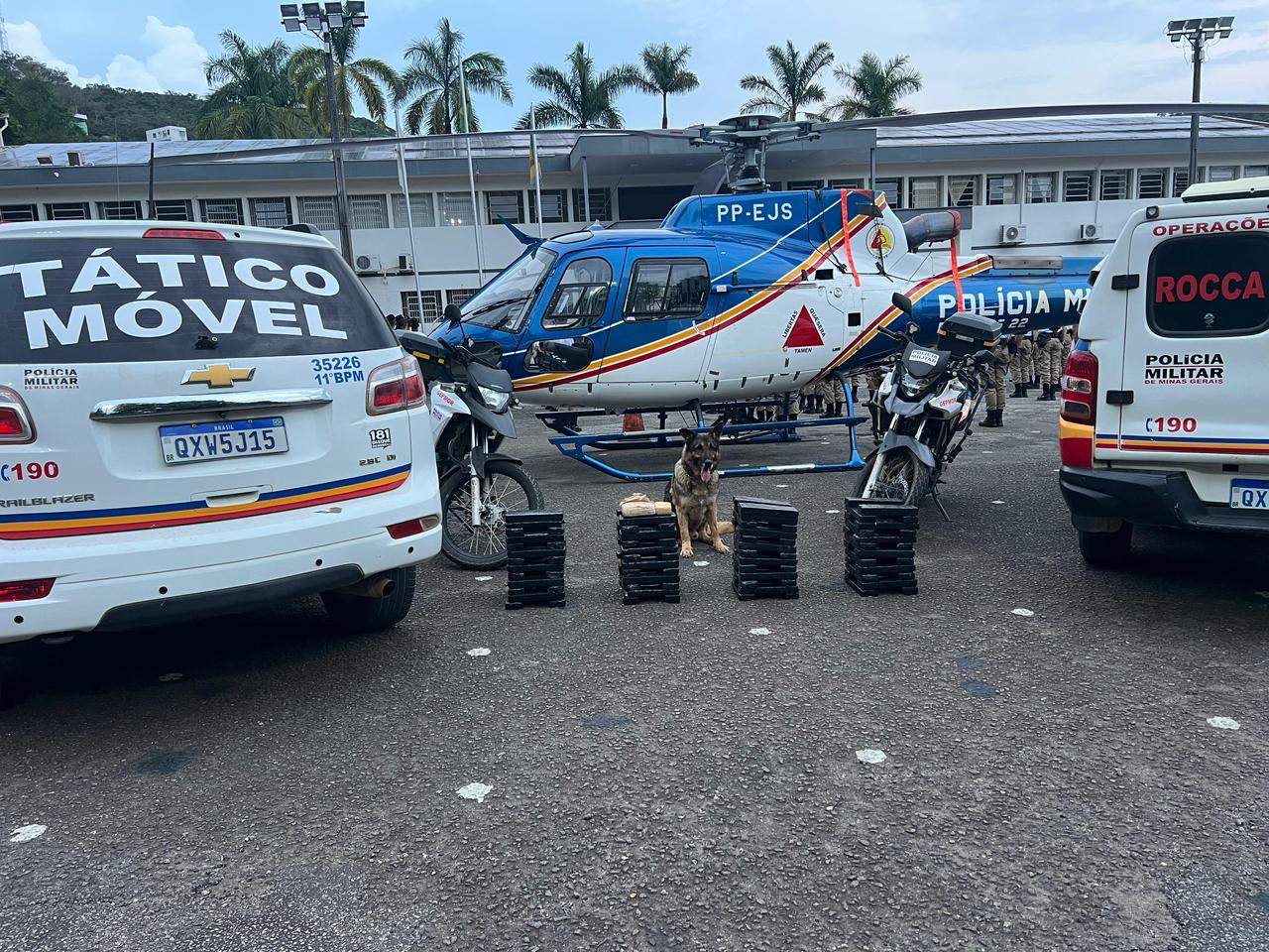 O material estava enterrado em área de mata e foi descoberto com o apoio do cão de faro, ampliando a capacidade de varredura e localização de entorpecentes.