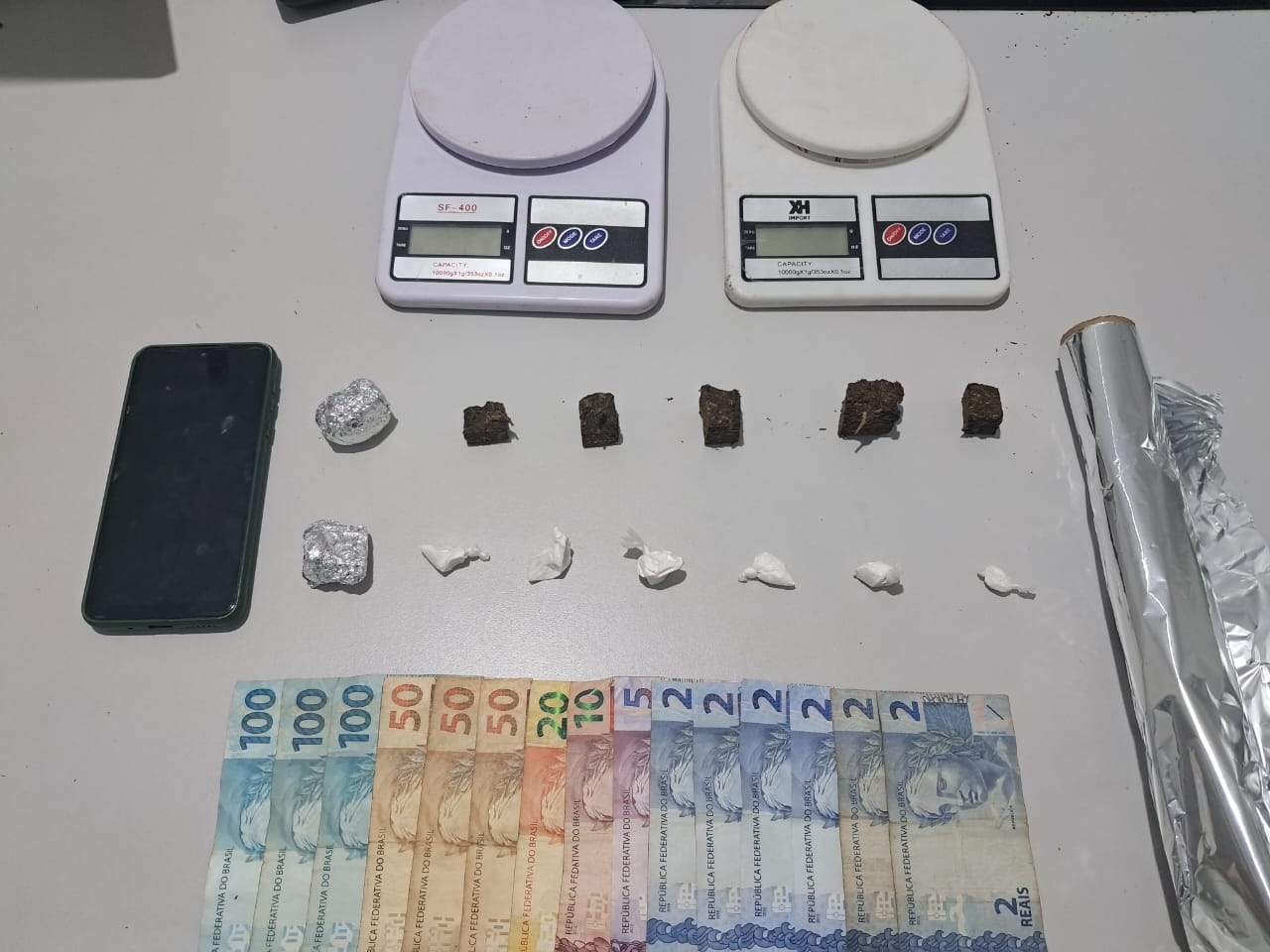 Dando prosseguimento à ocorrência, a Polícia Militar se dirigiu ao imóvel e conseguiu acesso ao interior, onde localizou no quarto do autor 7 tabletes de maconha, 6 papelotes de cocaína, 2 balanças de precisão, 1 telefone celular, 1 rolo de papel alumínio e R$ 497,00 em dinheiro. No bolso de sua bermuda, foi encontrada uma nota de vinte reais separada do restante do dinheiro.