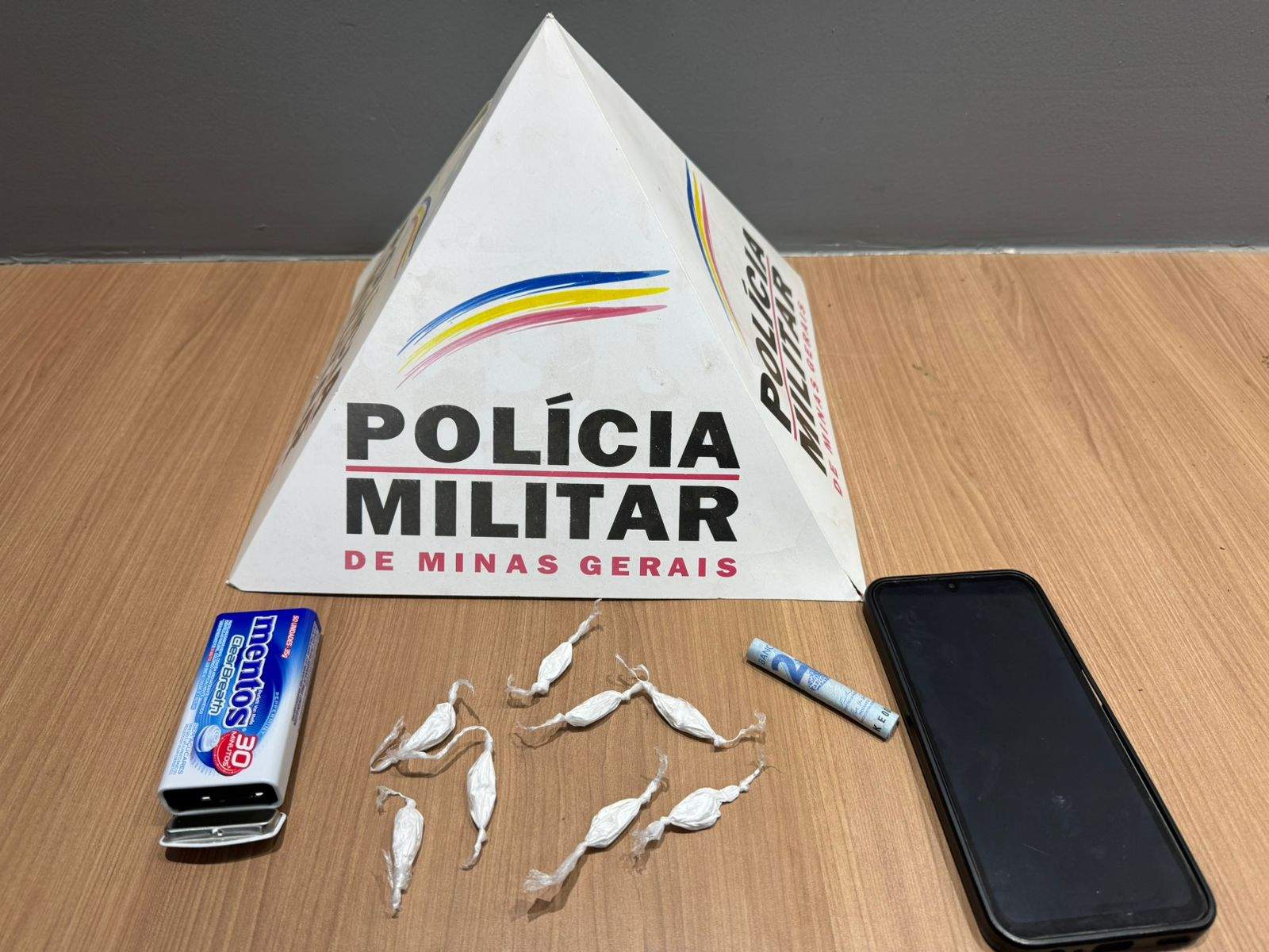 Ato contínuo, a Polícia Militar se dirigiu ao local e abordou o indivíduo. Em busca pessoal, foram encontrados com ele 8 papelotes de substância semelhante à cocaína, 1 celular Samsung e R$ 2,00 em espécie.