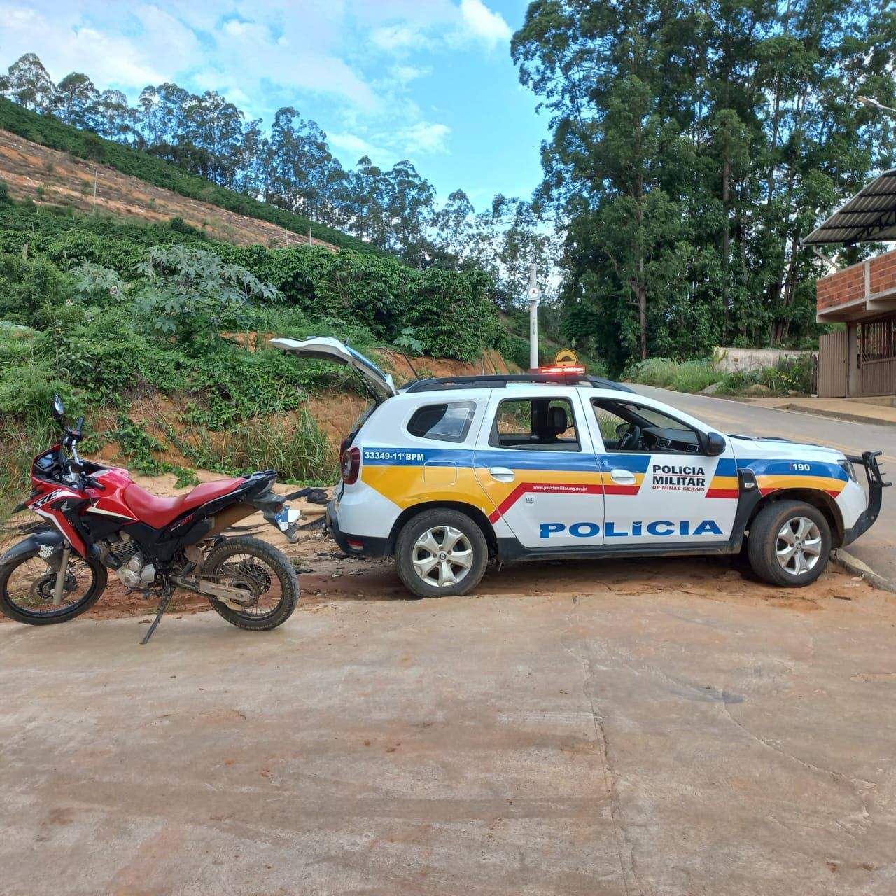 Durante o patrulhamento, a equipe localizou uma motocicleta Honda/XRE 300,vermelha, com a placa dobrada e caracteres parcialmente suprimidos, permitindo apenas