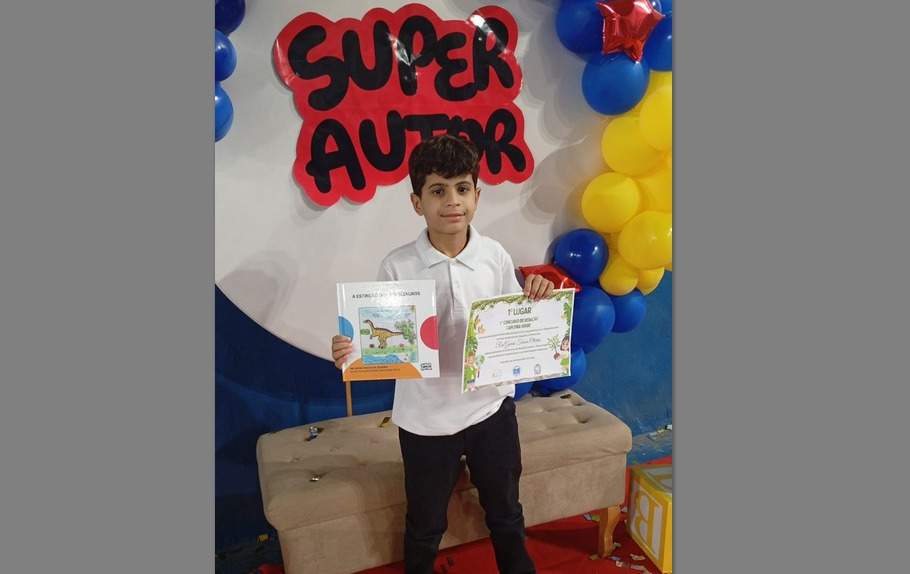 Raí também participou do lançamento do seu livro no projeto Super Autor. O tema foi a extinção dos dinossauros, com orientação da professora Suellen Alves Dutra.