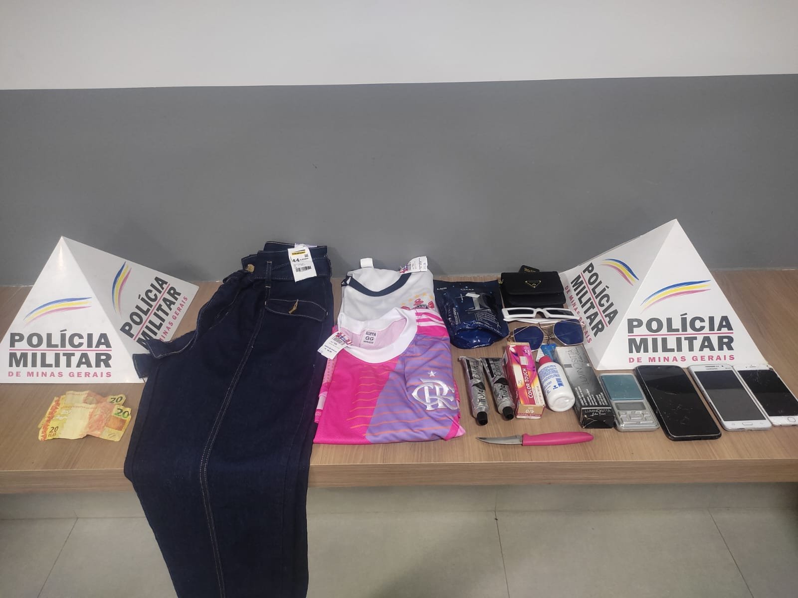 Durante buscas no local, às margens da rodovia, os policiais encontraram produtos furtados, entre eles uma calça jeans, duas camisas, seis itens de cosméticos, dois pares de óculos e uma bolsa, além de outros materiais. Também foram apreendidos R$ 40, três celulares, uma faca e uma balança de precisão.