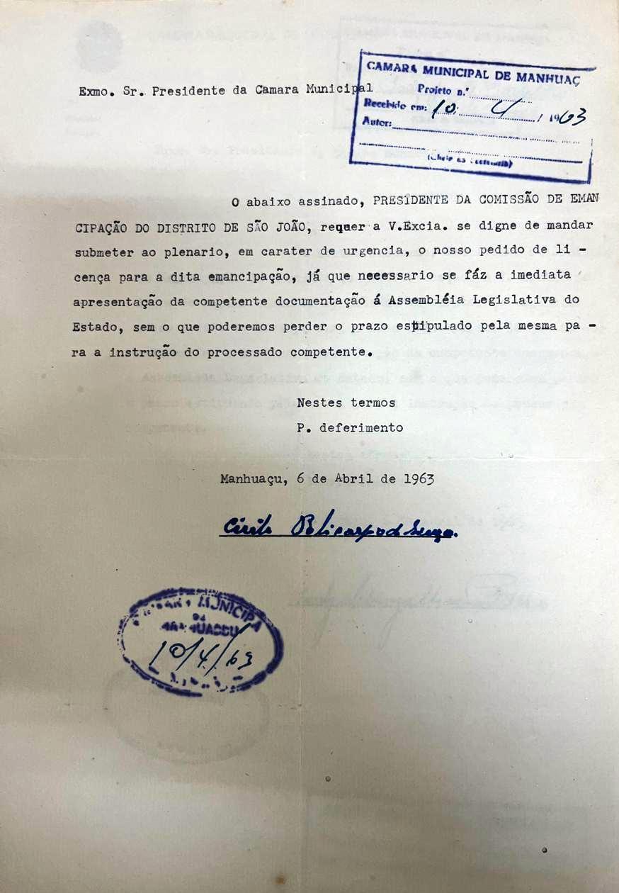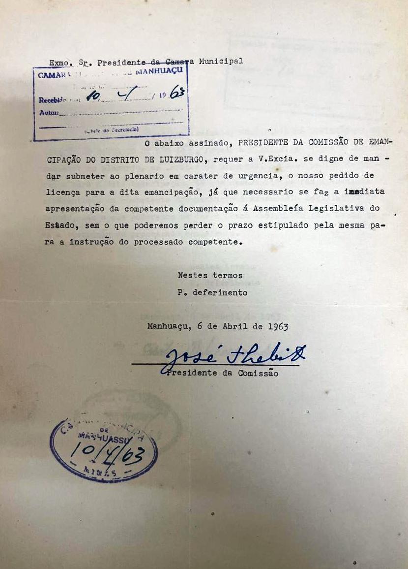 MANHUAÇU (MG) - Durante as últimas semanas, o projeto “Revivendo a História”, da Escola do Legislativo da Câmara de Manhuaçu, vem resgatando documentos que ajudam a manter viva a memória do poder legislativo municipal. Em mais um capítulo desta série histórica, o projeto revela agora um conjunto de documentos datados de abril de 1963 que revela parte do processo de solicitação de emancipação dos distritos de Luizburgo (na época o nome da localidade era grafado com “z”), São João do Manhuaçu e Reduto.