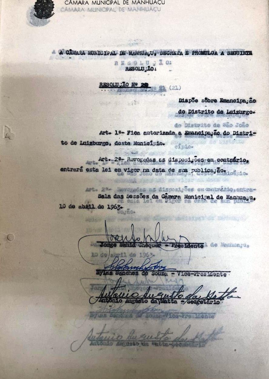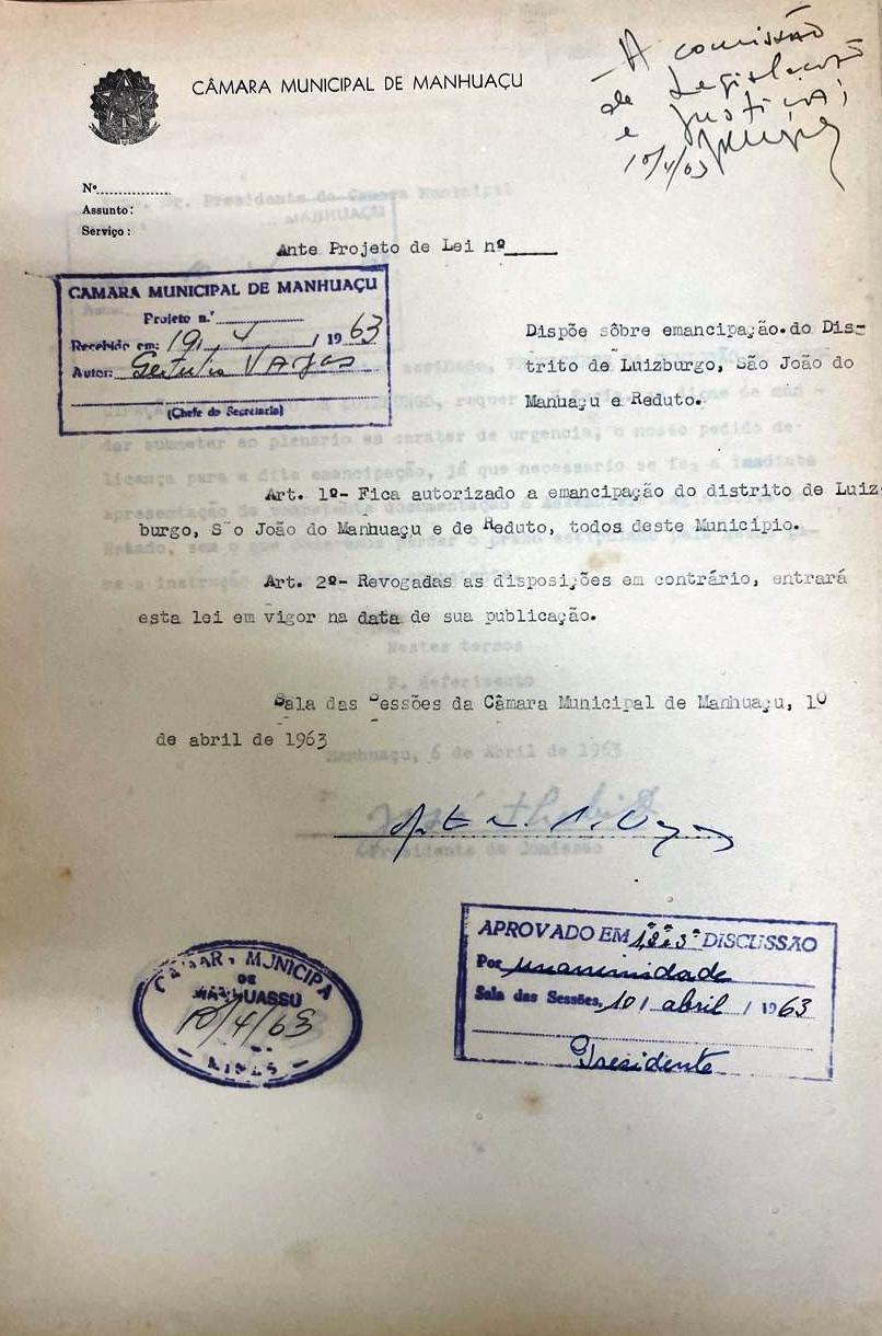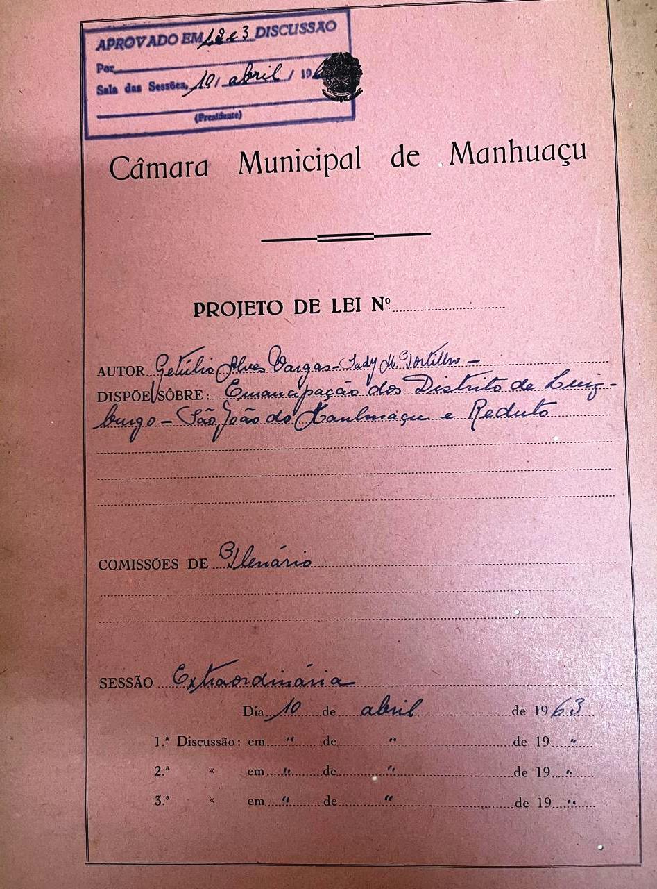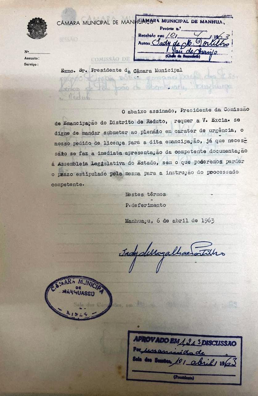 “O projeto foi apresentado pelo vereador Getúlio Alves Vargas, que encaminhou a proposta de autorização para que as comissões de cada distrito formalizassem, junto à Assembleia Legislativa de Minas Gerais, o pedido de licença para a emancipação. Os documentos mostram que, em 6 de abril de 1963, presidentes das comissões de cada distrito protocolaram, na Câmara Municipal, requerimentos solicitando “caráter de urgência” para o andamento da matéria, a fim de garantir o cumprimento dos prazos legais exigidos pelo Estado. Assinaram esses pedidos o presidente da Comissão de Emancipação de Luizburgo, José Thobias, o presidente da Comissão de Emancipação de São João de Manhuaçu, Cirilú Bilac de Souza, e o presidente da Comissão de Emancipação de Reduto, Sady de Magalhães Portilho”, destaca o professor João Paulo Andrade.