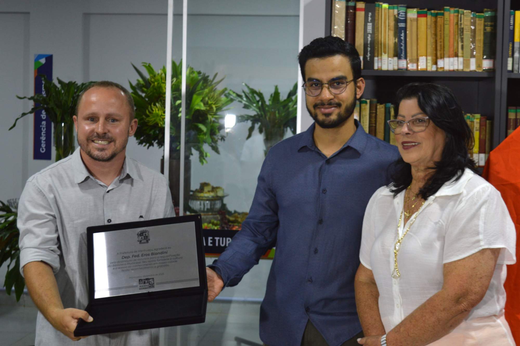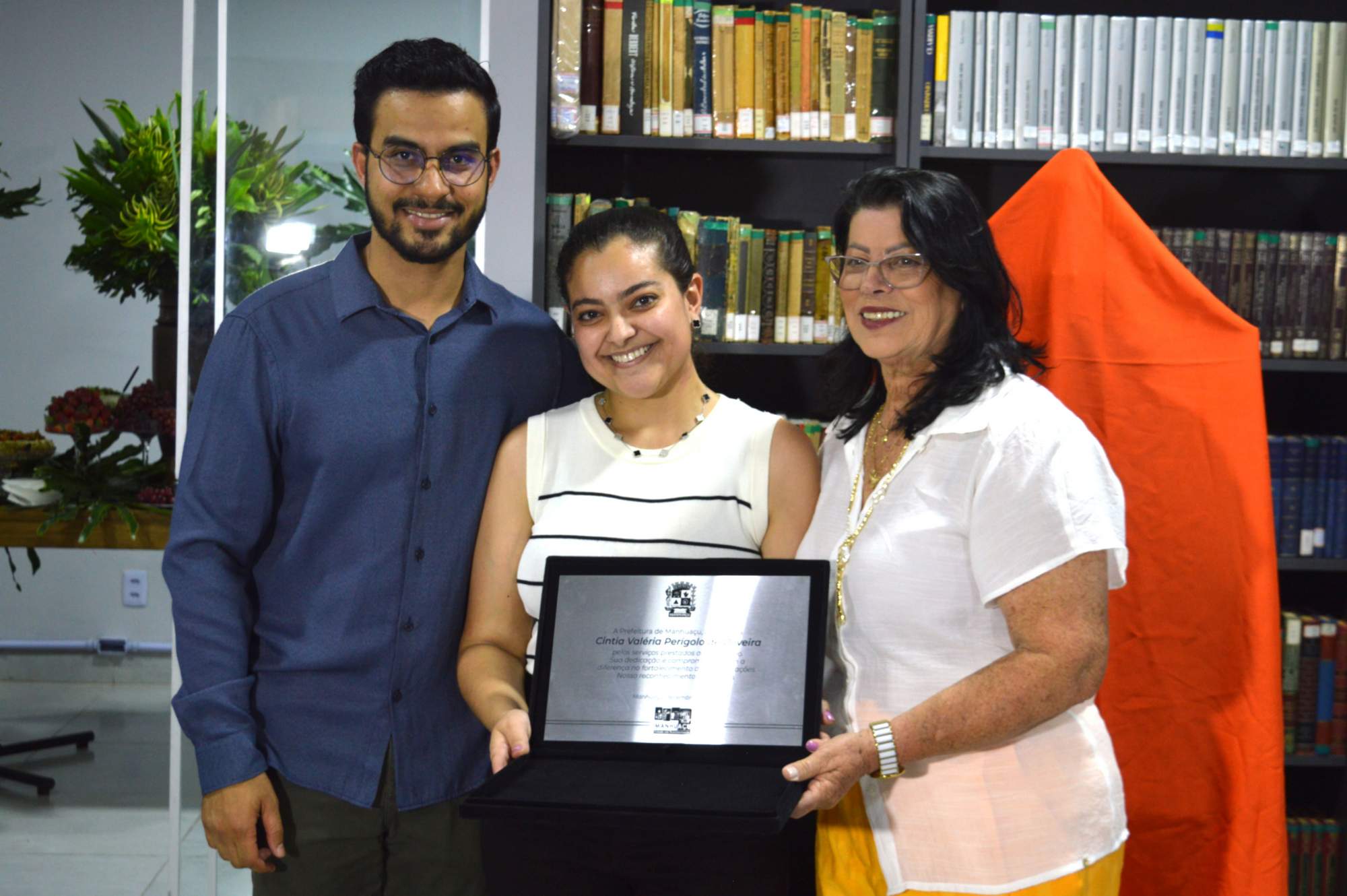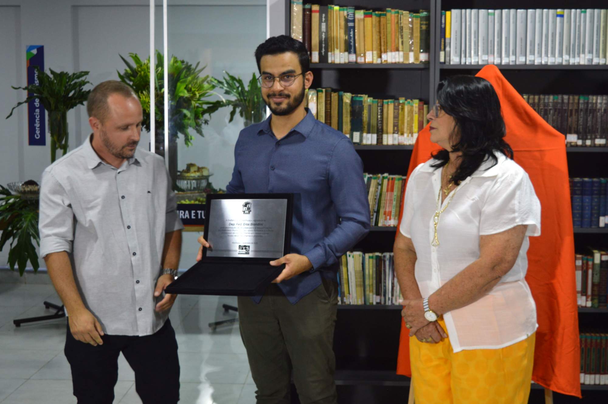 Idealizada pela querida Prof.ª Ilza Campos Sad, a Biblioteca Municipal carregará sempre o traço de sua visão e dedicação. Em reconhecimento a esse legado, a família recebeu uma homenagem simbólica da Prefeitura, com a entrega de uma placa de agradecimento. Também foram reconhecidos o deputado federal Eros Biondini, representado por Leandro Reis, pela destinação de recursos para a reforma; o voluntário Cleiton Coelho Gomes, por sua colaboração durante o processo; e a Secretária de Governo Cíntia Perígolo, uma das entusiastas da requalificação.