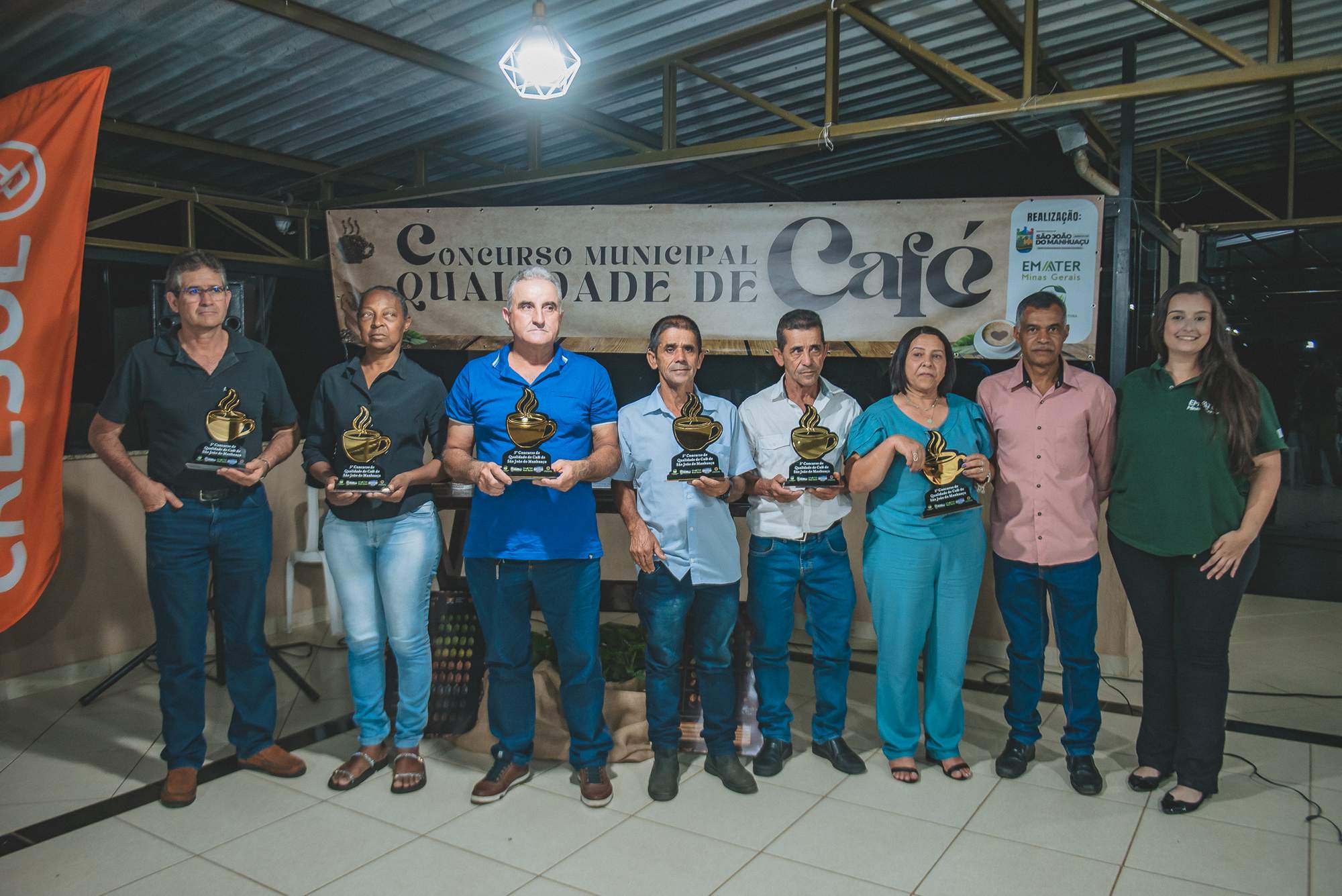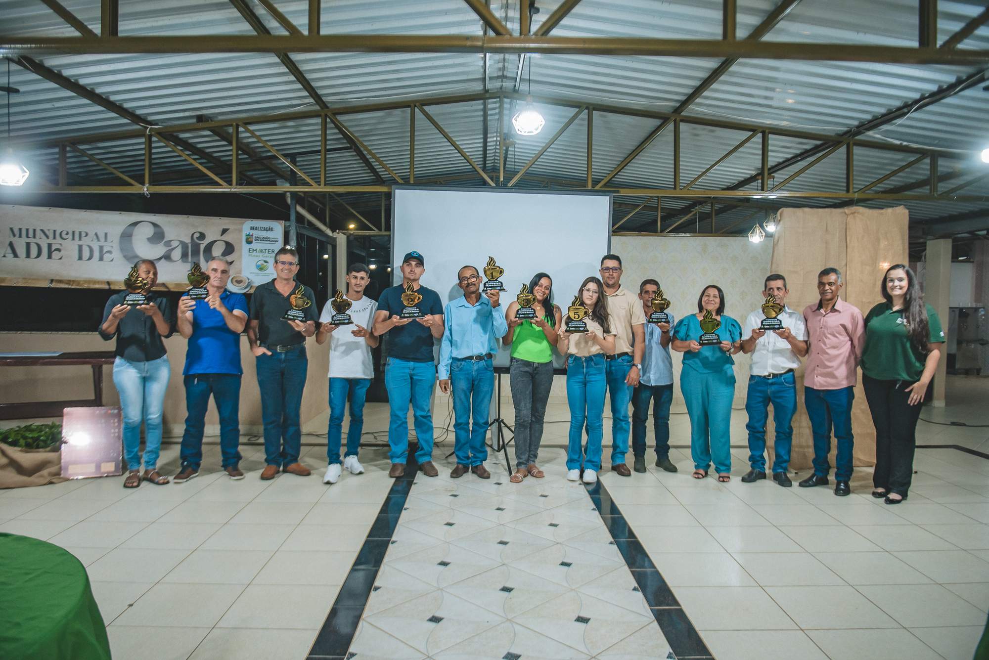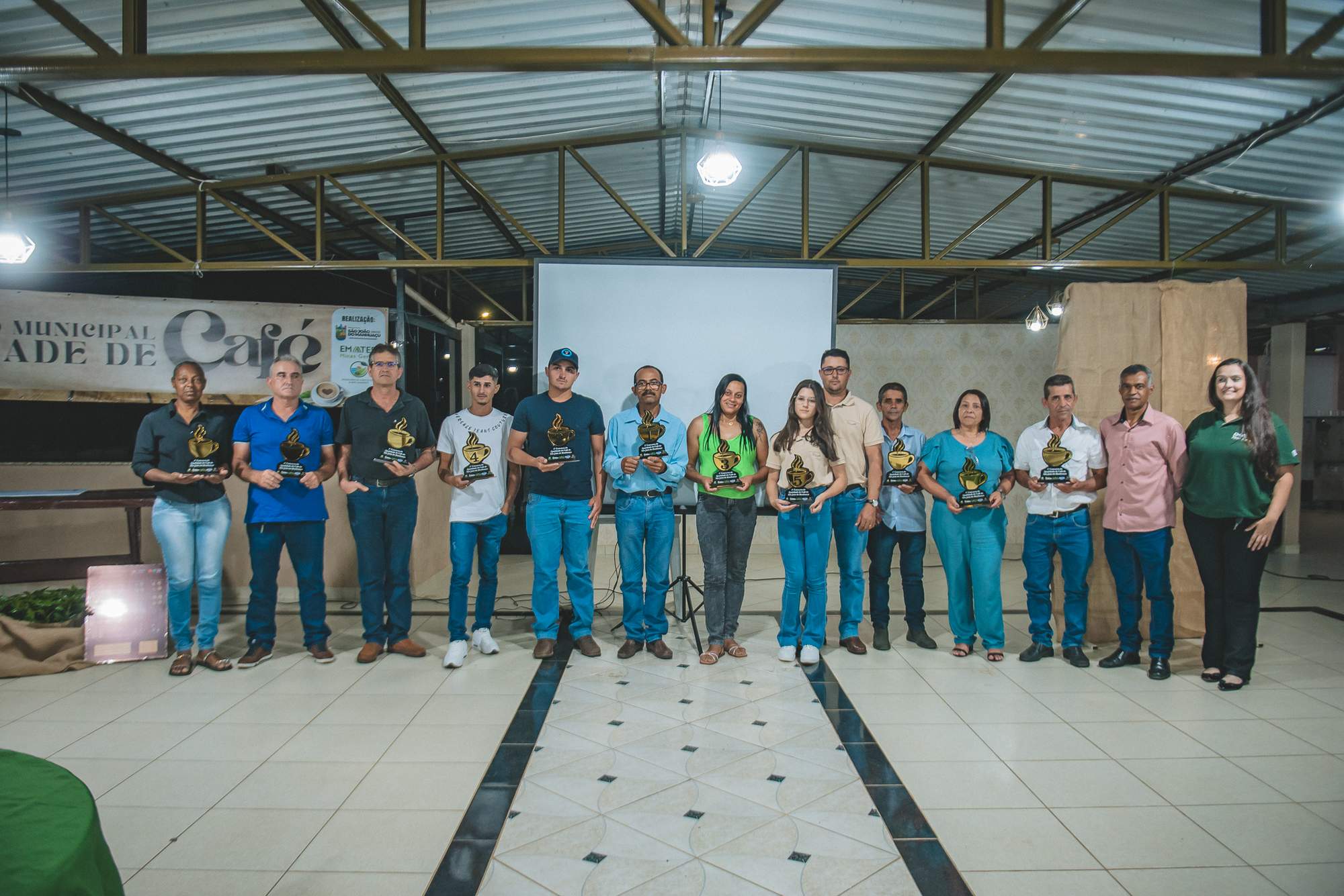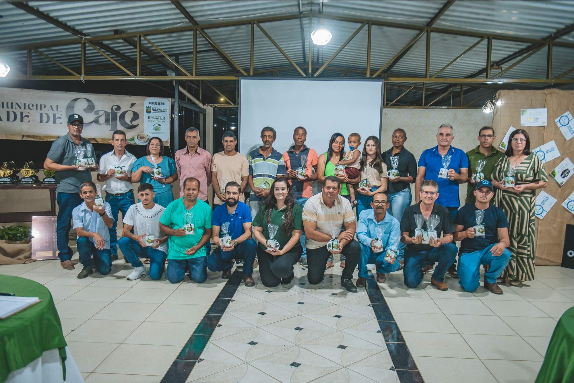 SÃO JOÃO DO MANHUAÇU (MG) - Produtores rurais de diversas comunidades participaram da cerimônia de premiação do 5º Concurso de Qualidade de Café de São João do Manhuaçu, realizada com apoio da Secretaria Municipal de Agricultura, Prefeitura de São João do Manhuaçu e Emater-MG. O evento reuniu autoridades locais, técnicos da Emater e representantes do setor cafeeiro.
