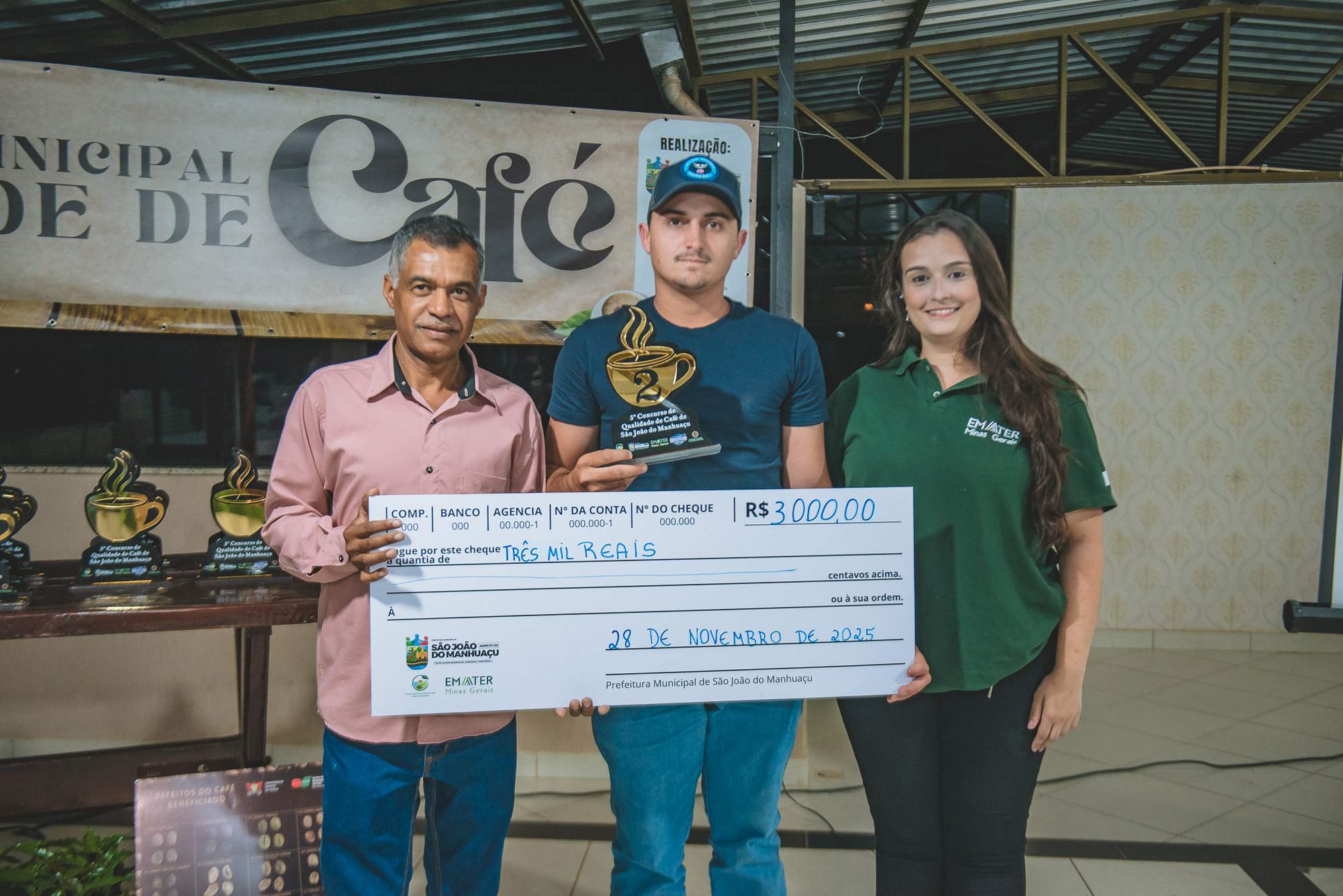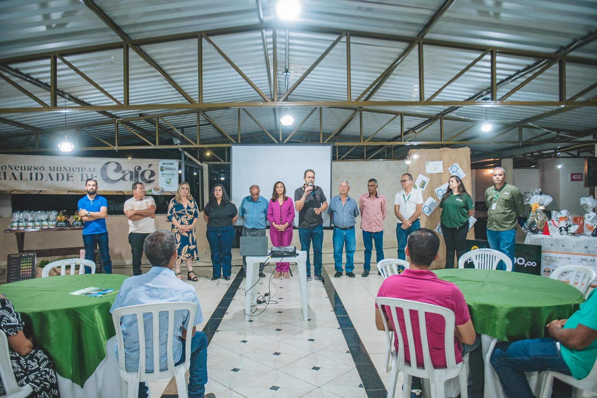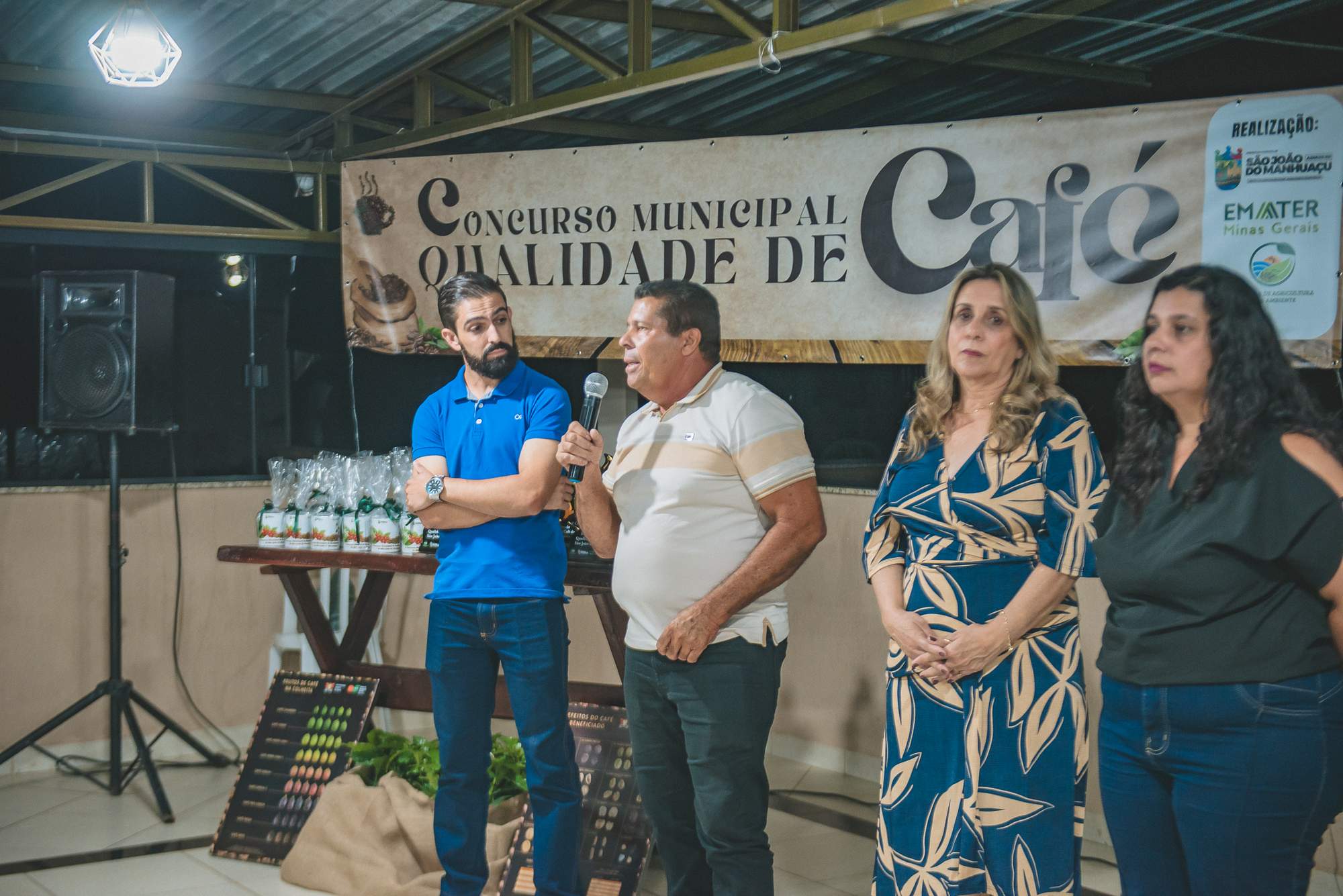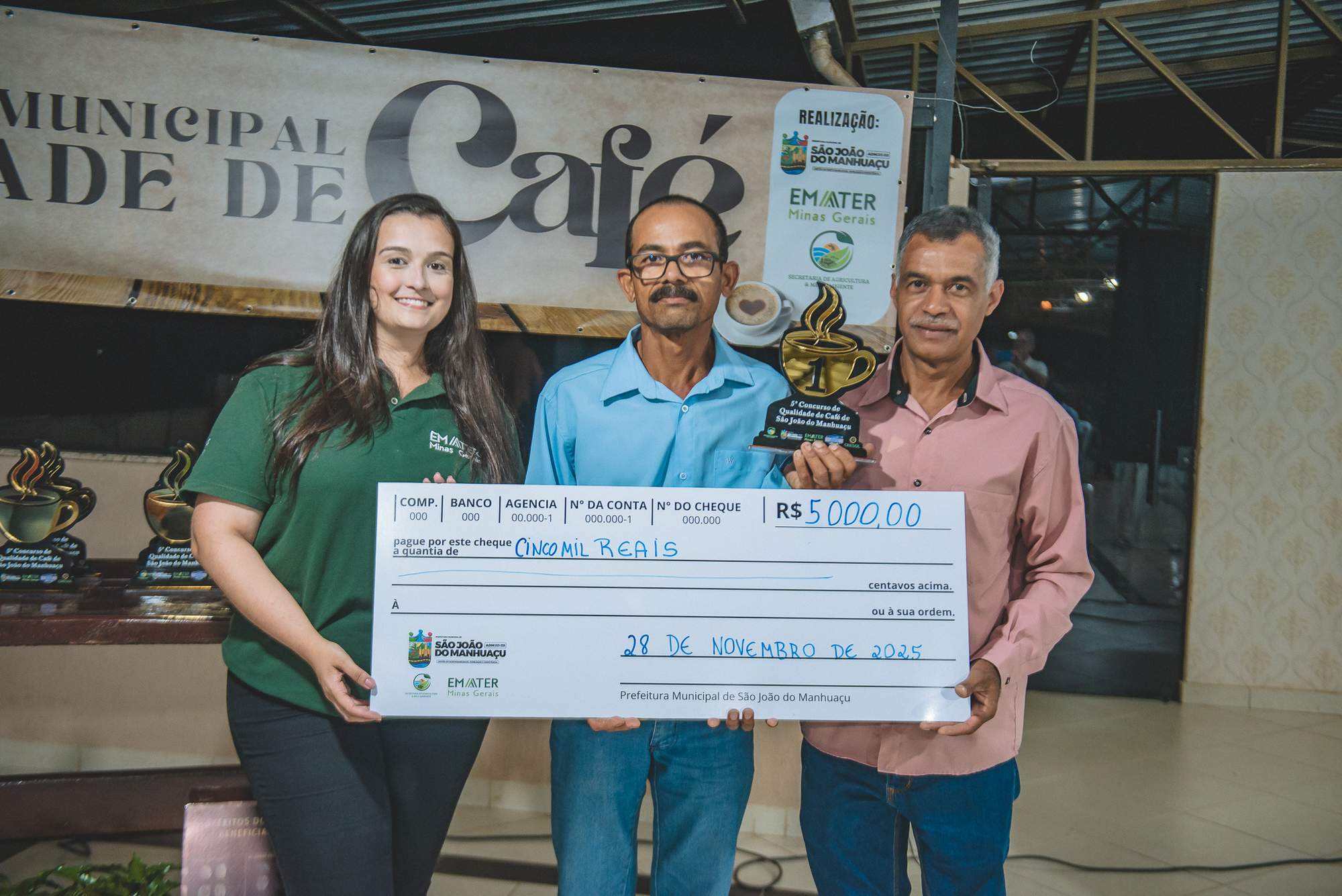 SÃO JOÃO DO MANHUAÇU (MG) - Produtores rurais de diversas comunidades participaram da cerimônia de premiação do 5º Concurso de Qualidade de Café de São João do Manhuaçu, realizada com apoio da Secretaria Municipal de Agricultura, Prefeitura de São João do Manhuaçu e Emater-MG. O evento reuniu autoridades locais, técnicos da Emater e representantes do setor cafeeiro.