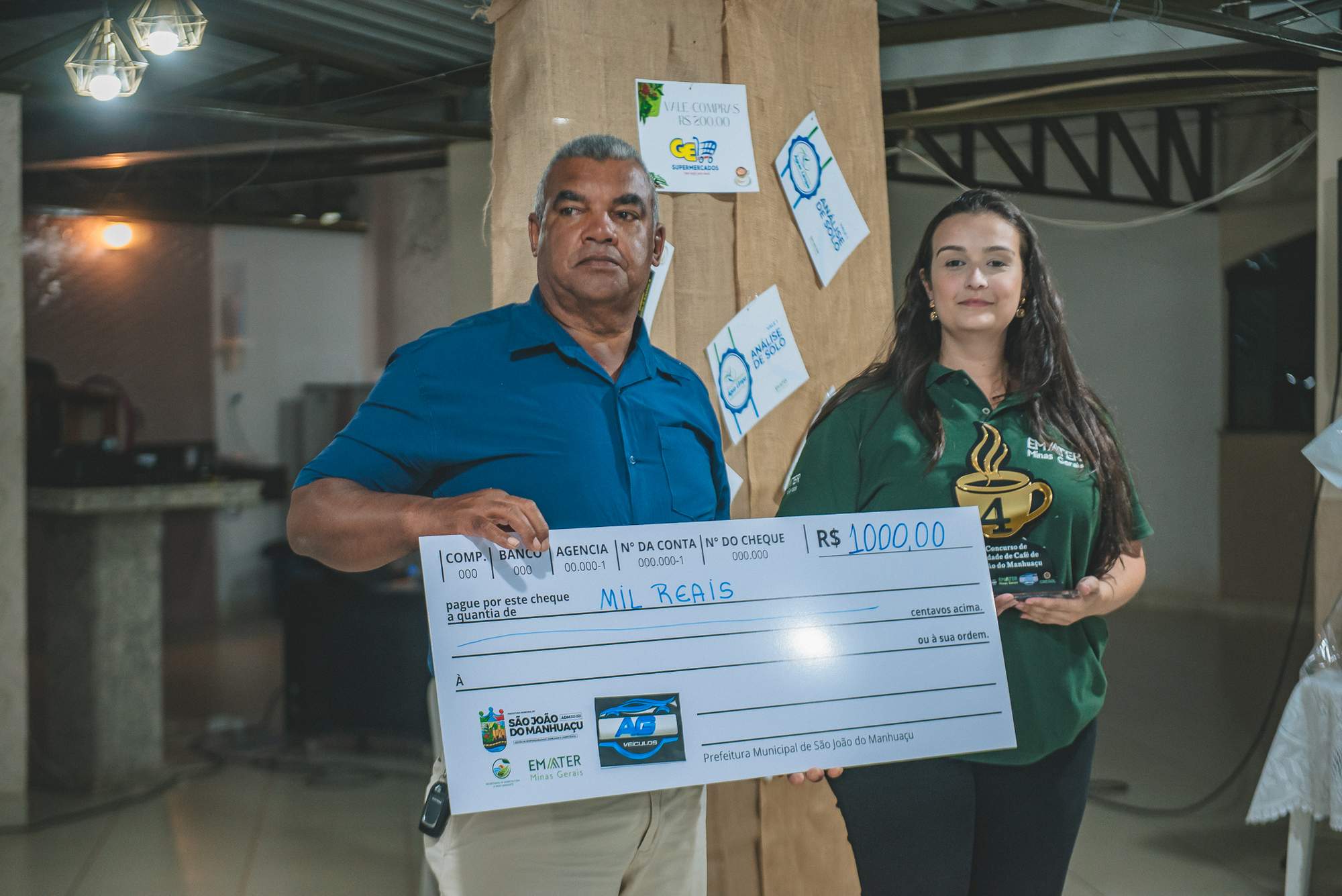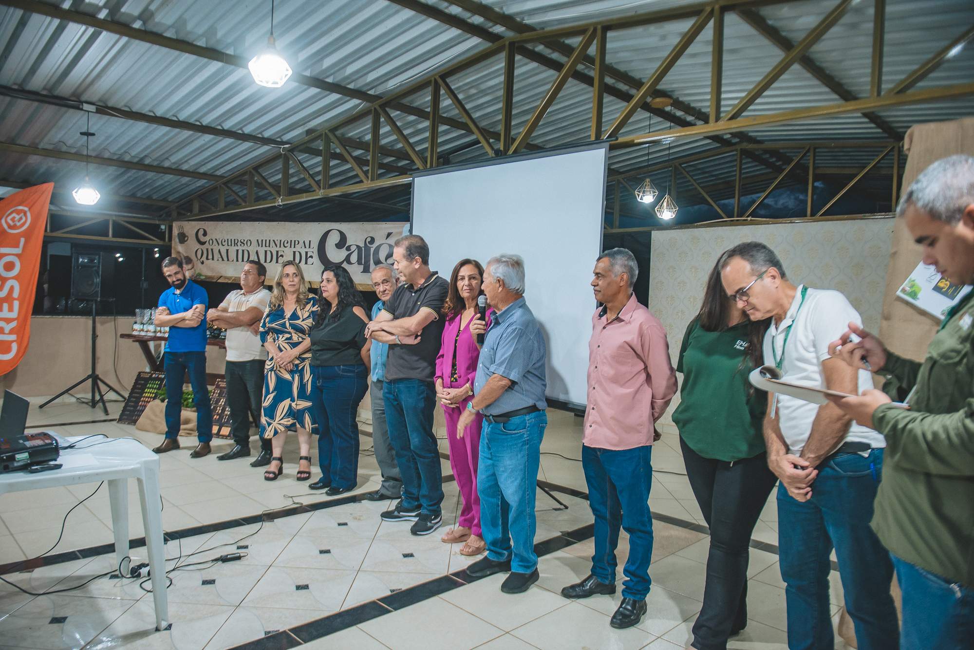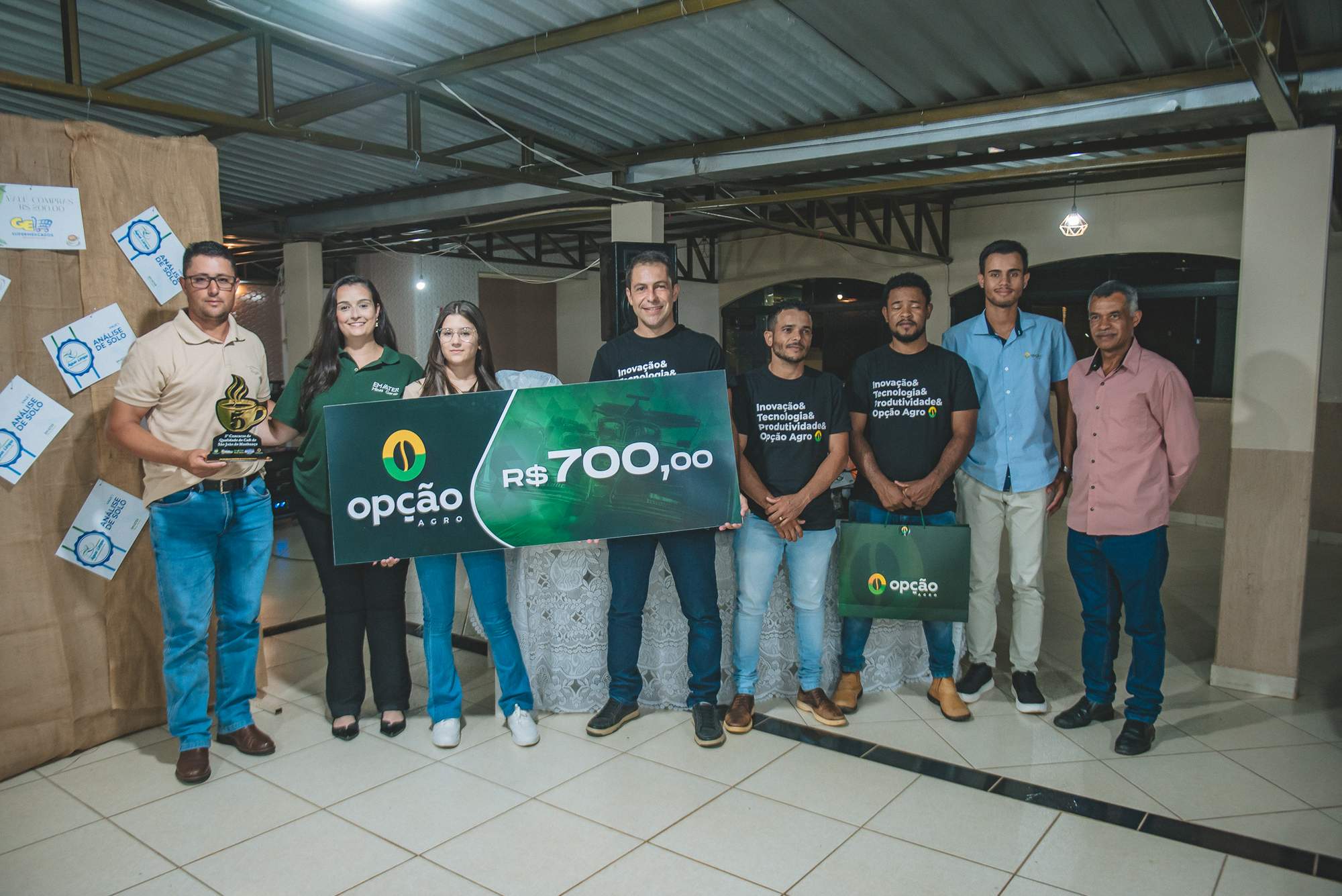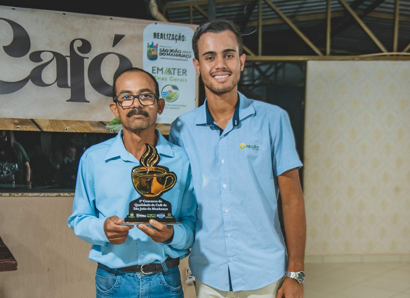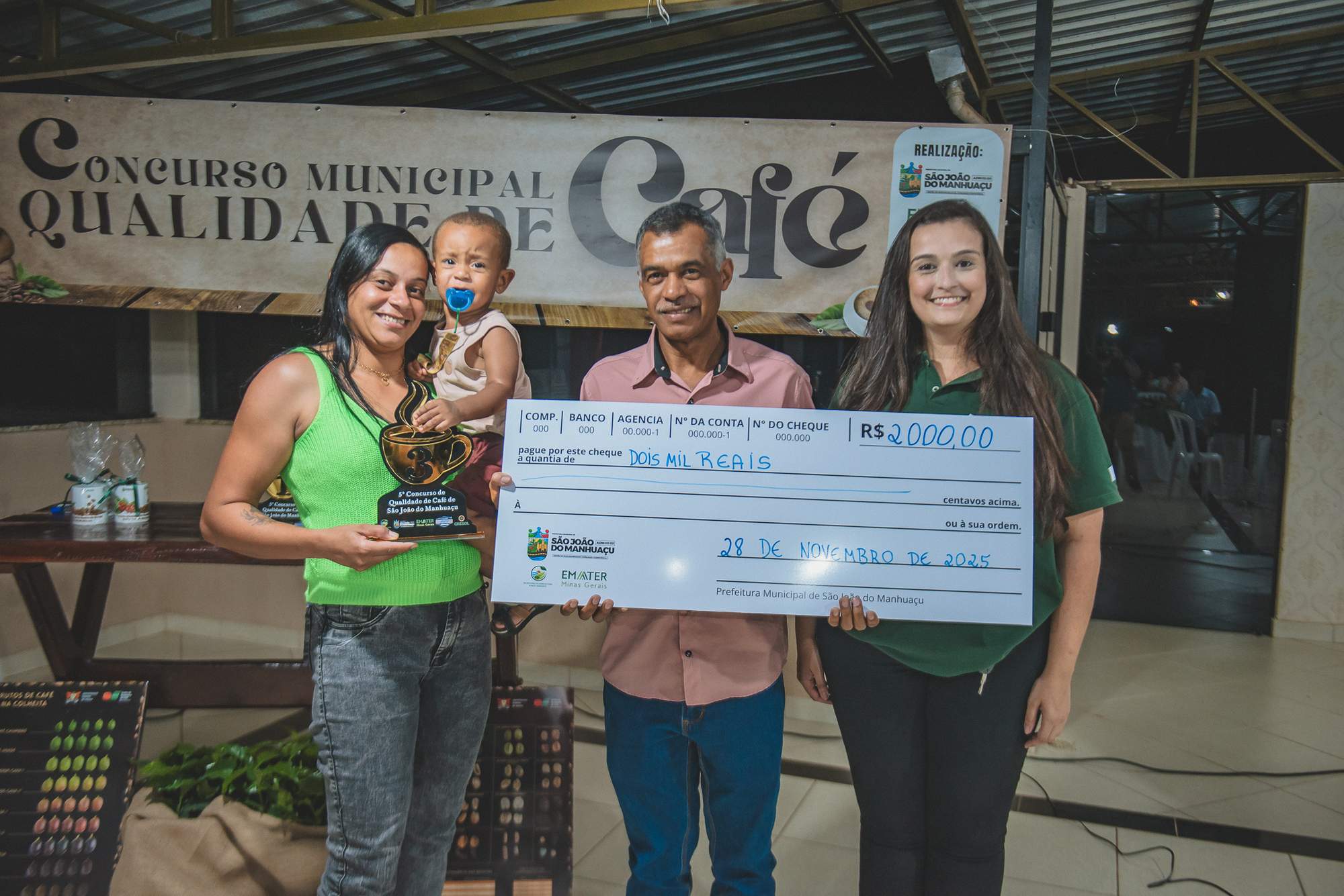 SÃO JOÃO DO MANHUAÇU (MG) - Produtores rurais de diversas comunidades participaram da cerimônia de premiação do 5º Concurso de Qualidade de Café de São João do Manhuaçu, realizada com apoio da Secretaria Municipal de Agricultura, Prefeitura de São João do Manhuaçu e Emater-MG. O evento reuniu autoridades locais, técnicos da Emater e representantes do setor cafeeiro.