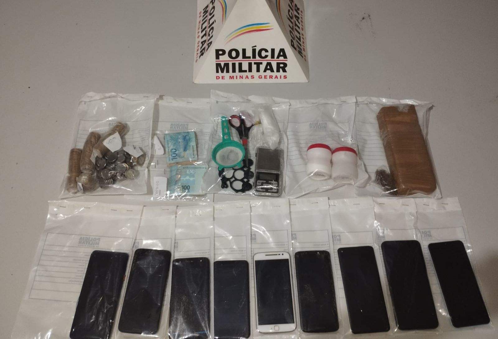 Foram apreendidos uma barra de maconha com aproximadamente 1 kg, uma porção adicional da mesma droga, dois potes com resquícios de cocaína, R$ 2.800 em dinheiro, balança de precisão, nove celulares, duas bicicletas, peças de bicicleta e embalagens para fracionamento e acondicionamento de entorpecentes.