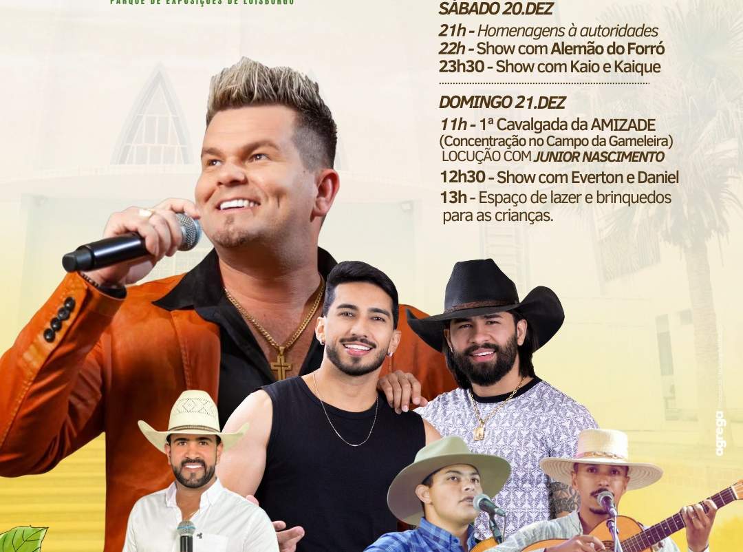 A festa começa no sábado (20), às 21h, com homenagens a autoridades. Em seguida, o público confere os shows de Alemão do Forró, às 22h, e da dupla Kaio e Kaique, às 23h30.