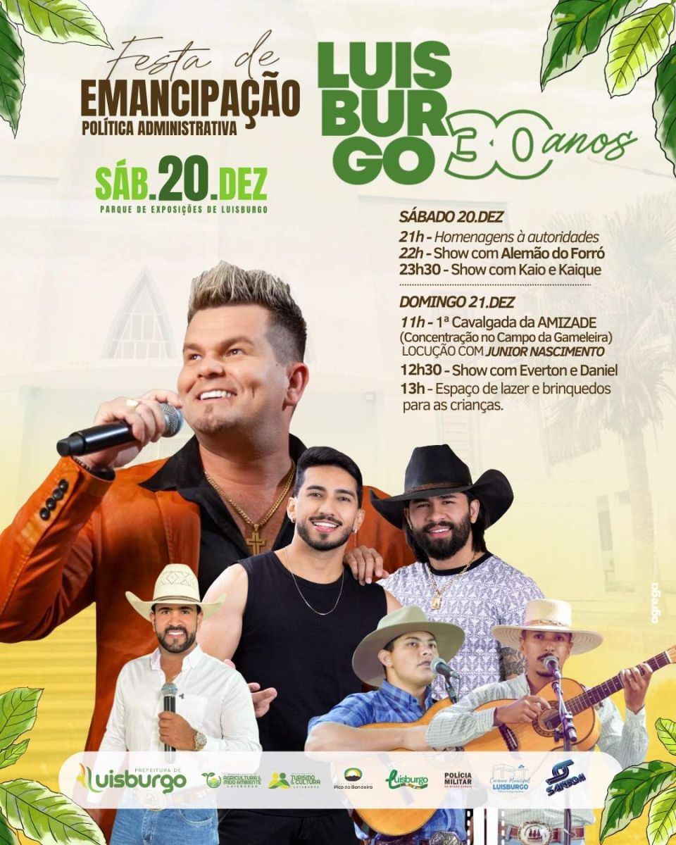LUISBURGO (MG) - Luisburgo celebra seus 30 anos de emancipação político-administrativa com uma programação especial que reúne cultura, lazer e homenagens. A comemoração acontece neste fim de semana, no Parque de Exposições da cidade, com shows, cavalgada e atividades para crianças.