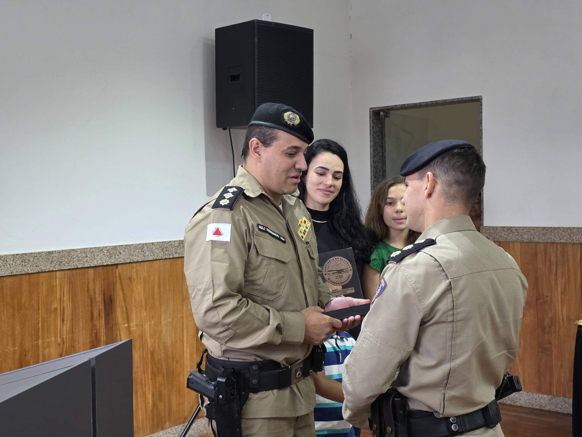 O major Fernando de Souza Nóia Gonçalves também foi homenageado por sua trajetória de liderança no subcomando do 11º BPM, com destaque para sua dedicação e compromisso com a missão institucional da PMMG. Ele foi promovido a Tenente-Coronel e assumirá em breve o comando do Batalhão de Caratinga.