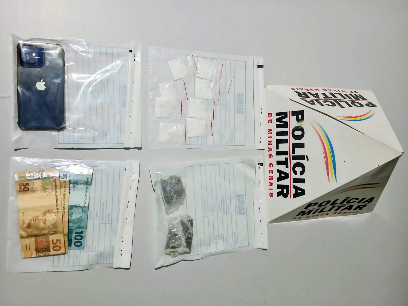 Durante a revista pessoal e a inspeção no veículo, os militares encontraram oito papelotes de cocaína, dois tabletes de maconha, R$ 200 em dinheiro e dois celulares.
