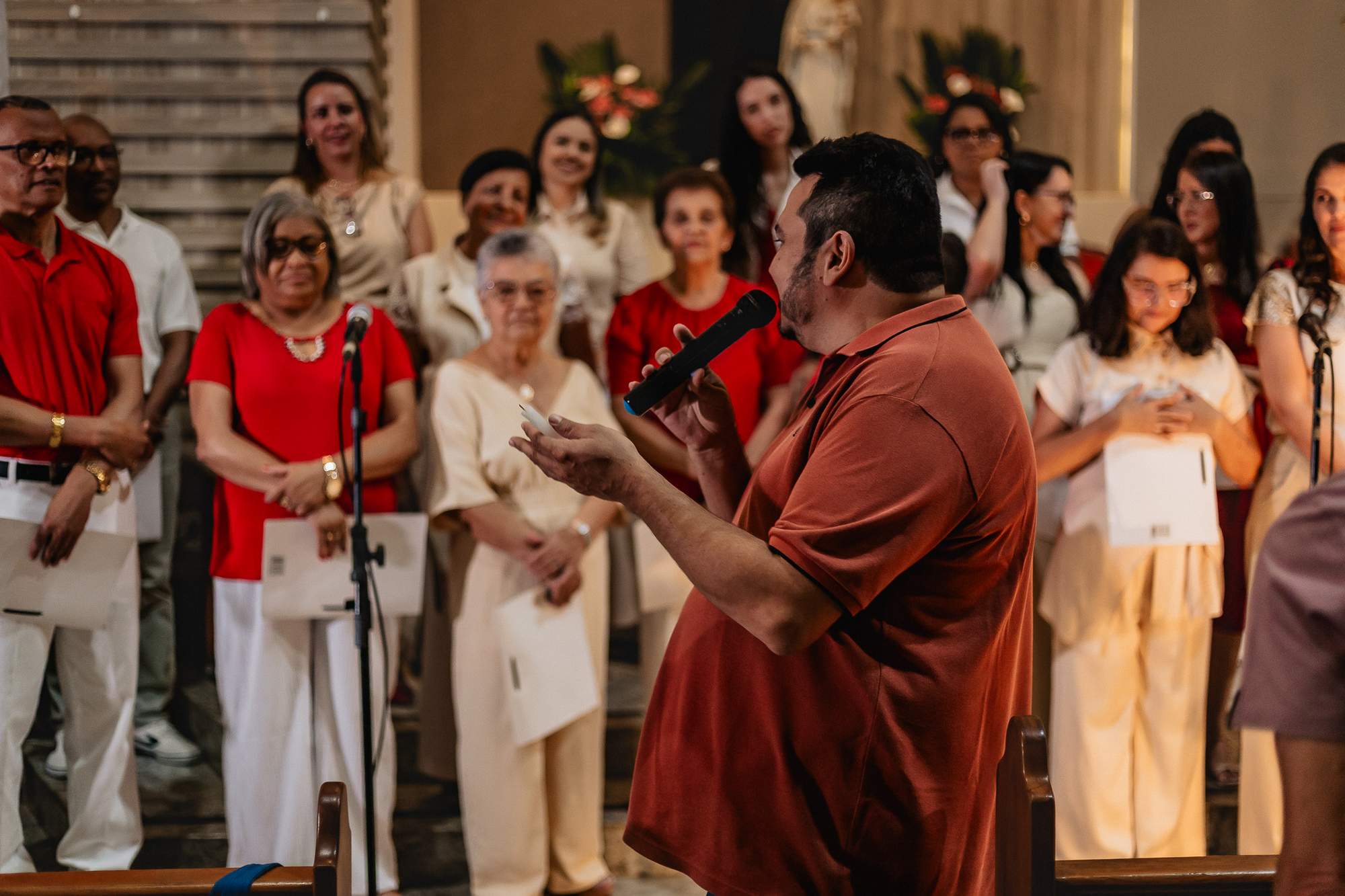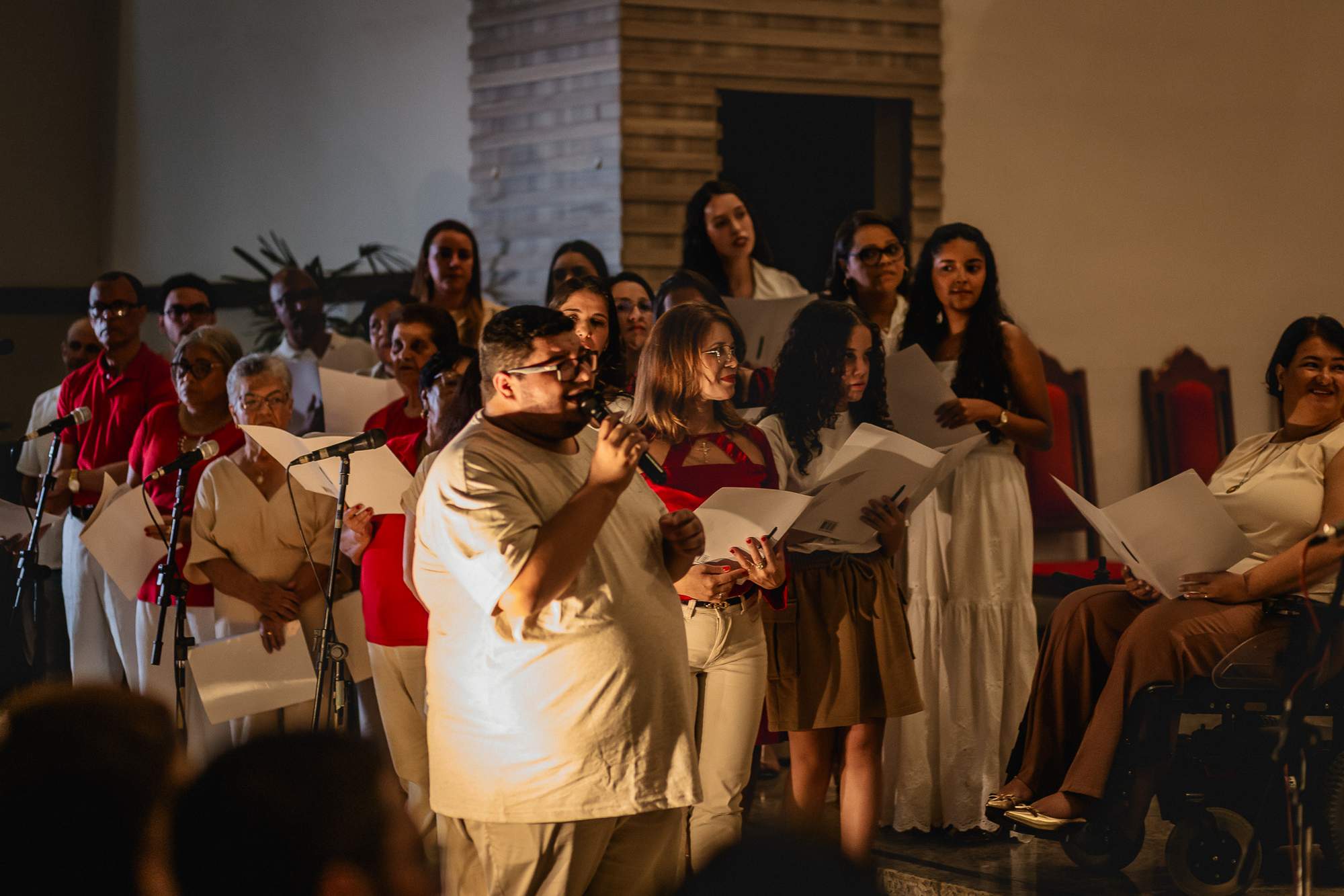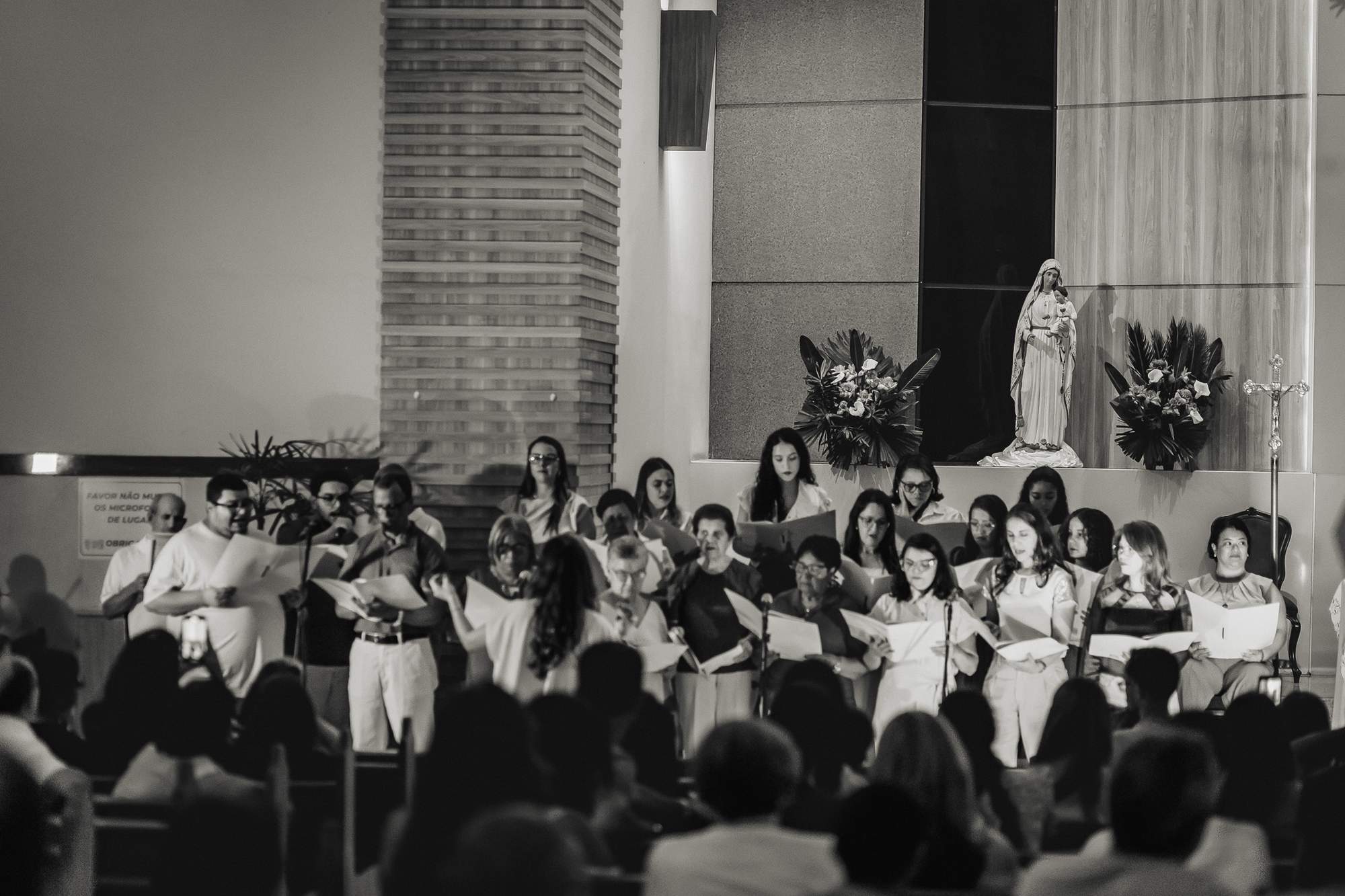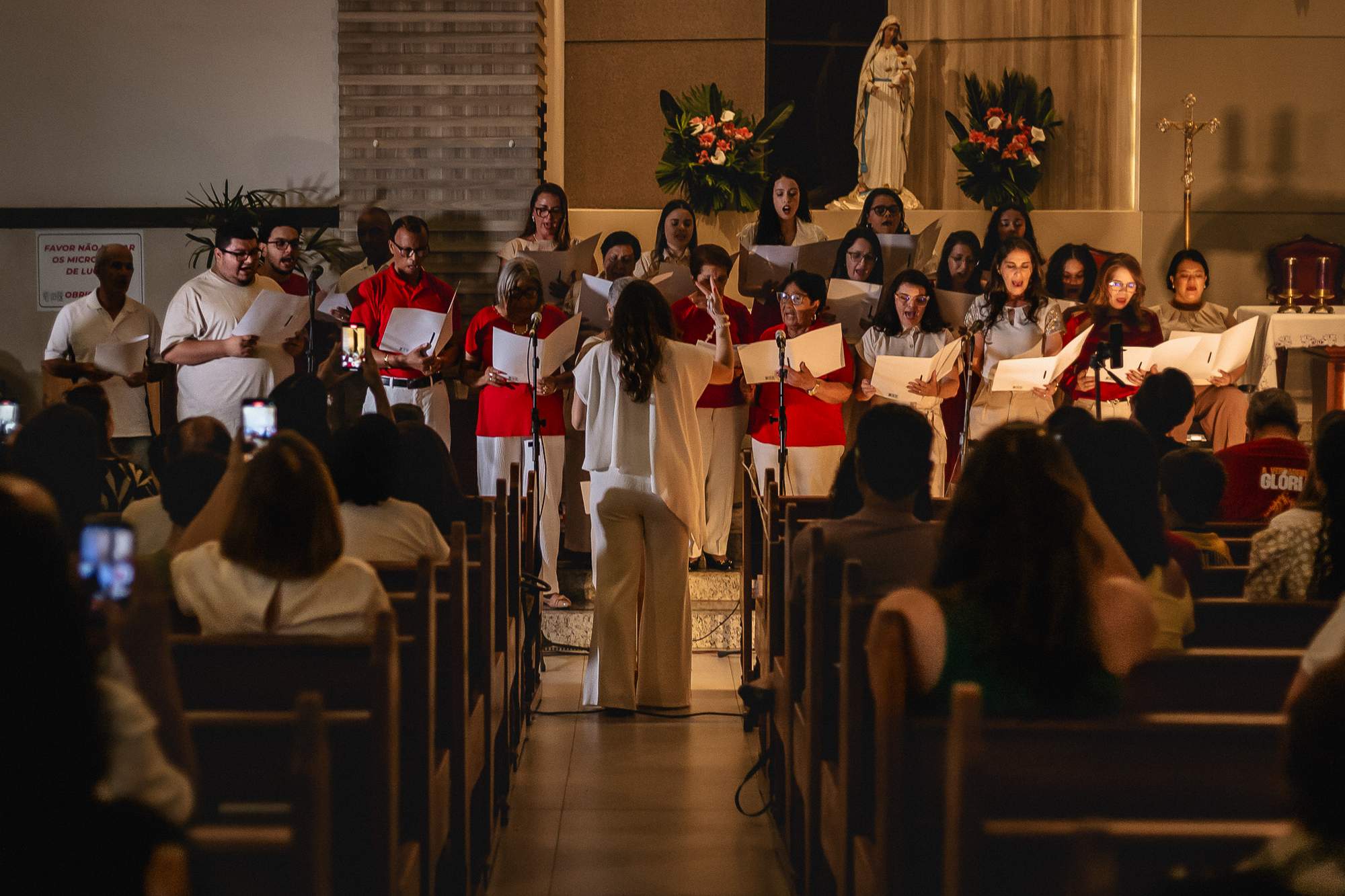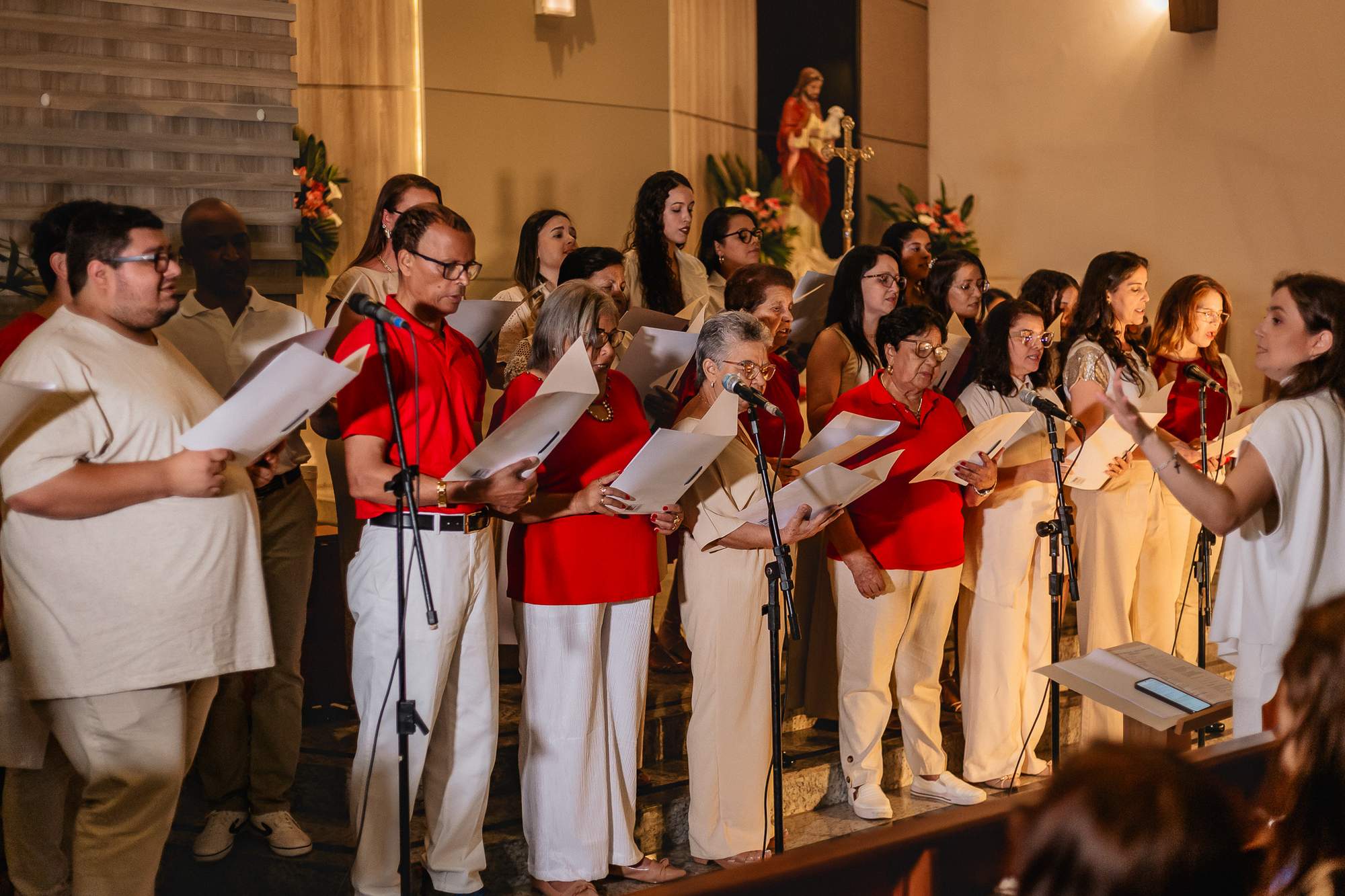 A noite de apresentação ocorreu após a celebração da Santa Missa, presidida pelo padre Rogério, e reuniu fiéis da comunidade em um ambiente solene e contemplativo.