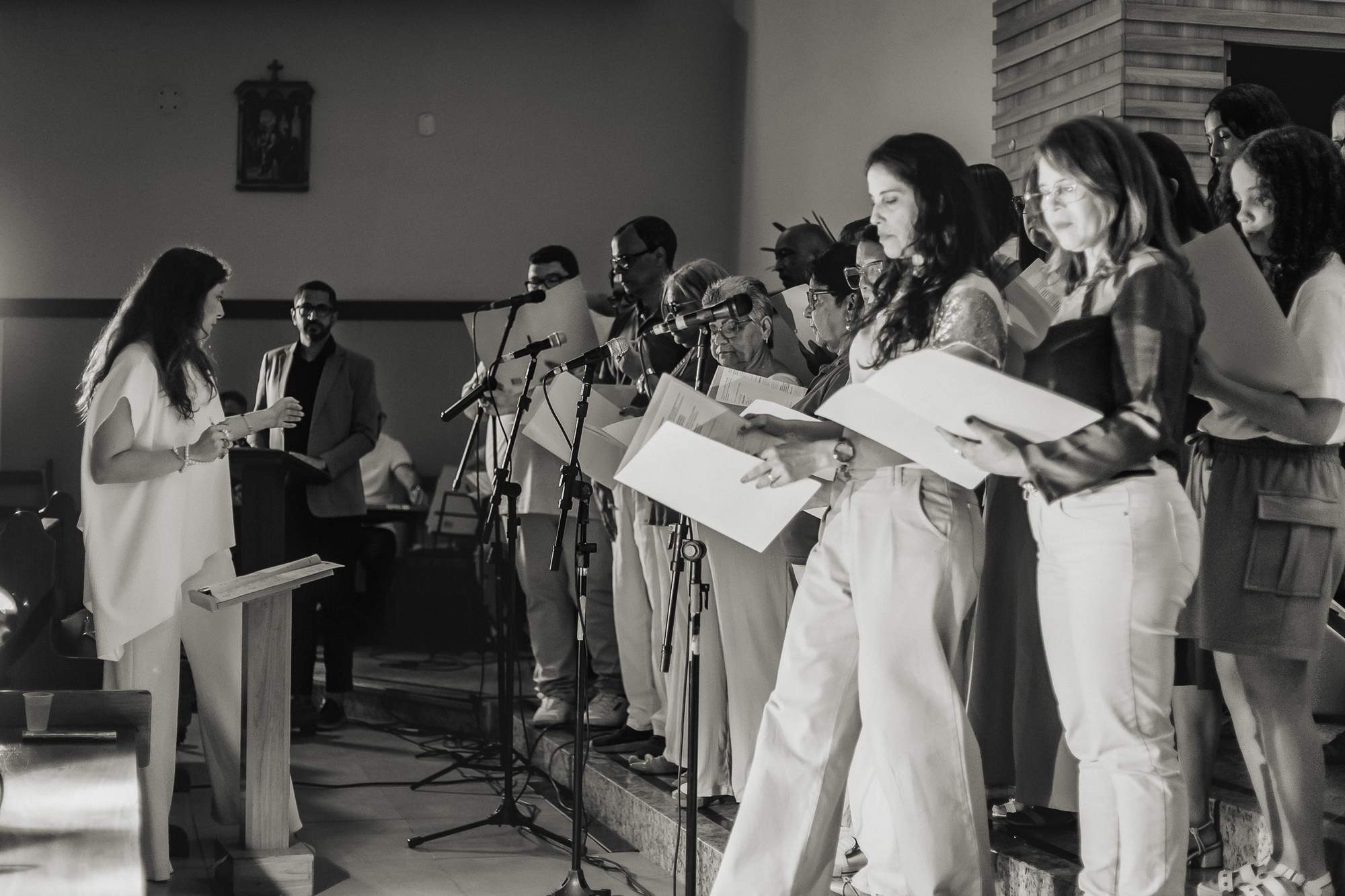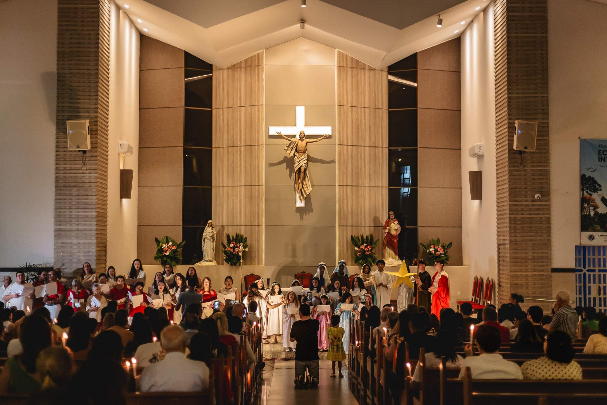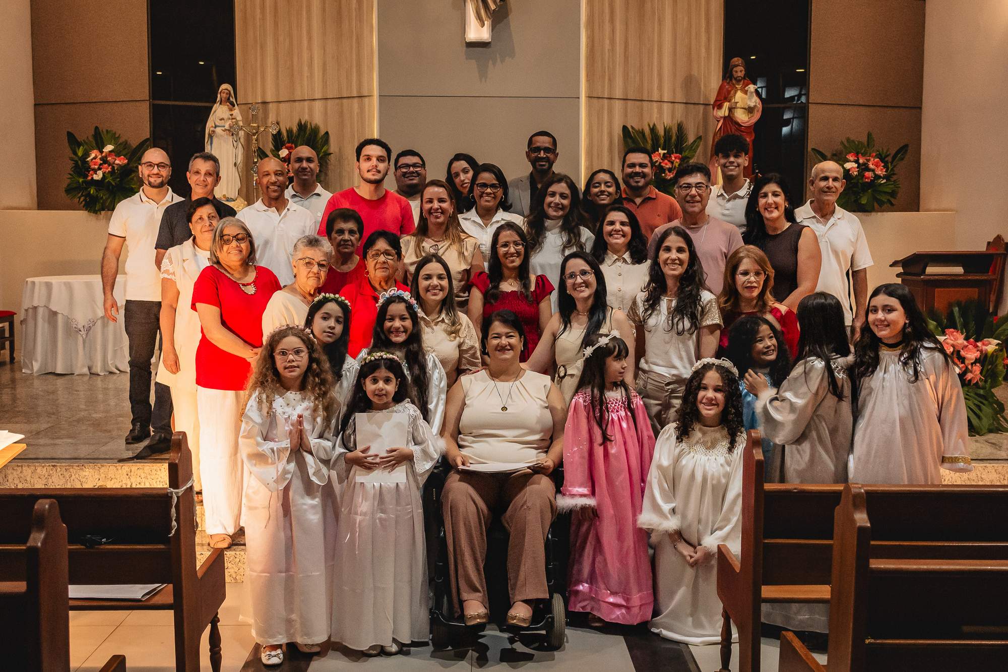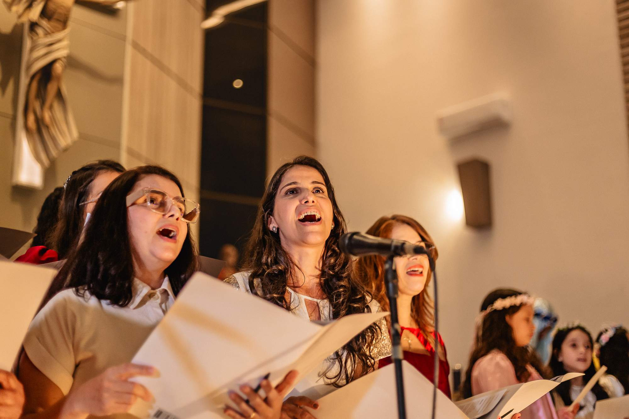 A noite de apresentação ocorreu após a celebração da Santa Missa, presidida pelo padre Rogério, e reuniu fiéis da comunidade em um ambiente solene e contemplativo.