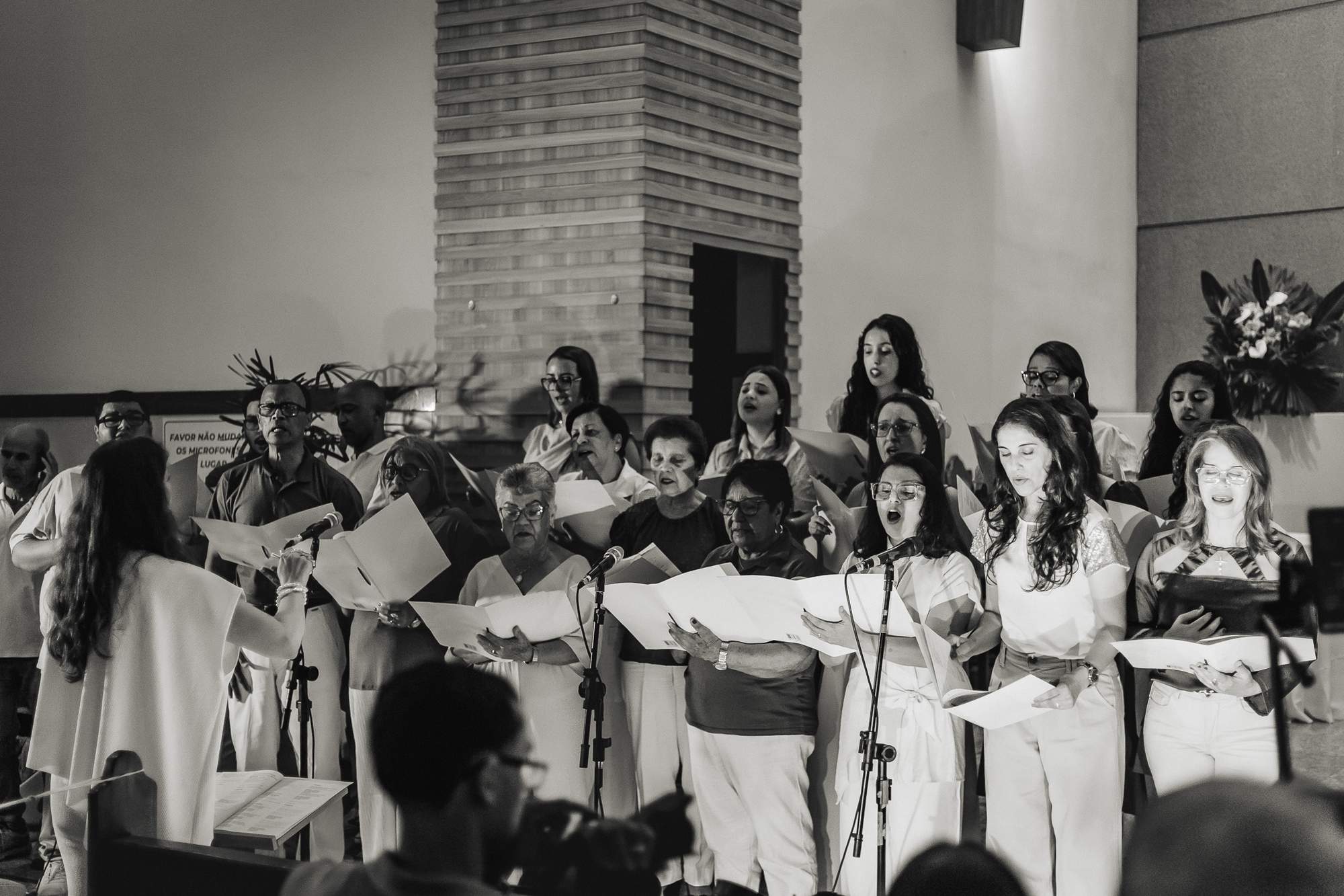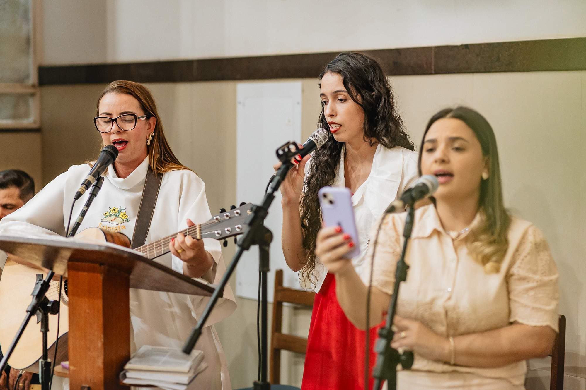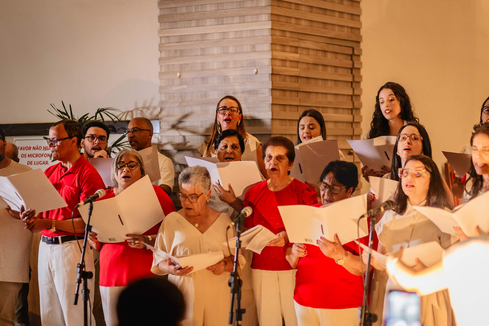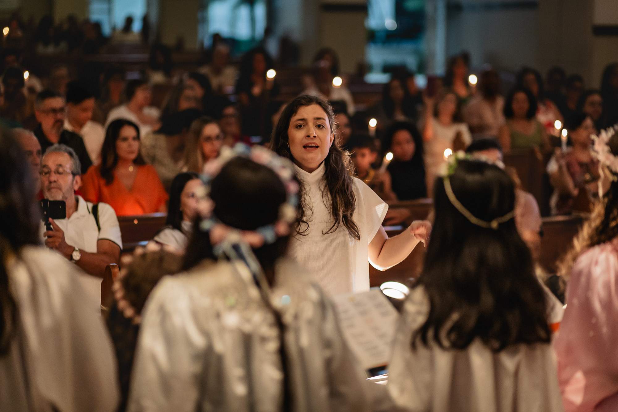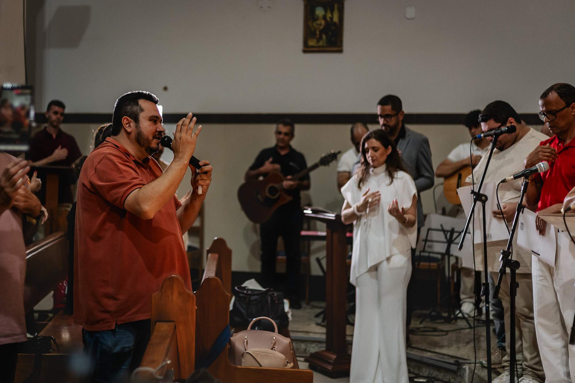 A noite de apresentação ocorreu após a celebração da Santa Missa, presidida pelo padre Rogério, e reuniu fiéis da comunidade em um ambiente solene e contemplativo.