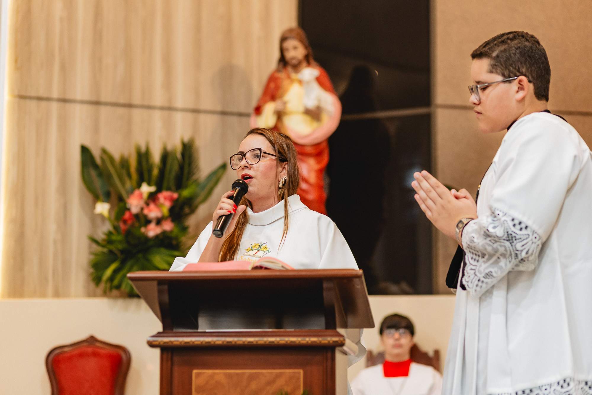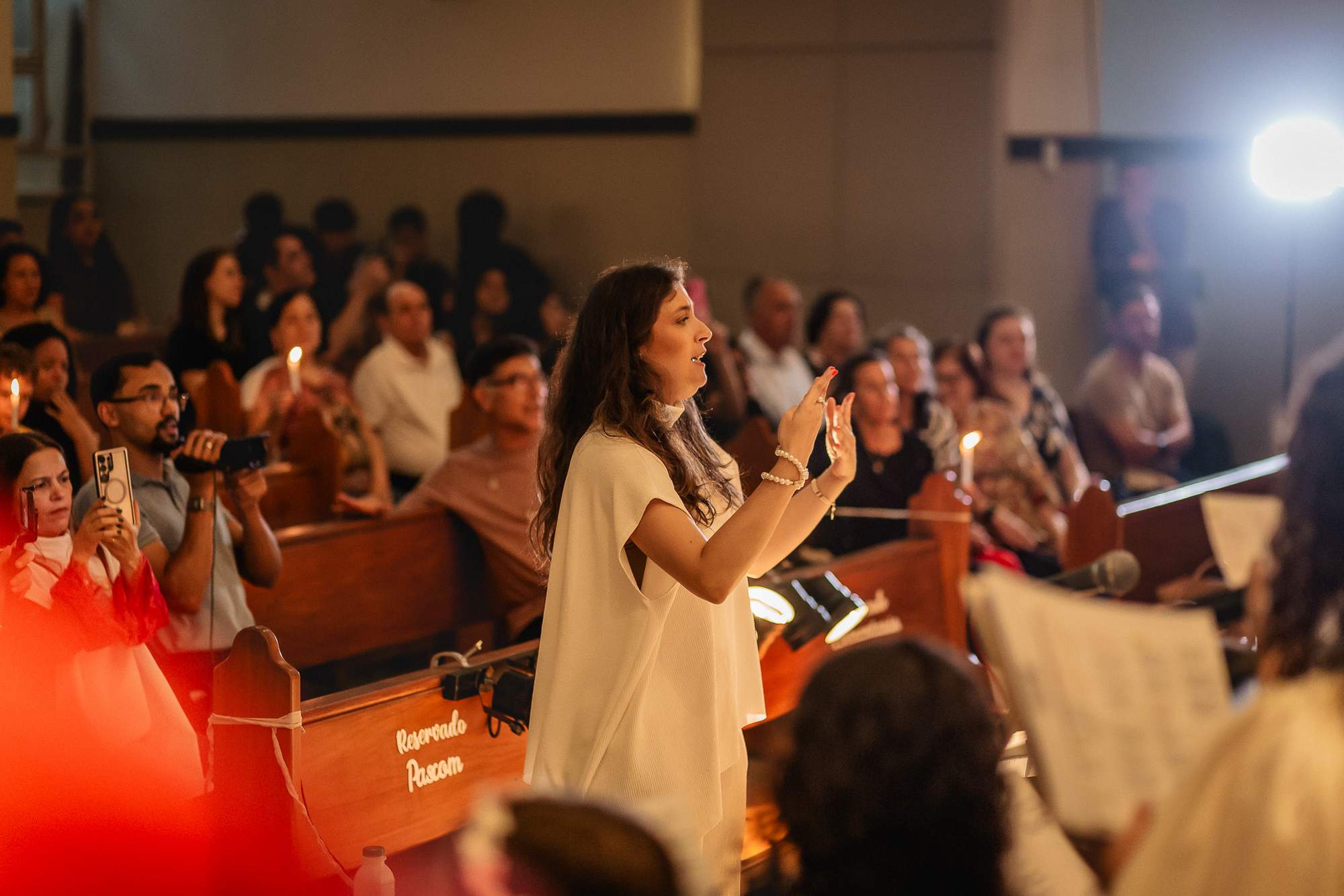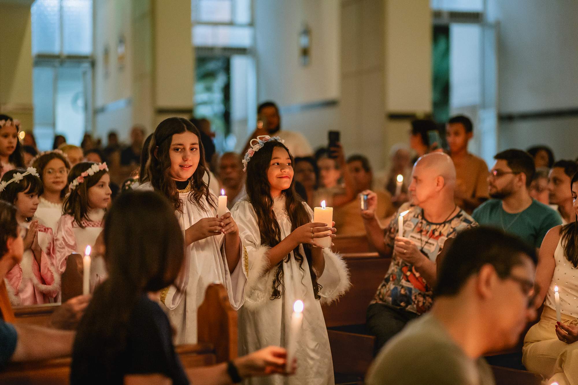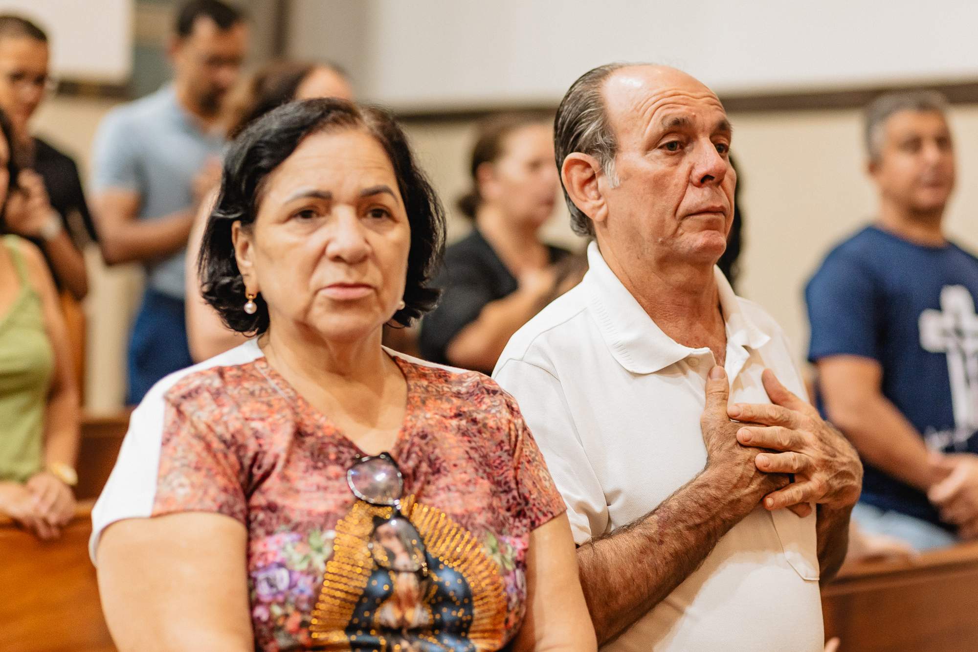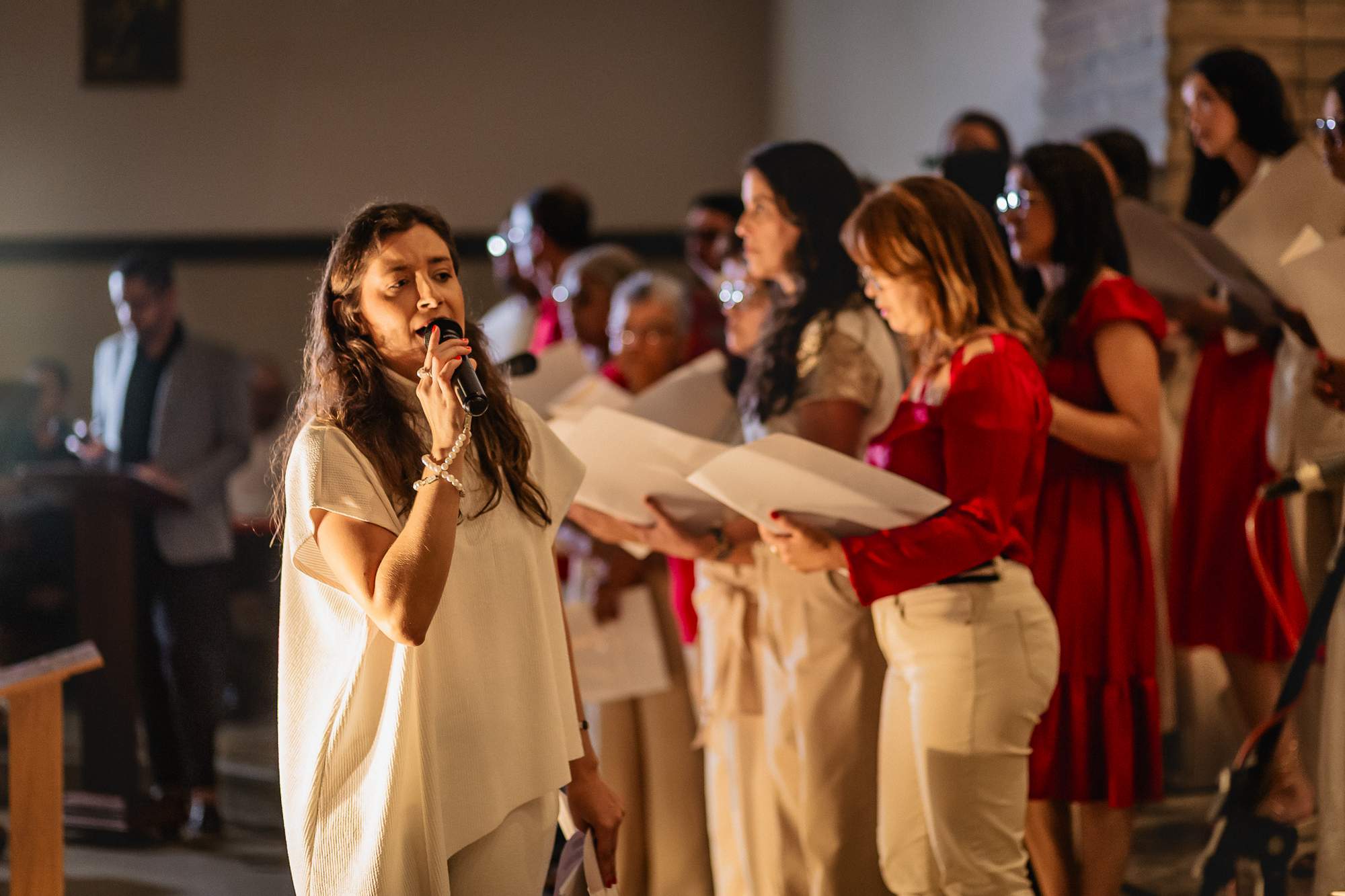 A noite de apresentação ocorreu após a celebração da Santa Missa, presidida pelo padre Rogério, e reuniu fiéis da comunidade em um ambiente solene e contemplativo.
