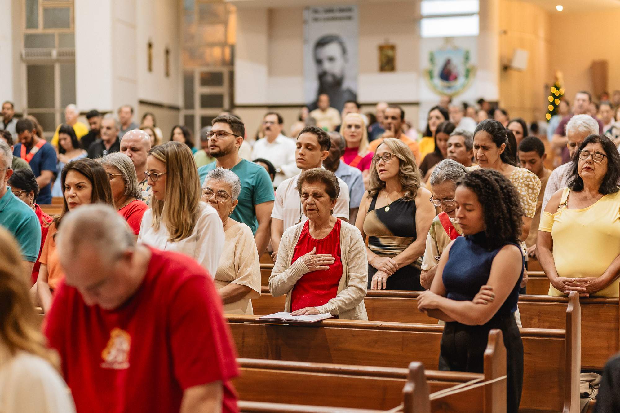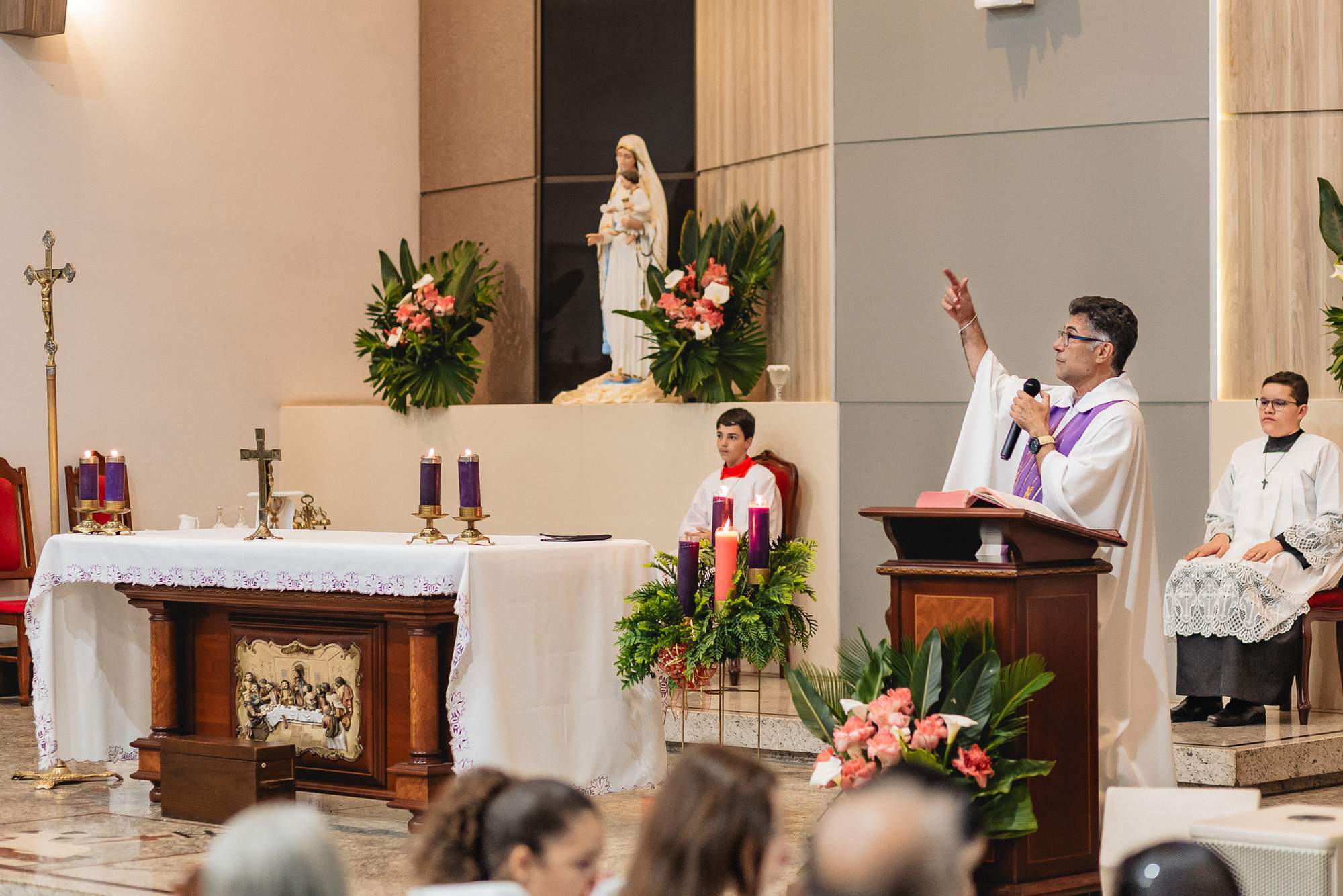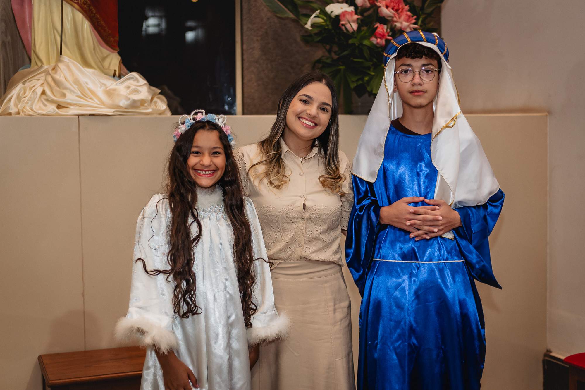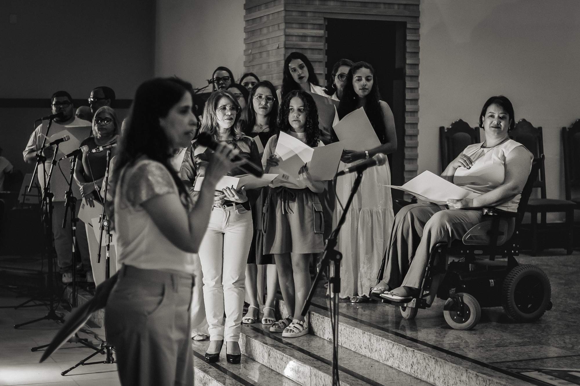 A noite de apresentação ocorreu após a celebração da Santa Missa, presidida pelo padre Rogério, e reuniu fiéis da comunidade em um ambiente solene e contemplativo.