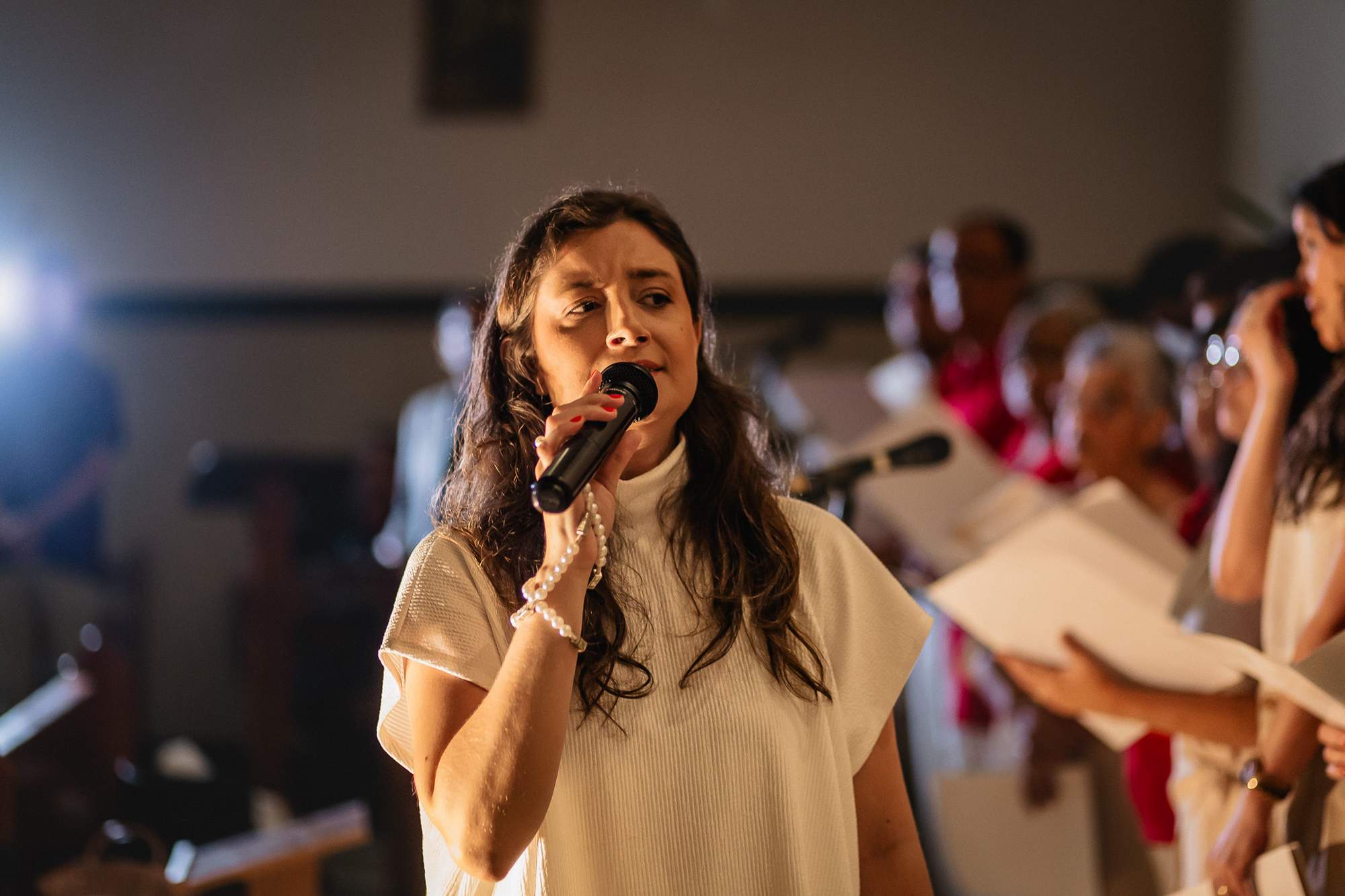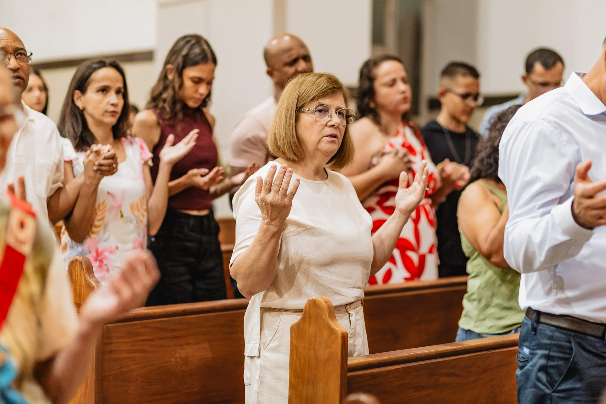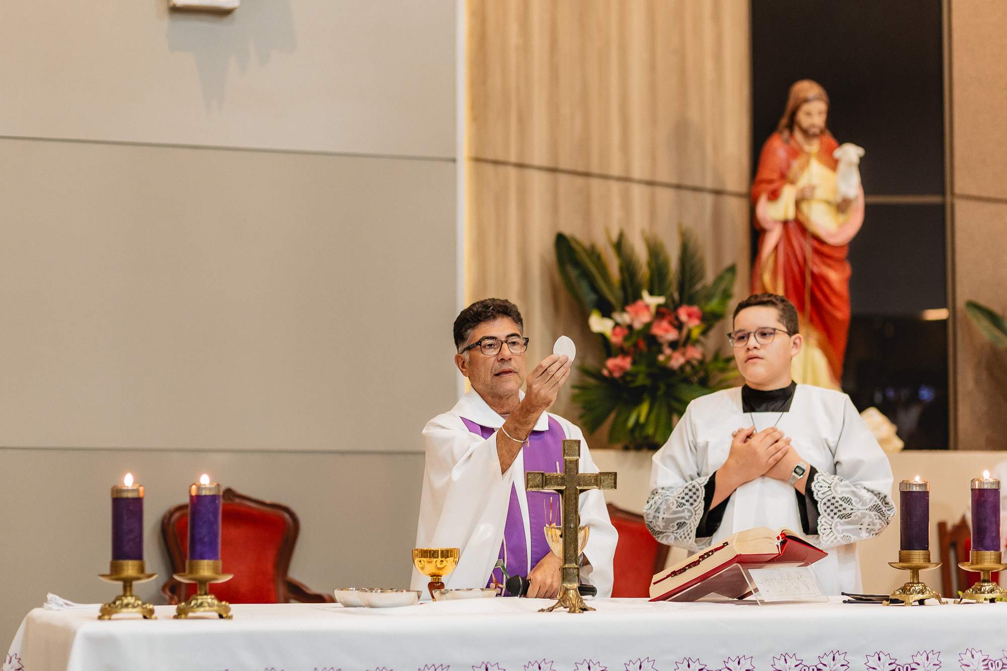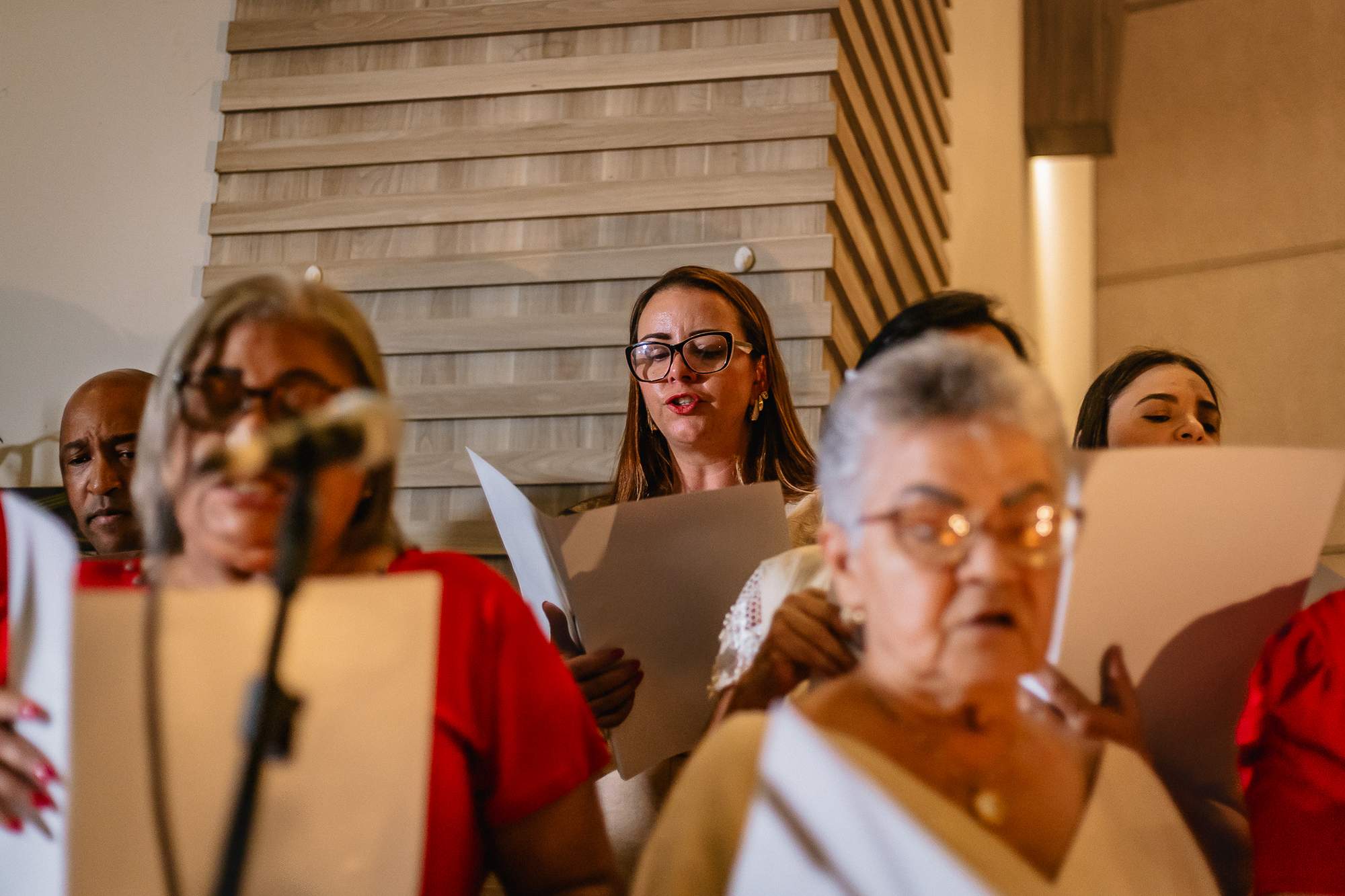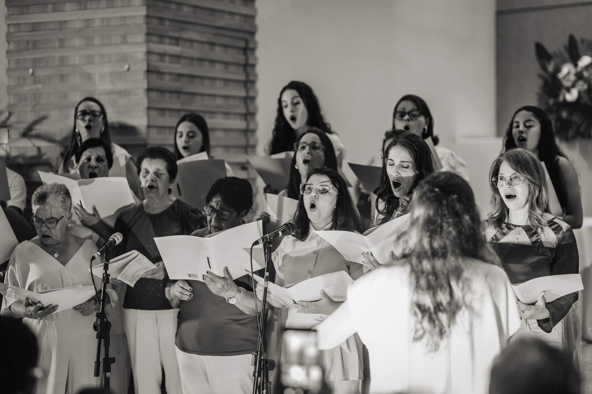 A noite de apresentação ocorreu após a celebração da Santa Missa, presidida pelo padre Rogério, e reuniu fiéis da comunidade em um ambiente solene e contemplativo.