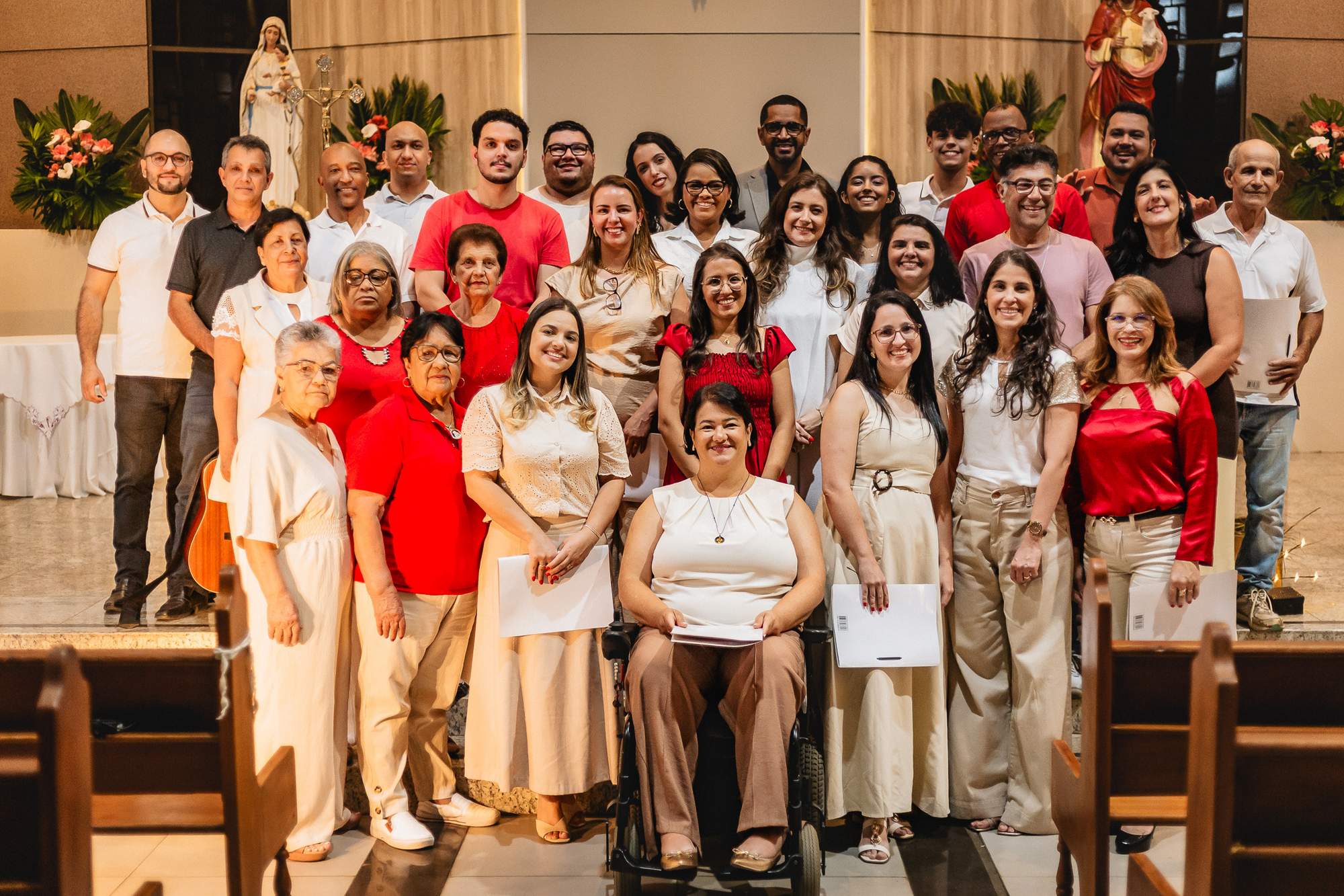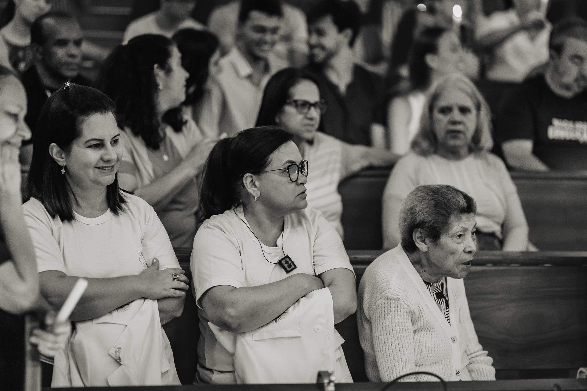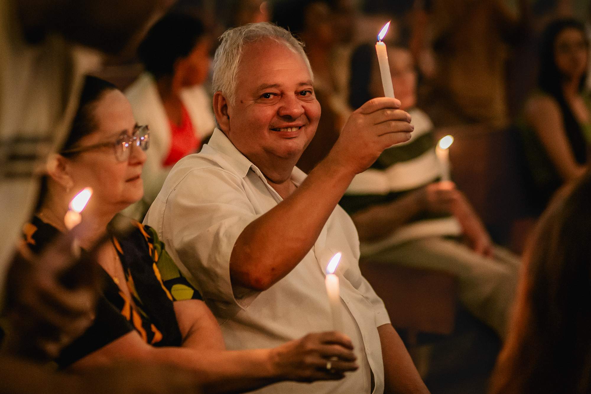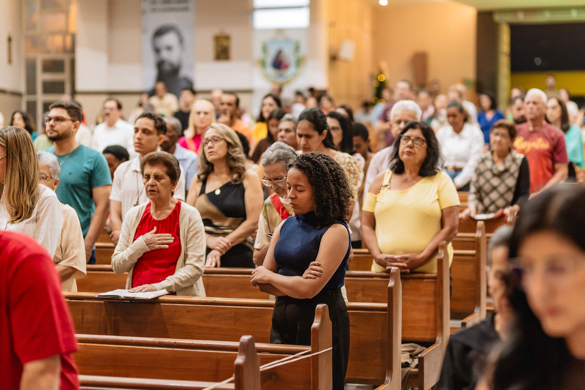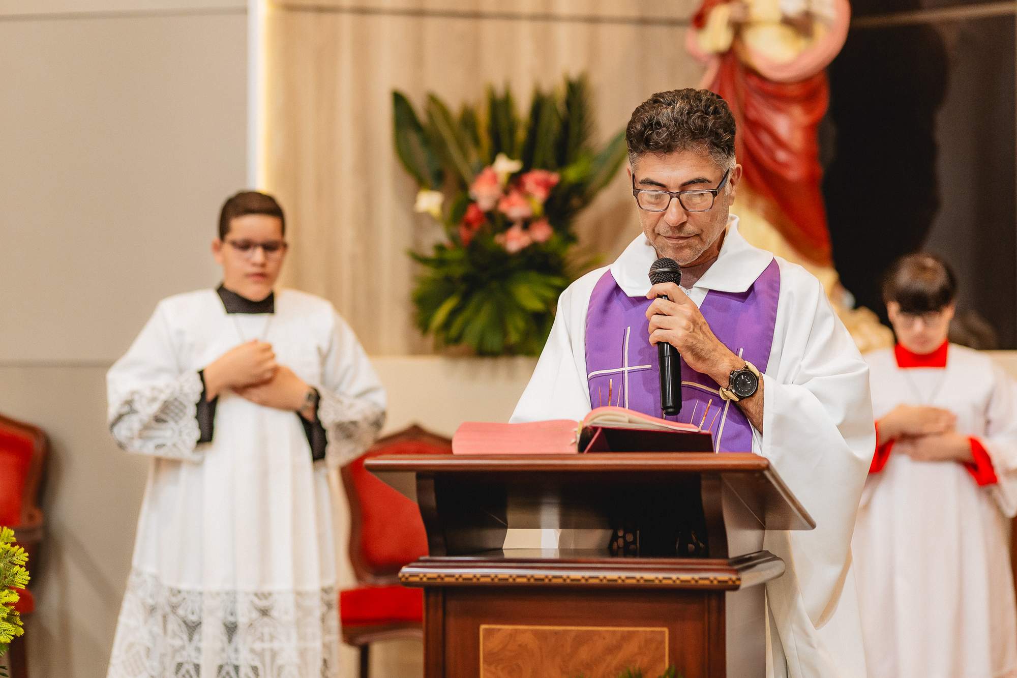 A noite de apresentação ocorreu após a celebração da Santa Missa, presidida pelo padre Rogério, e reuniu fiéis da comunidade em um ambiente solene e contemplativo.