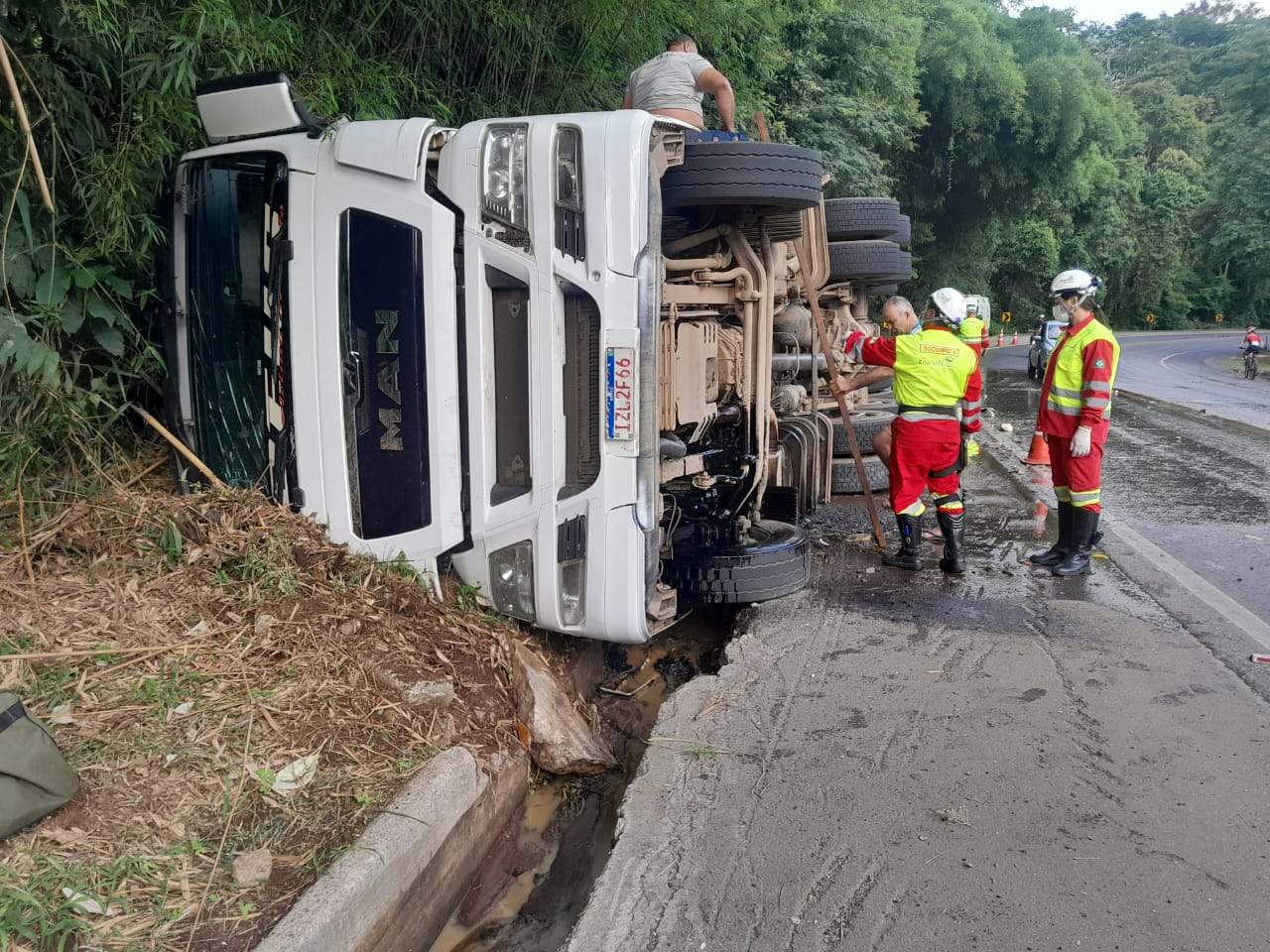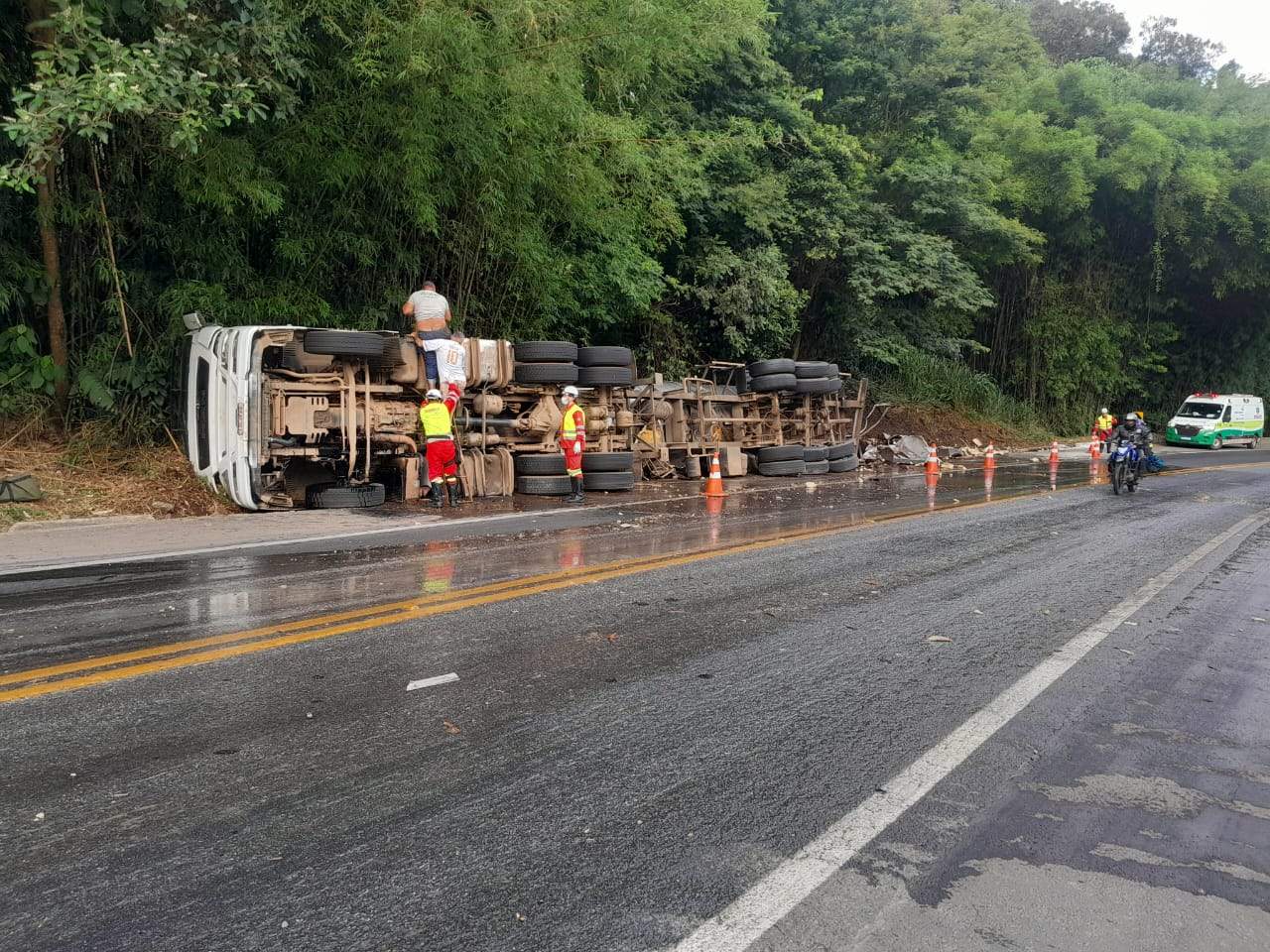 SÃO JOÃO DO MANHUAÇU (MG) - Uma carreta carregada com soro de leite tombou na manhã desta segunda-feira (15) no km 592 da BR-116, entre as comunidades de Realeza e São João do Manhuaçu. O acidente aconteceu por volta das 6h30 e mobilizou equipes do SAMU, Polícia Rodoviária Federal (PRF) e da concessionária Ecovias Rio Minas.