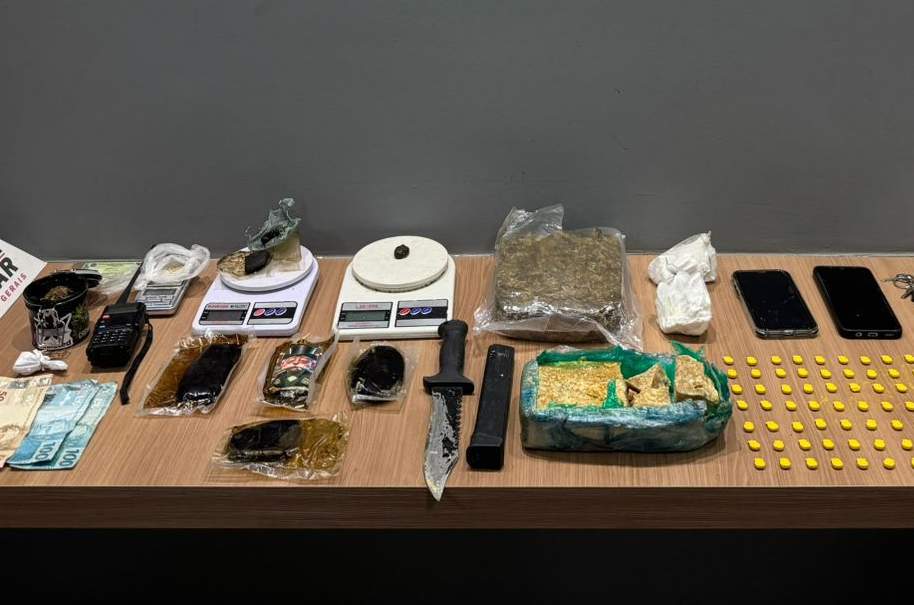 Entre os materiais apreendidos, a PM listou: uma barra de crack, uma barra de maconha, 71 comprimidos de ecstasy, porções de cocaína, tabletes e porções de haxixe, além de um pote contendo maconha. Também foram recolhidos três balanças de precisão, uma faca, um carregador de munição 9 mm, dois telefones celulares, um rádio comunicador, um molho de chaves e valor em dinheiro (quantia não informada).