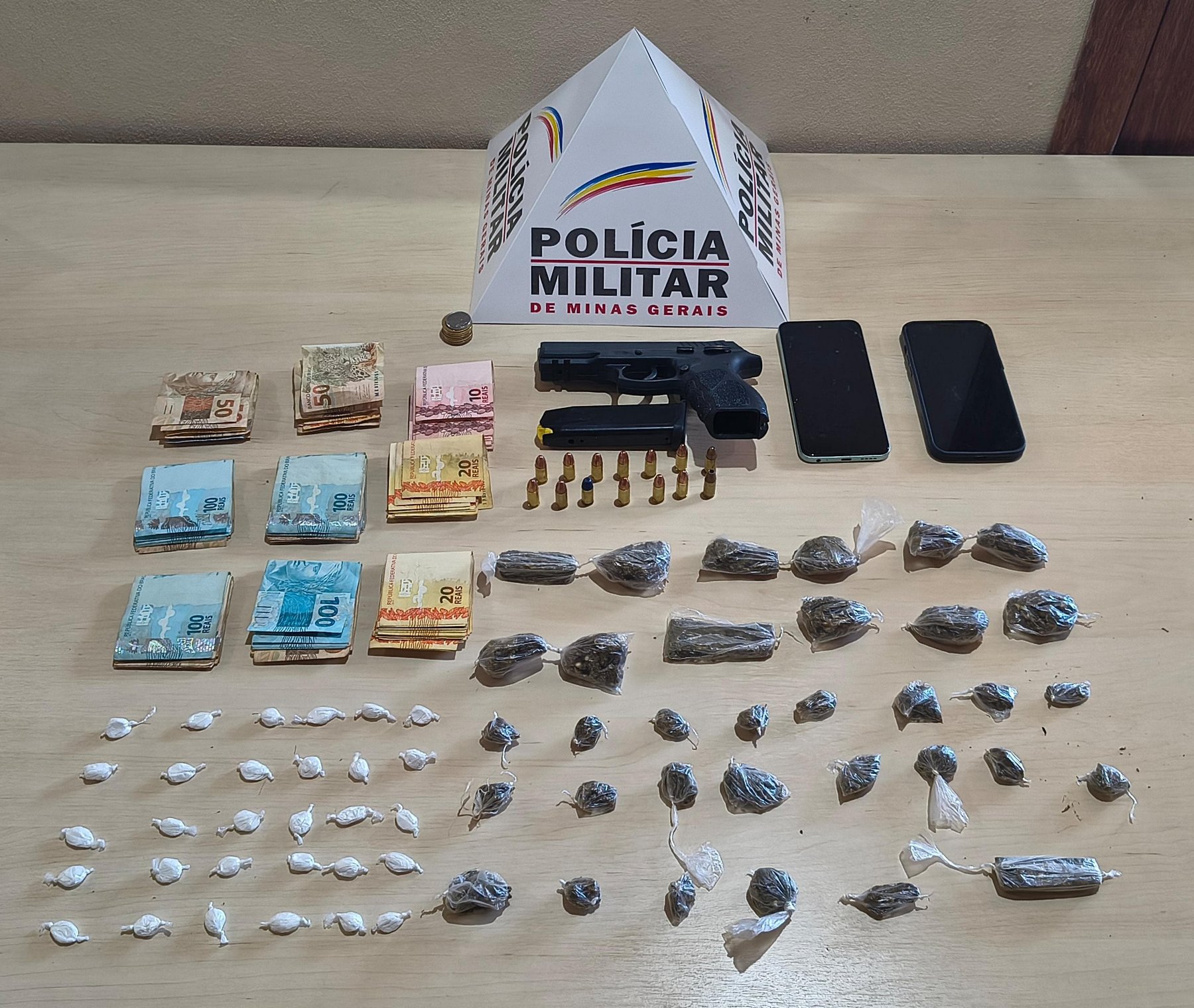 Ao todo, foram recolhidos uma pistola Taurus TH9, 14 munições intactas, cerca de R$ 7 mil em dinheiro, além de cocaína e maconha já fracionadas para a venda. Há suspeita de que a arma apreendida possa ter sido utilizada em homicídios recentes no município.