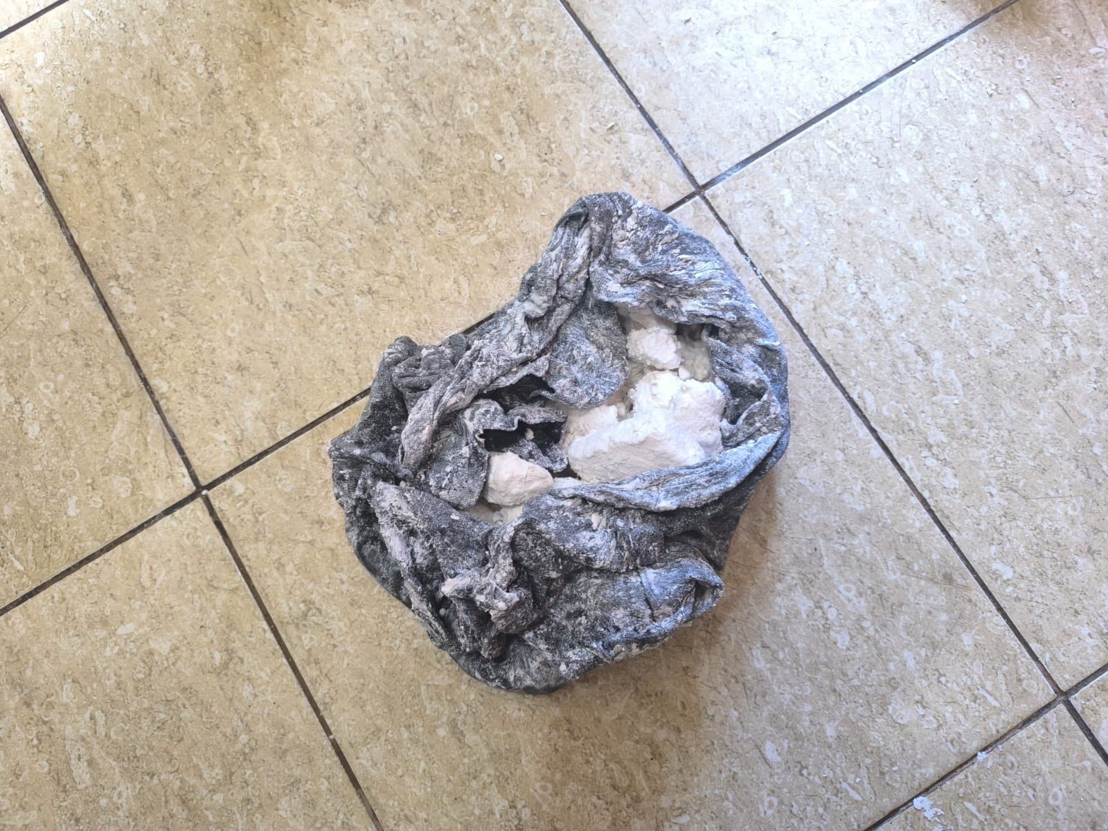 Na abordagem, os policiais encontraram o quarto do homem com grande quantidade de cocaína espalhada, além de roupas, mãos e pés do suspeito sujos com o entorpecente. Segundo ele, havia cerca de três barras grandes da substância no local. Para tentar destruir o material, o homem tentou usar garrafas de água, mas sem sucesso. Ele foi preso em flagrante.