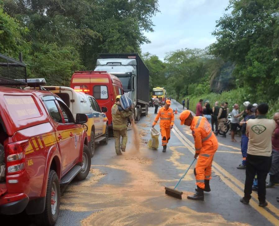Devido ao derramamento de óleo na pista, os bombeiros aplicaram serragem para eliminar o risco de derrapagens e evitar novos acidentes. O trânsito na região exigiu atenção dos motoristas durante o atendimento da ocorrência.
