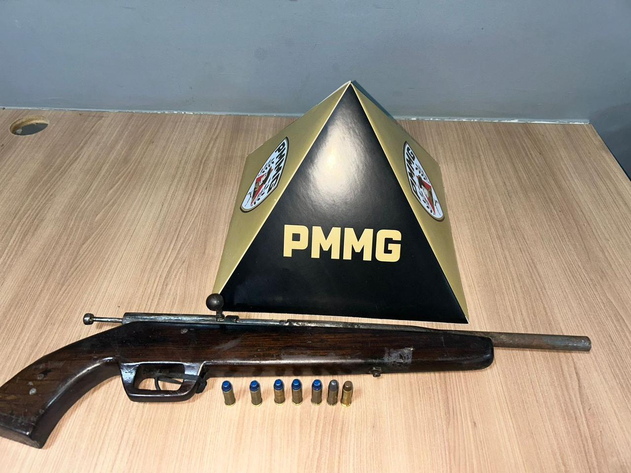 Questionado, o adolescente indicou que mantinha escondida uma arma de fogo em uma lavoura no Córrego Palmeiras, na zona rural. No local informado, foi localizada uma arma de fabricação artesanal calibre .38, acompanhada de sete cartuchos intactos do mesmo calibre.
