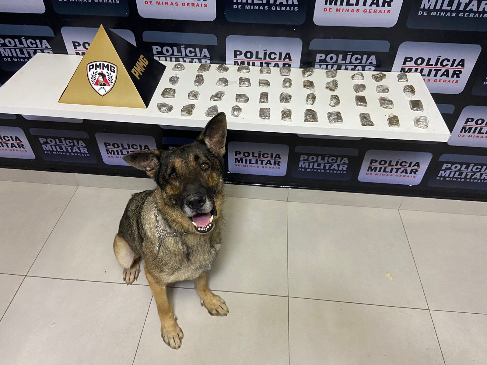 Durante averiguação nas proximidades de uma escadaria, o cão de faro Aquiles foi empregado nas buscas e localizou, em pontos distintos, 44 tabletes de maconha.