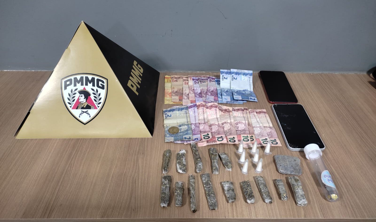 Durante a busca pessoal, os policiais localizaram entorpecentes já fracionados e prontos para comercialização, além de aparelhos celulares e dinheiro.