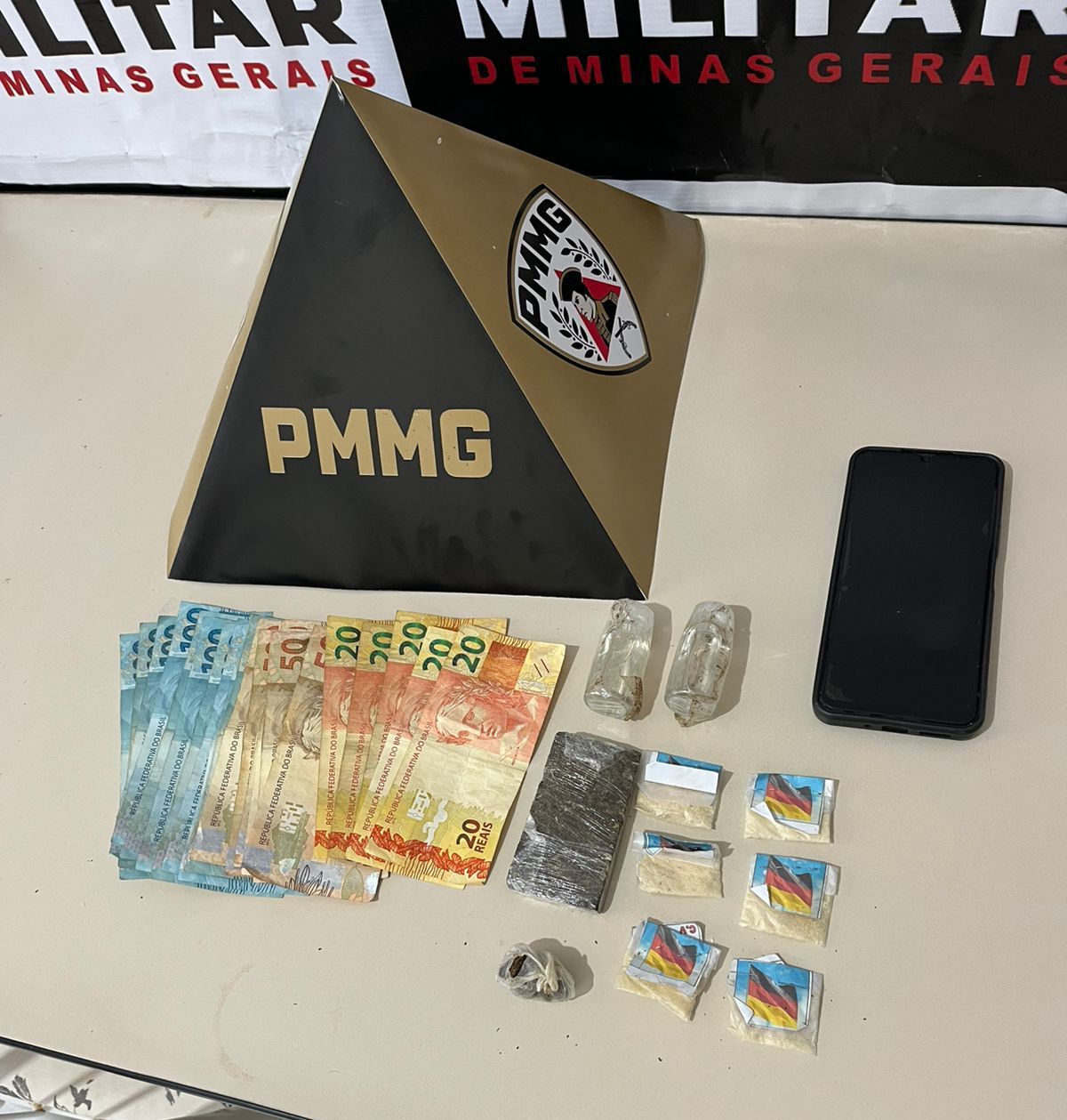 Durante a abordagem, os militares localizaram seis papelotes de cocaína, uma bucha e um tablete de maconha, dois frascos de lança-perfume, R$ 1.600,00 em dinheiro e um aparelho celular.