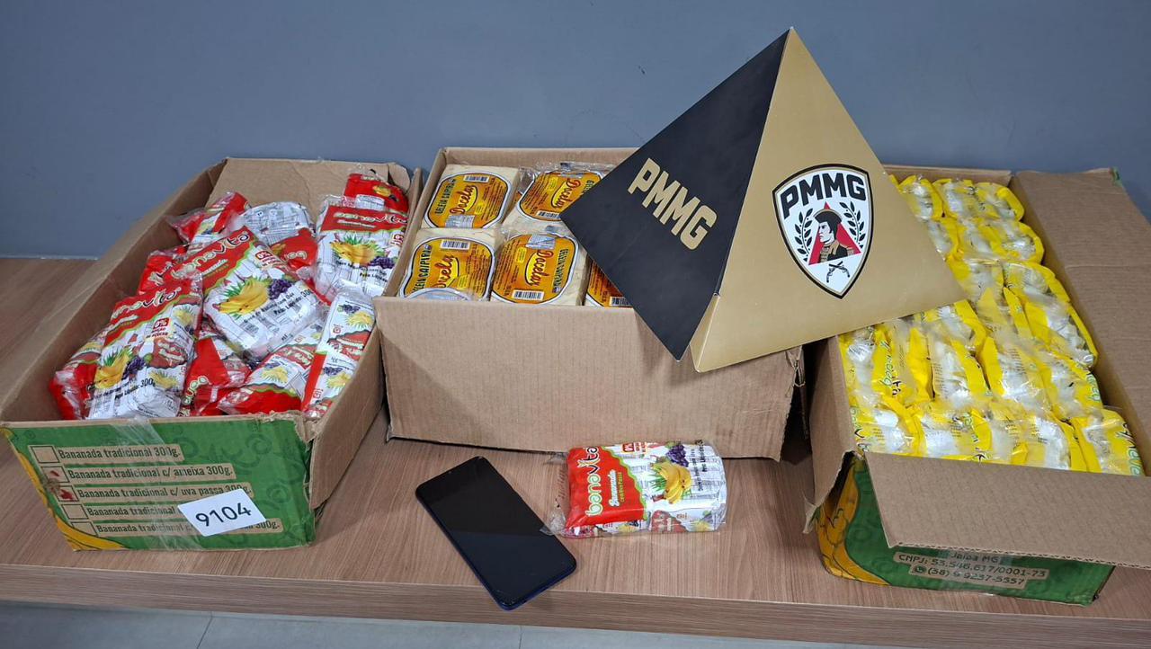 Durante a verificação, foi constatado que o autor transportava 03 caixas com gêneros alimentícios, produtos que haviam sido furtados de um caminhão baú estacionado no local, o qual apresentava o cadeado do compartimento de carga arrombado.