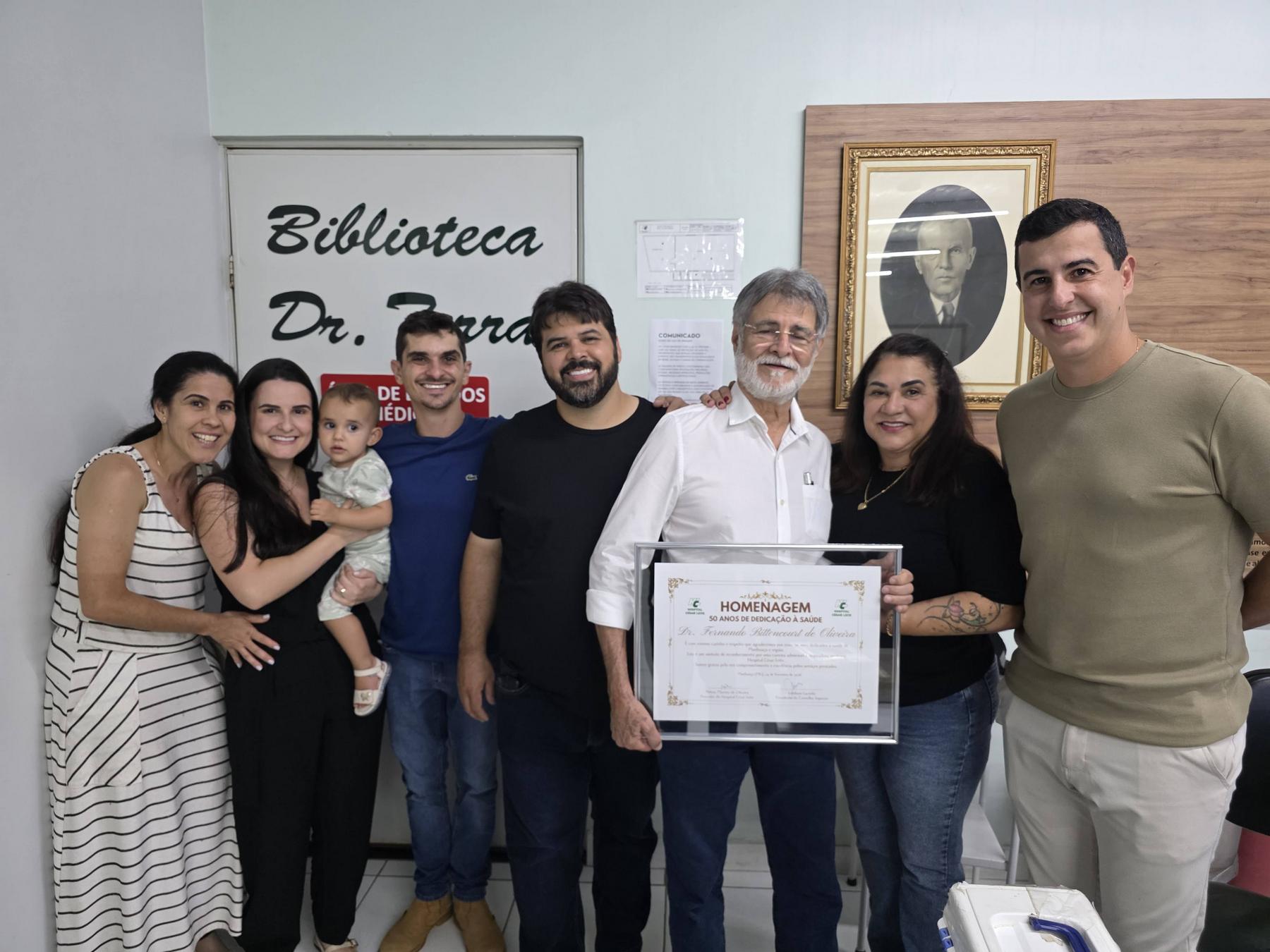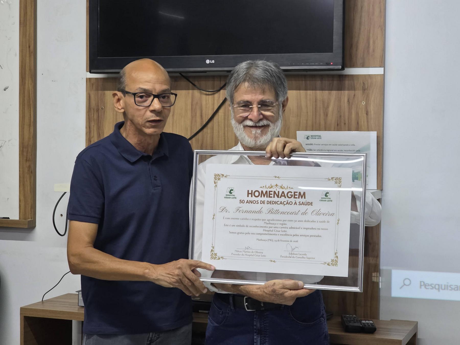 MANHUAÇU (MG) - O Hospital César Leite prestou uma emocionante homenagem ao Dr. Fernando Bittencourt de Oliveira pelos 50 anos de trabalho dedicados à instituição. A entrega da honraria aconteceu durante a reunião do Conselho Superior, realizada na noite de terça-feira (24/02), com a presença de familiares, conselheiros e membros da diretoria.