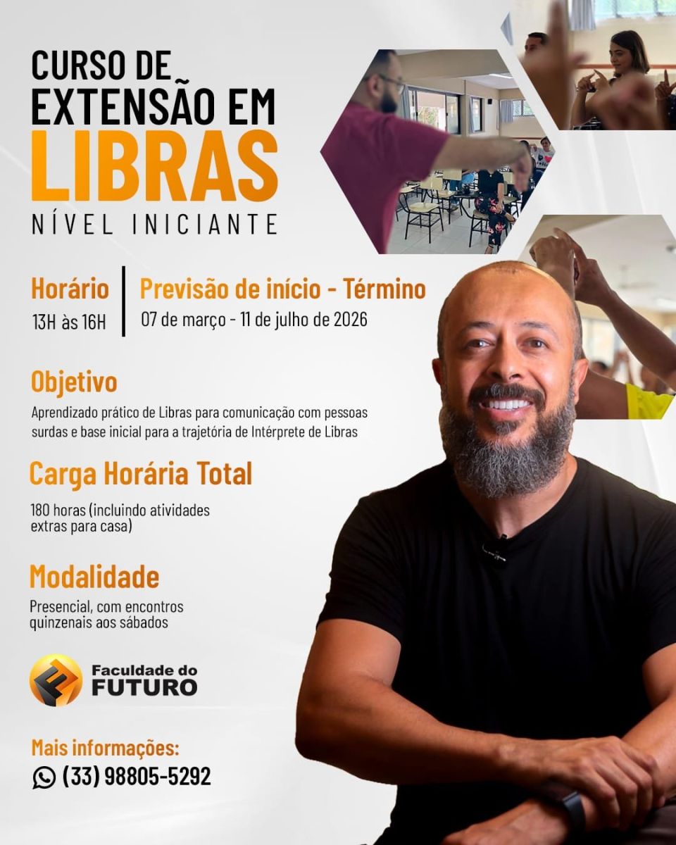 MANHUAÇU (MG) - A Faculdade do Futuro está com inscrições abertas para a 15ª turma do Curso de Extensão em Libras (Língua Brasileira de Sinais). Reconhecida oficialmente pela Lei nº 10.436/2002 como meio legal de comunicação e expressão no Brasil, a Libras é fundamental para promover a inclusão social de mais de 10 milhões de brasileiros com surdez.