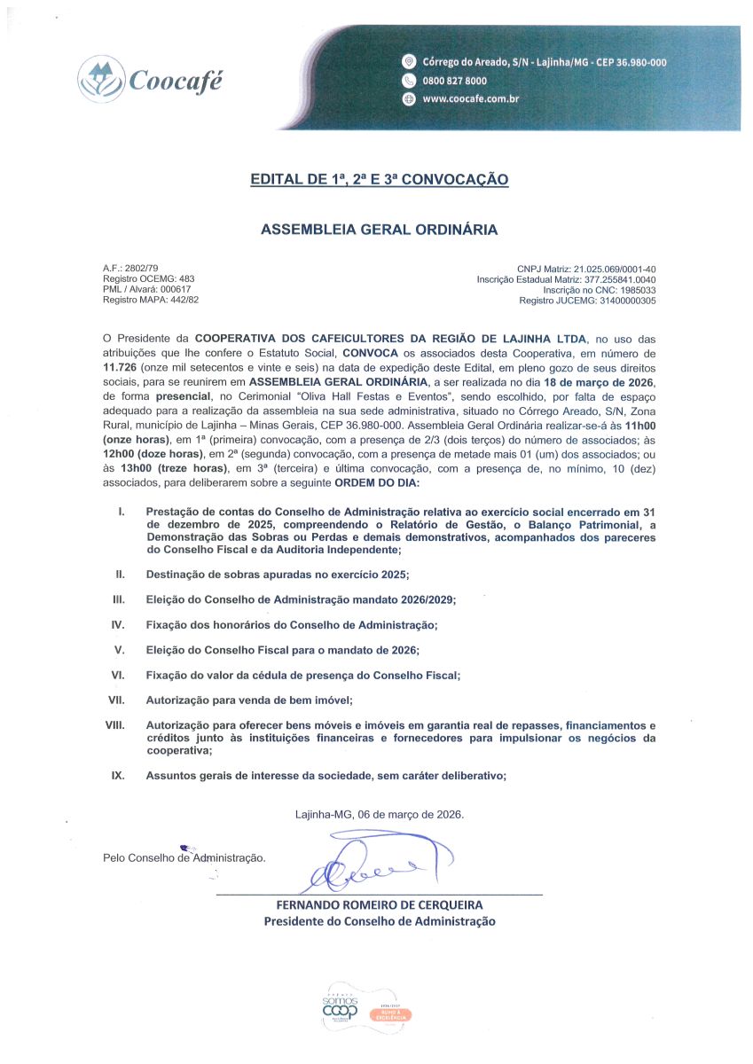 Edital de Convocação de Assembleia Geral Ordinária - Coocafé - 2026