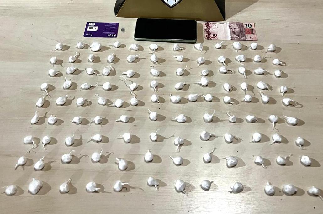 Durante patrulhamento, os policiais avistaram o suspeito conduzindo o veículo mencionado e realizaram a abordagem. Na busca pessoal, foram encontrados 110 papelotes de cocaína, além de um aparelho celular.