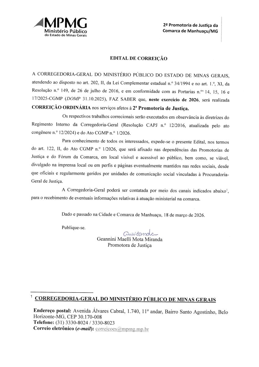 Aviso de Correição Ordinária - 2ª Promotoria de Justiça da Comarca de Manhuaçu