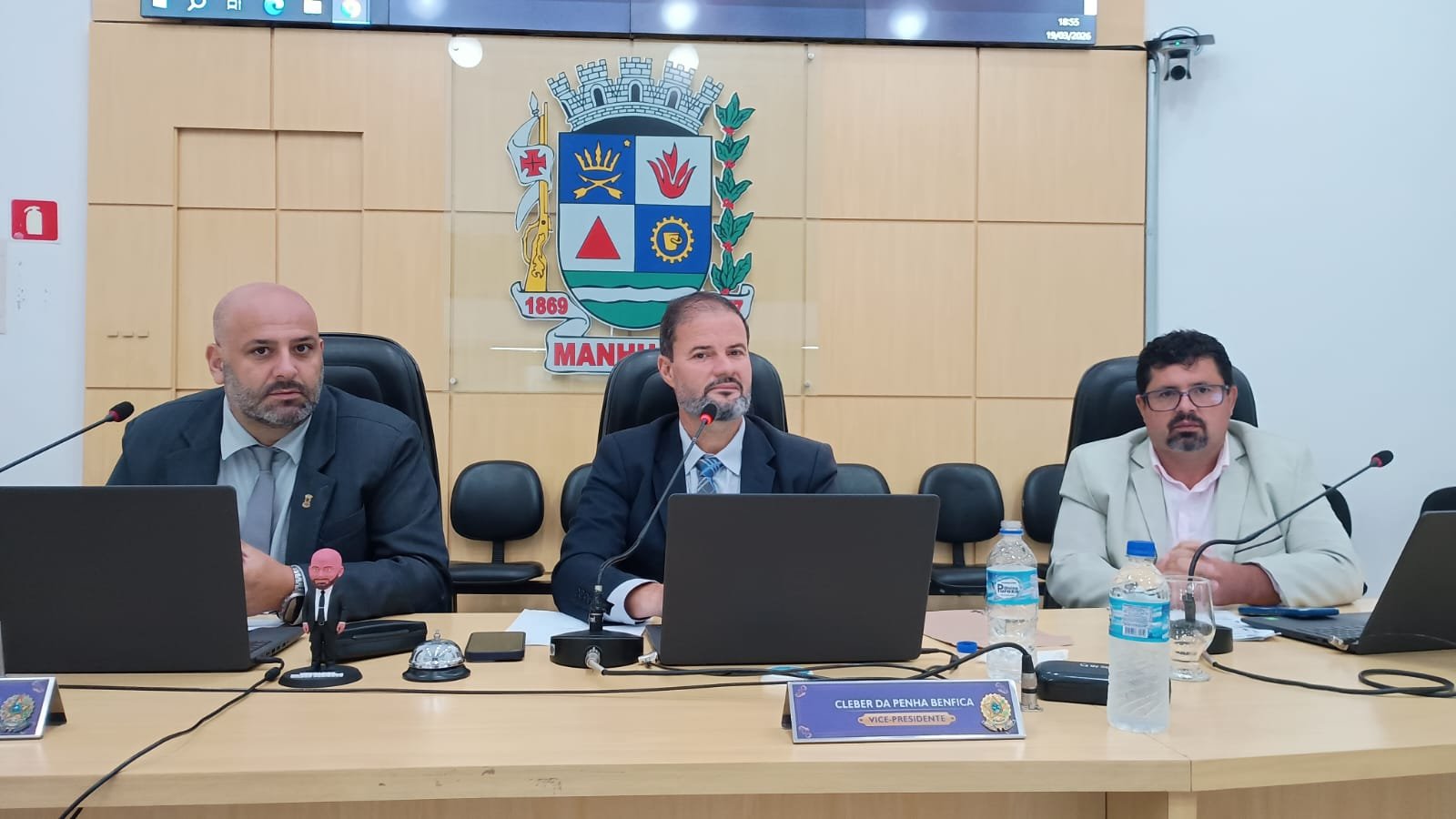 Em razão de a Presidente da Casa Legislativa, Vereadora Rose Mary, representar Manhuaçu em cerimônia do Parlamento Jovem na ALMG (Assembleia Legislativa de Minas Gerais), esta sessão foi conduzida pelo Vice-presidente, Cleber Benfica; juntamente com o 1º Secretário, Allan do Alaor, e o 2º Secretário, Kilder Perígolo.