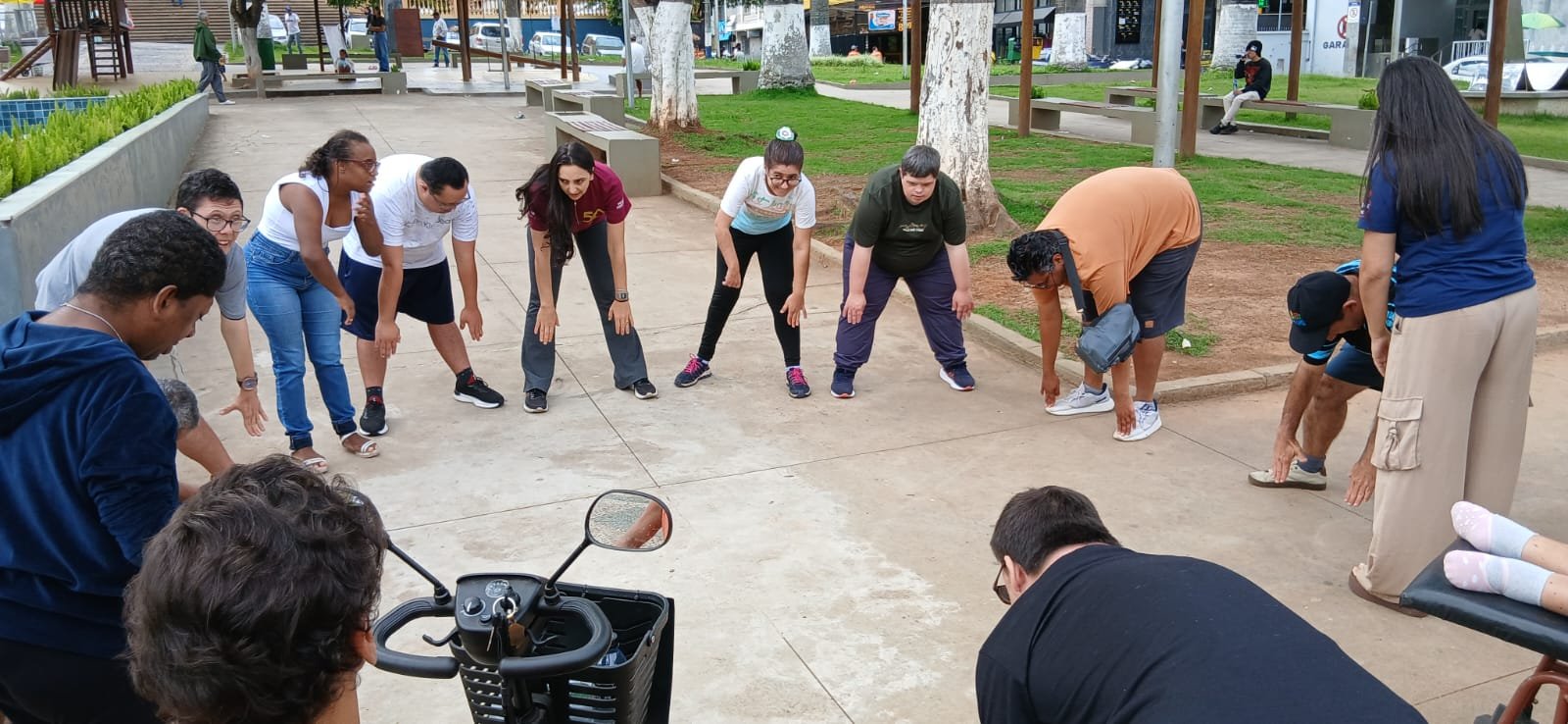 Durante a ação, foram realizadas dinâmicas em grupo e alongamento ao ar livre, promovendo integração, acolhimento e interação entre todos os participantes.