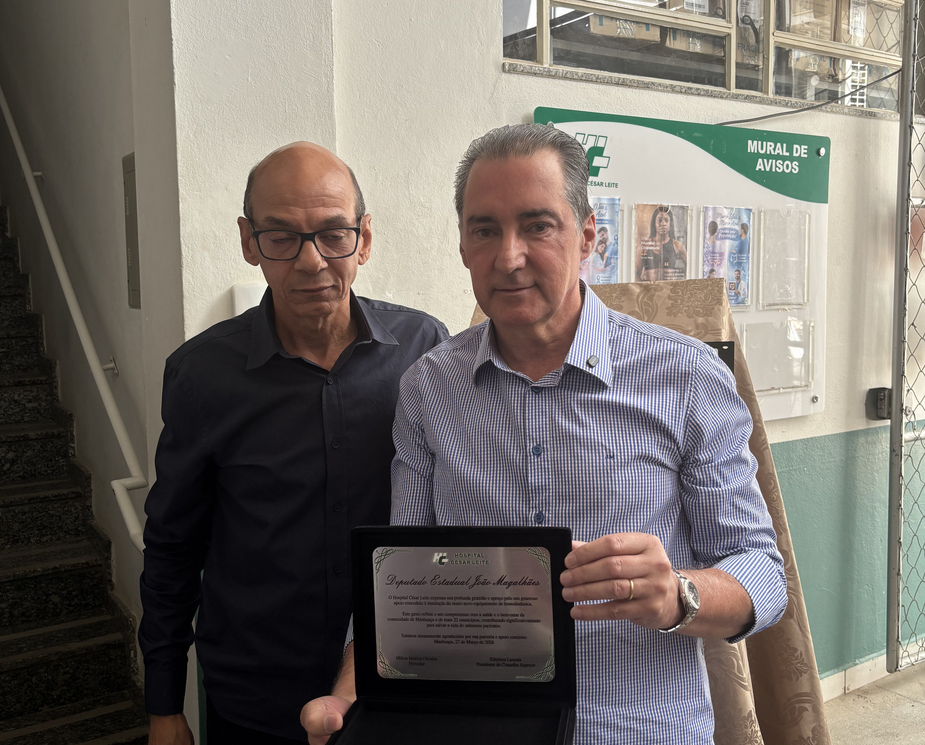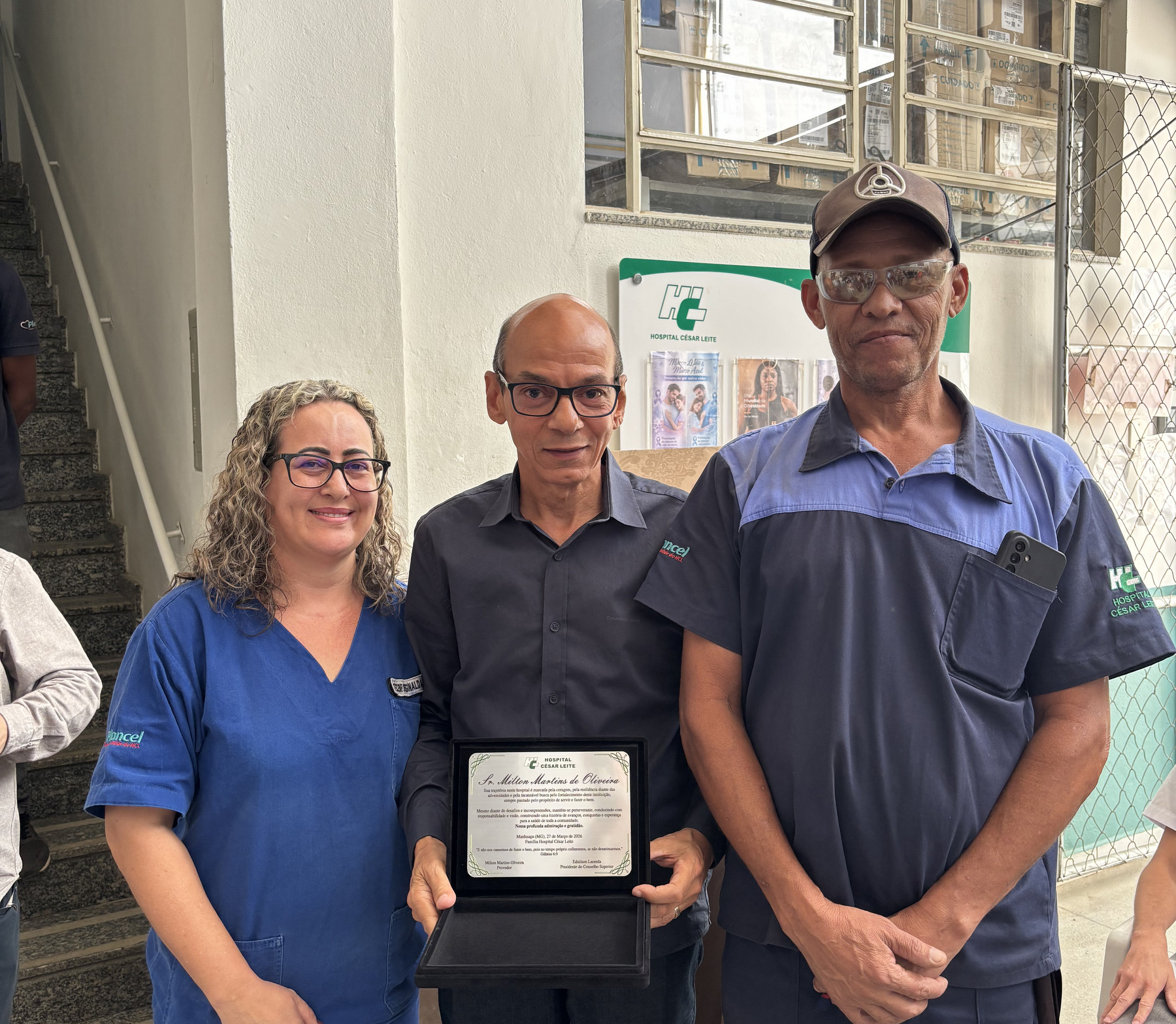Uma homenagem especial foi entregue pelos funcionários Reginalda Aparecida e Carlos Roberto ao Provedor Milton Martins em reconhecimento a sua gestão e compromisso social com a saúde.