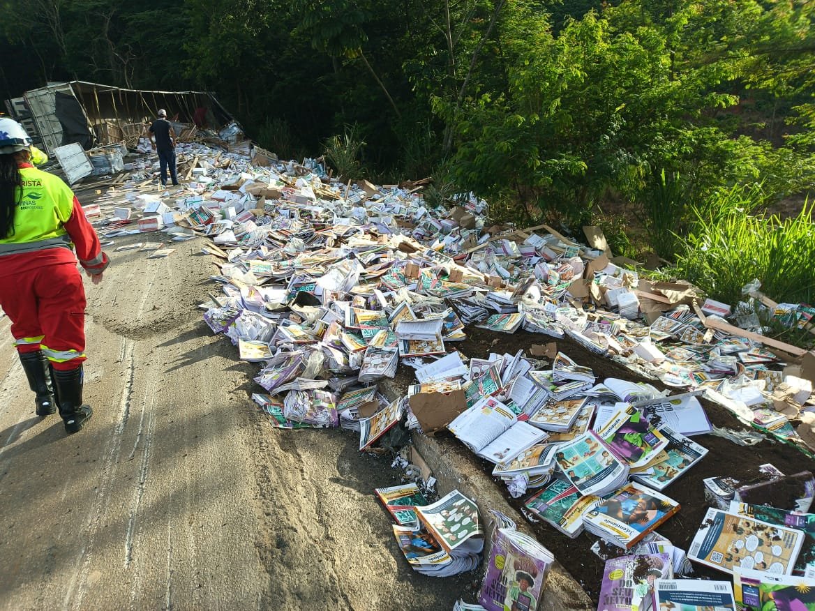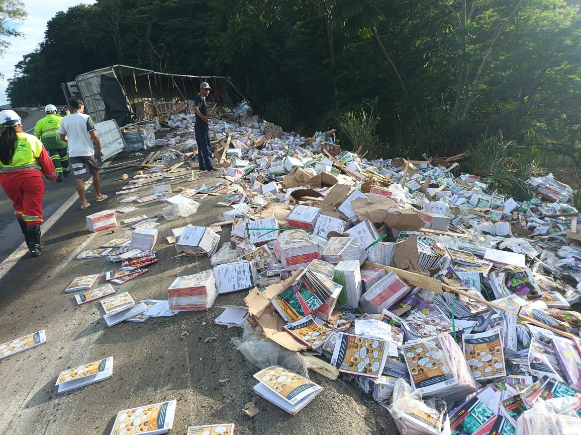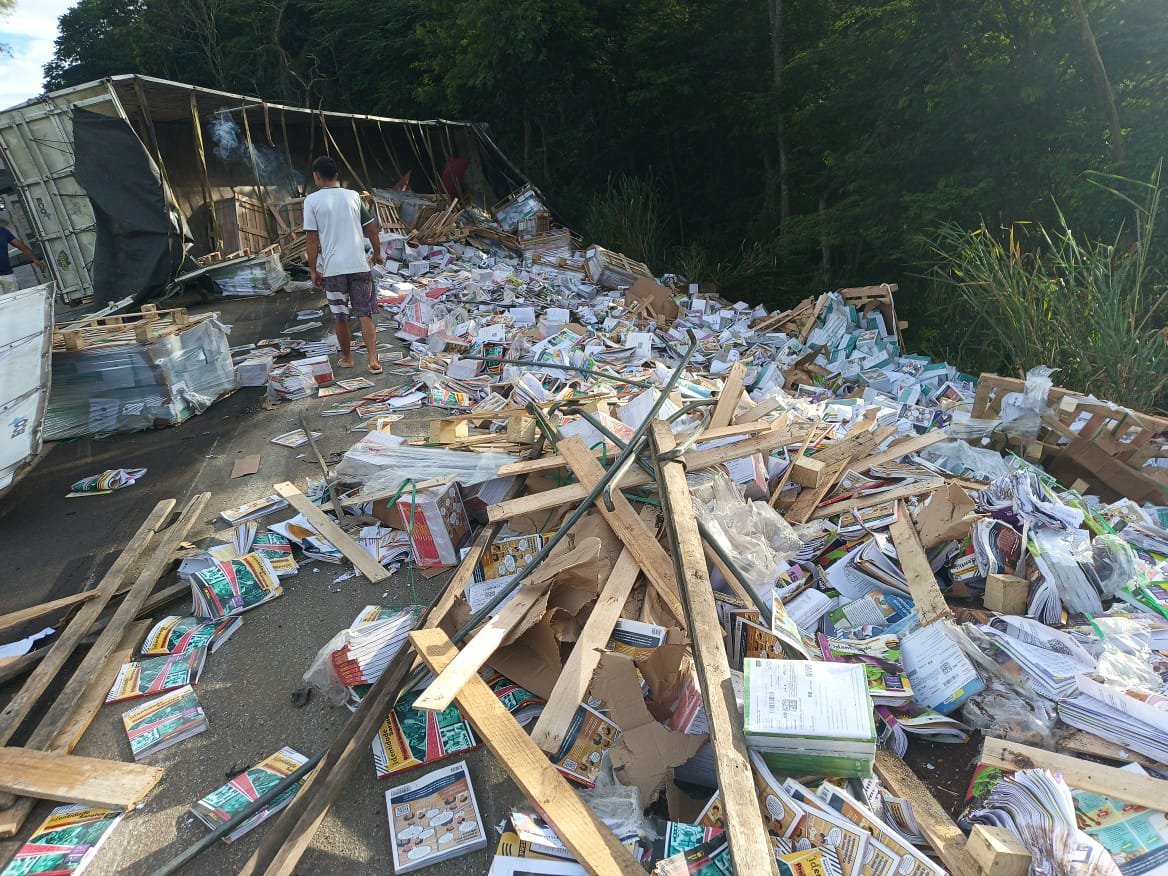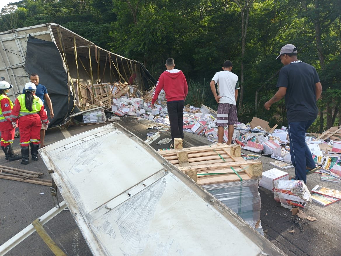 MANHUAÇU (MG) - Uma carreta carregada com livros tombou na manhã deste sábado, 04/04, na BR-116, na altura do km 557, nas proximidades de São Pedro do Avaí, distrito de Manhuaçu.