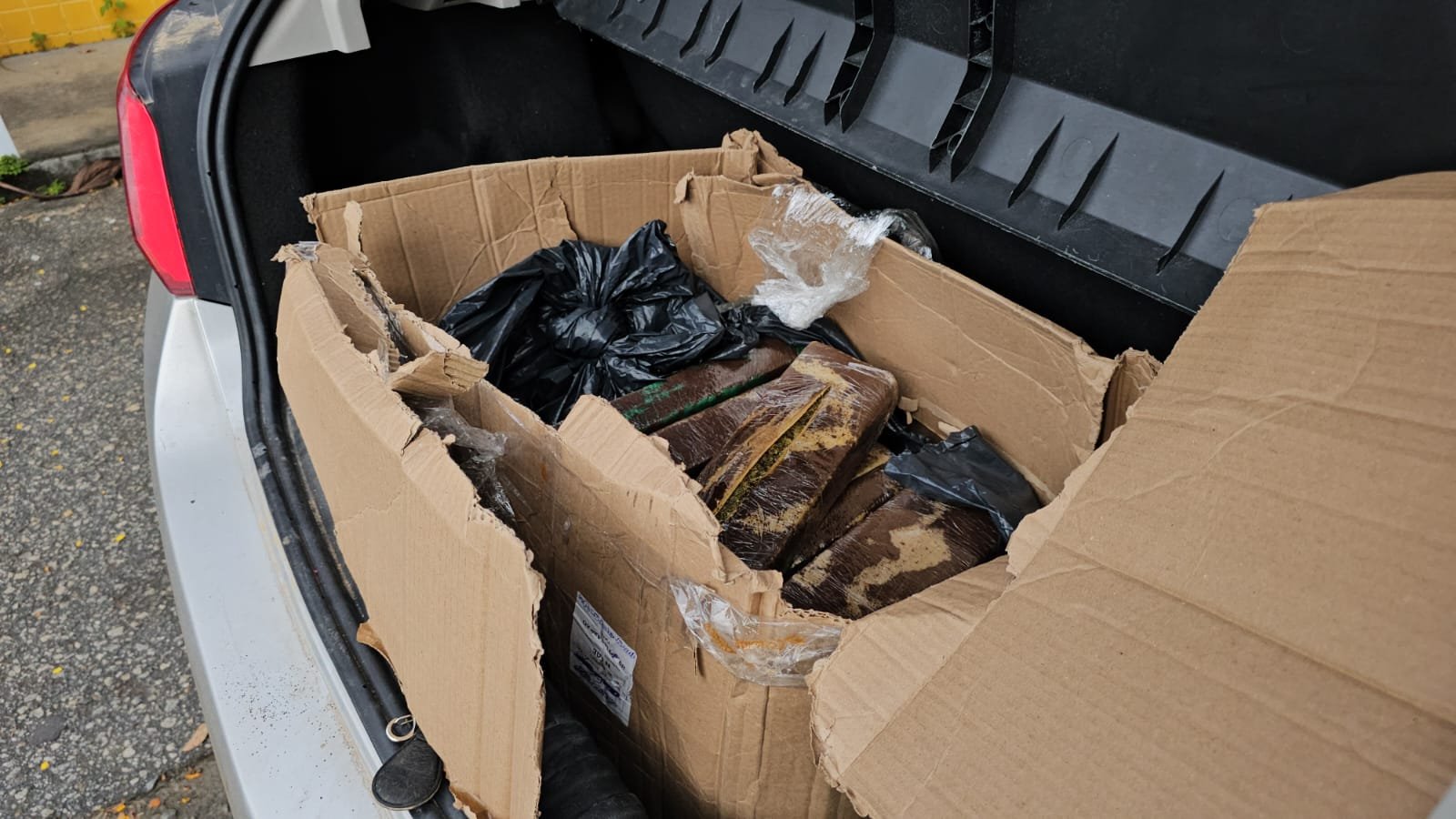 Durante a vistoria, os policiais encontraram aproximadamente 20,9 quilos de maconha, 2,2 quilos de pasta base de cocaína e 1 quilo de haxixe escondidos no interior do automóvel.