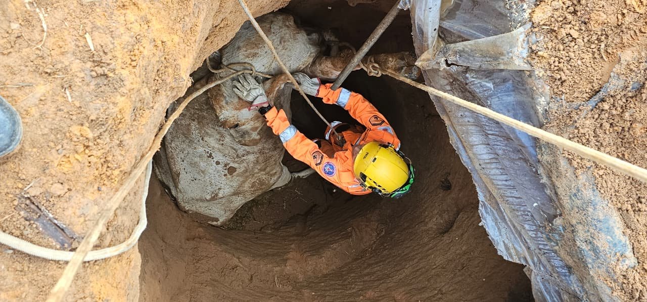 Ao chegarem ao local, os bombeiros iniciaram a operação priorizando a segurança do animal. A equipe utilizou técnicas de rapel para acessar o interior da cisterna e avaliar o estado de saúde da vaca.