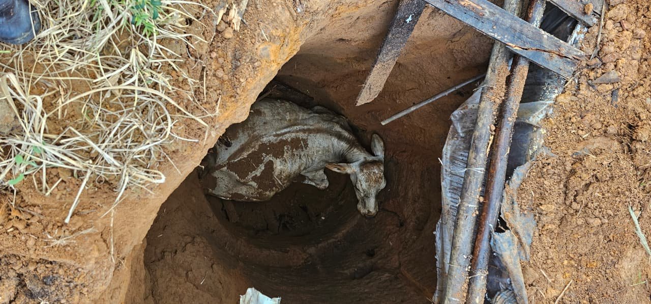 Segundo os militares, o animal caminhava pelo quintal de uma residência quando pisou sobre a tampa da cisterna, que cedeu. A vaca caiu em uma profundidade de aproximadamente três metros.