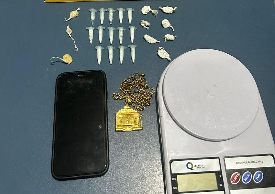 Durante as buscas, foram localizados 14 pinos e sete papelotes de cocaína, três pedras de crack, além de uma balança de precisão e um telefone celular.