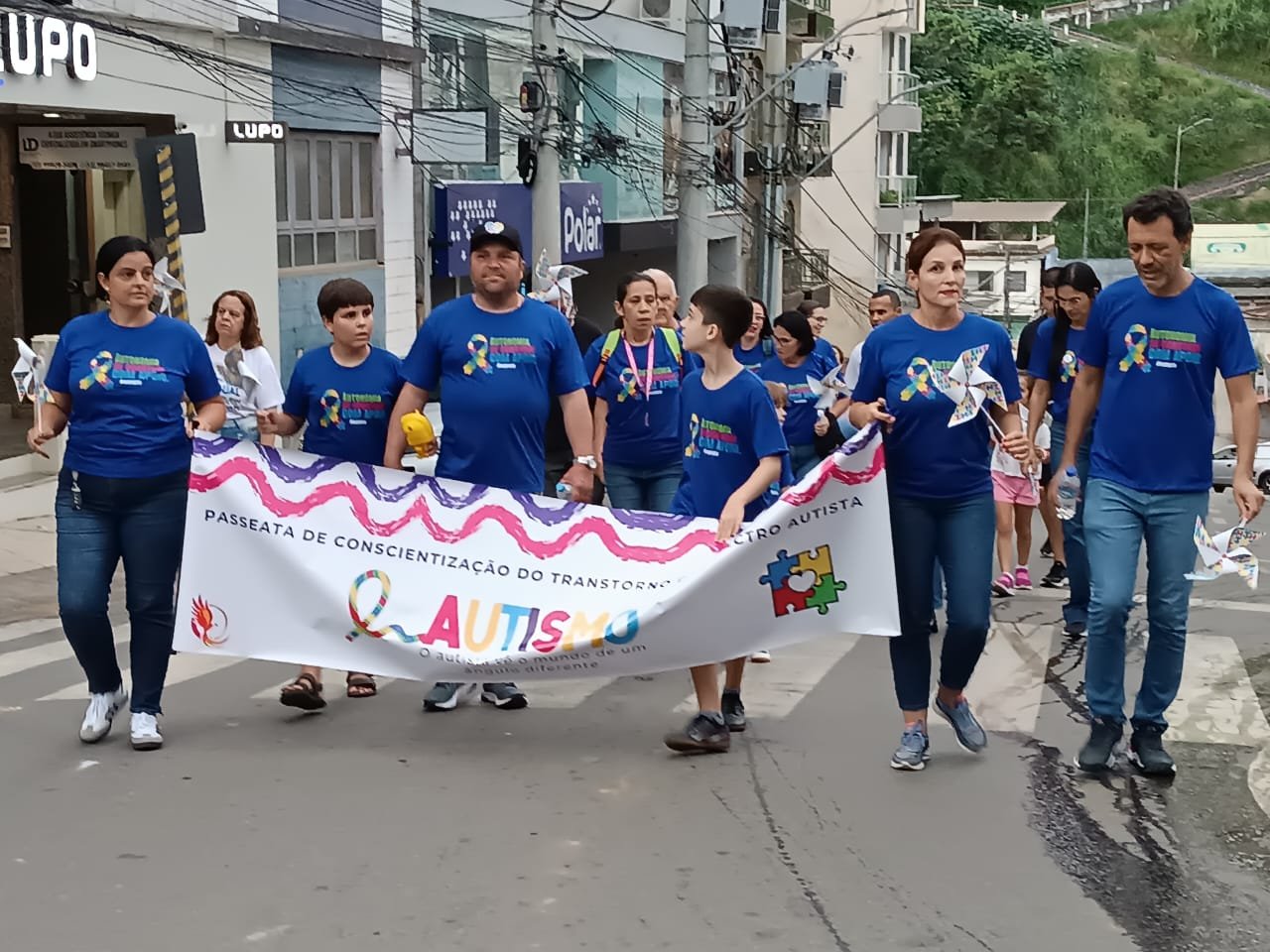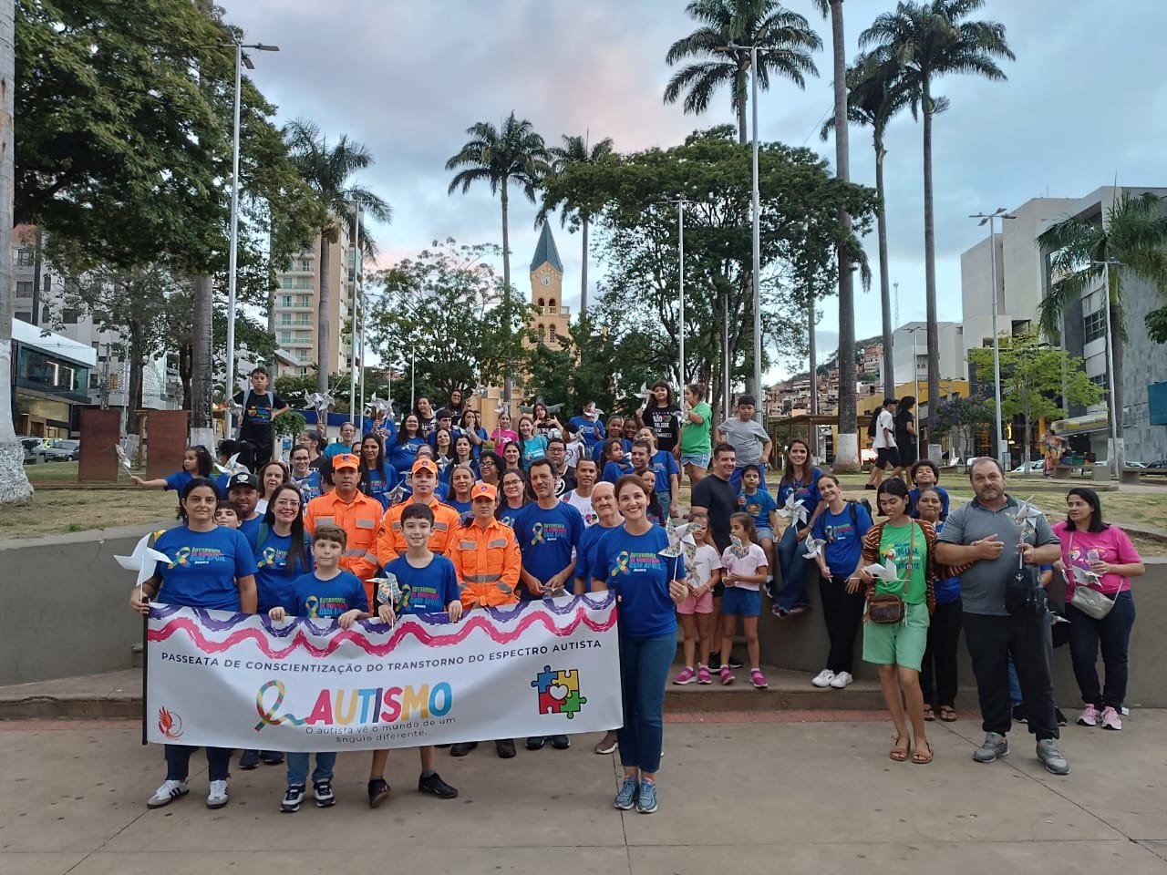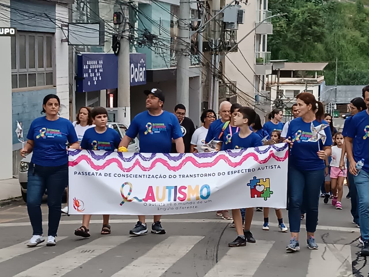 A faixa exibia a frase sobre a conscientização do Transtorno do Espectro Autista e, que o autista vê o mundo de um ângulo diferente. Na camisa dos participantes, a frase “autonomia se constrói com apoio”, além de exigir direitos e fortalecer o apoio às famílias atípicas. A cor azul visa exatamente dar mais divisibilidade à causa e chamar a atenção da sociedade, para saber acolher pessoas com autismo, promover a união, aumentar a conscientização e informação sobre o TEA, além de espaços inclusivos e fortalecimento de politicas públicas, voltadas às pessoas com TEA.