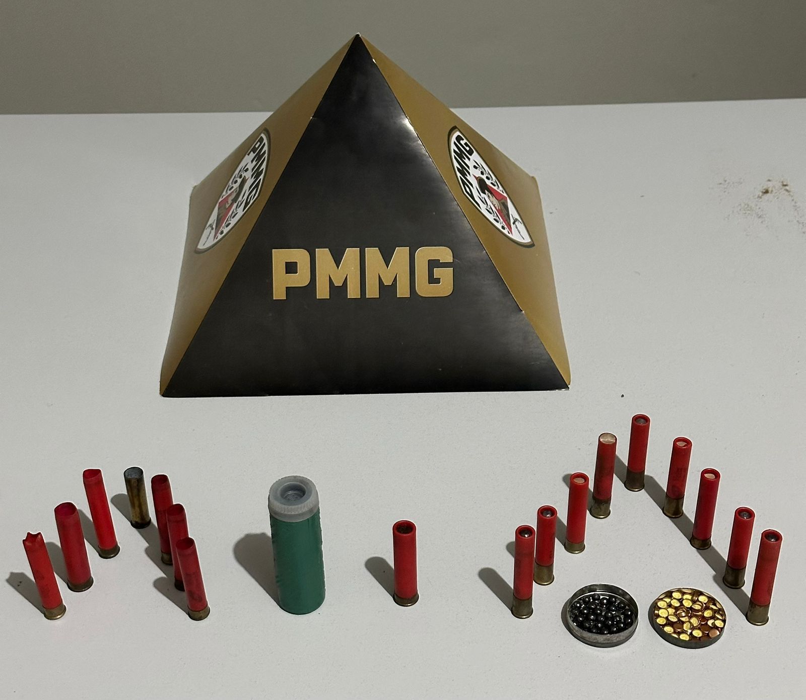 Durante diligências na casa, os militares localizaram e apreenderam nove munições calibre .36 intactas, uma munição calibre .32 intacta, seis cartuchos calibre .36 deflagrados, um cartucho calibre .32 deflagrado, 32 esferas de chumbo, 55 espoletas para recarga e um recipiente contendo pólvora.