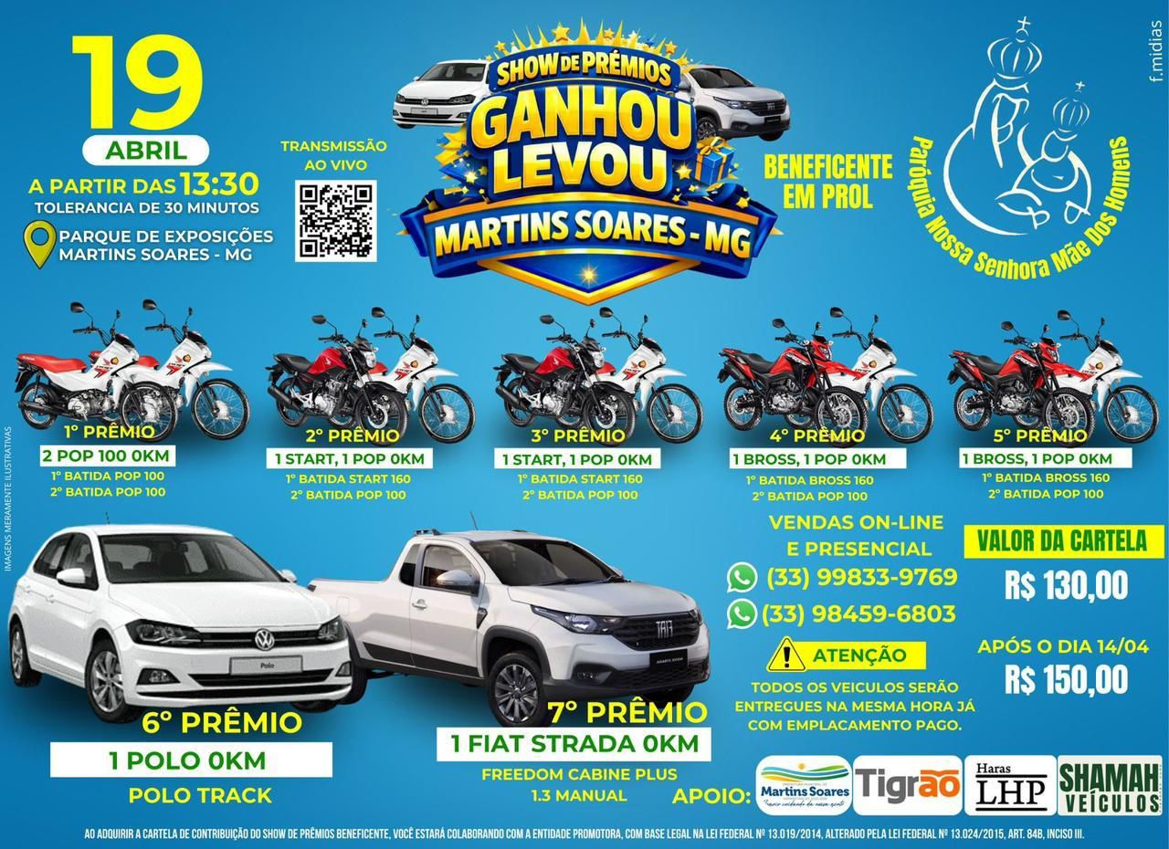 Entre os destaques estão as motos modelos como Start, Bros e Pop nos cinco primeiros sorteios com duas batidas. Já os prêmios de maior valor incluem um Volkswagen Polo Track 0km e uma Fiat Strada Freedom cabine dupla.